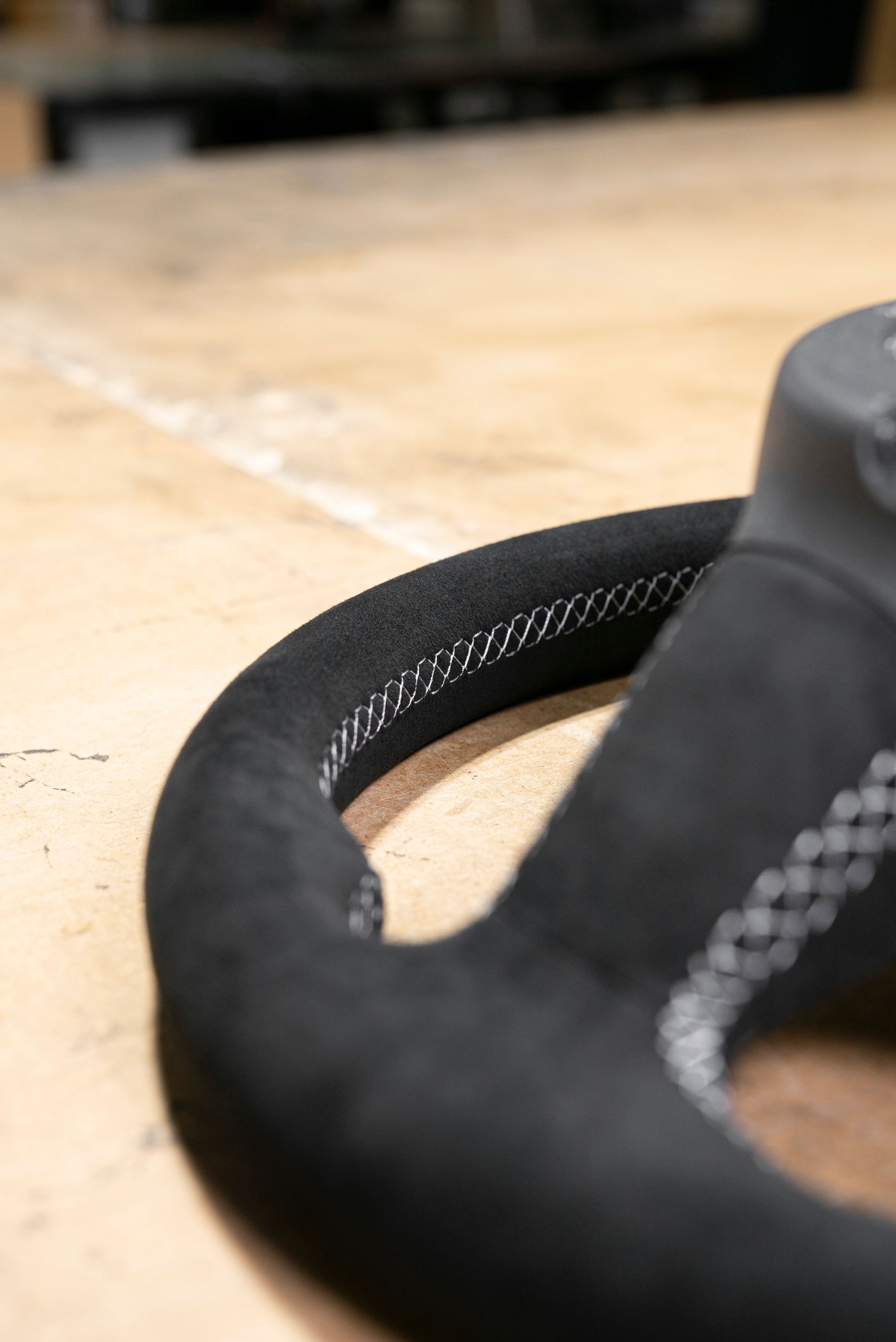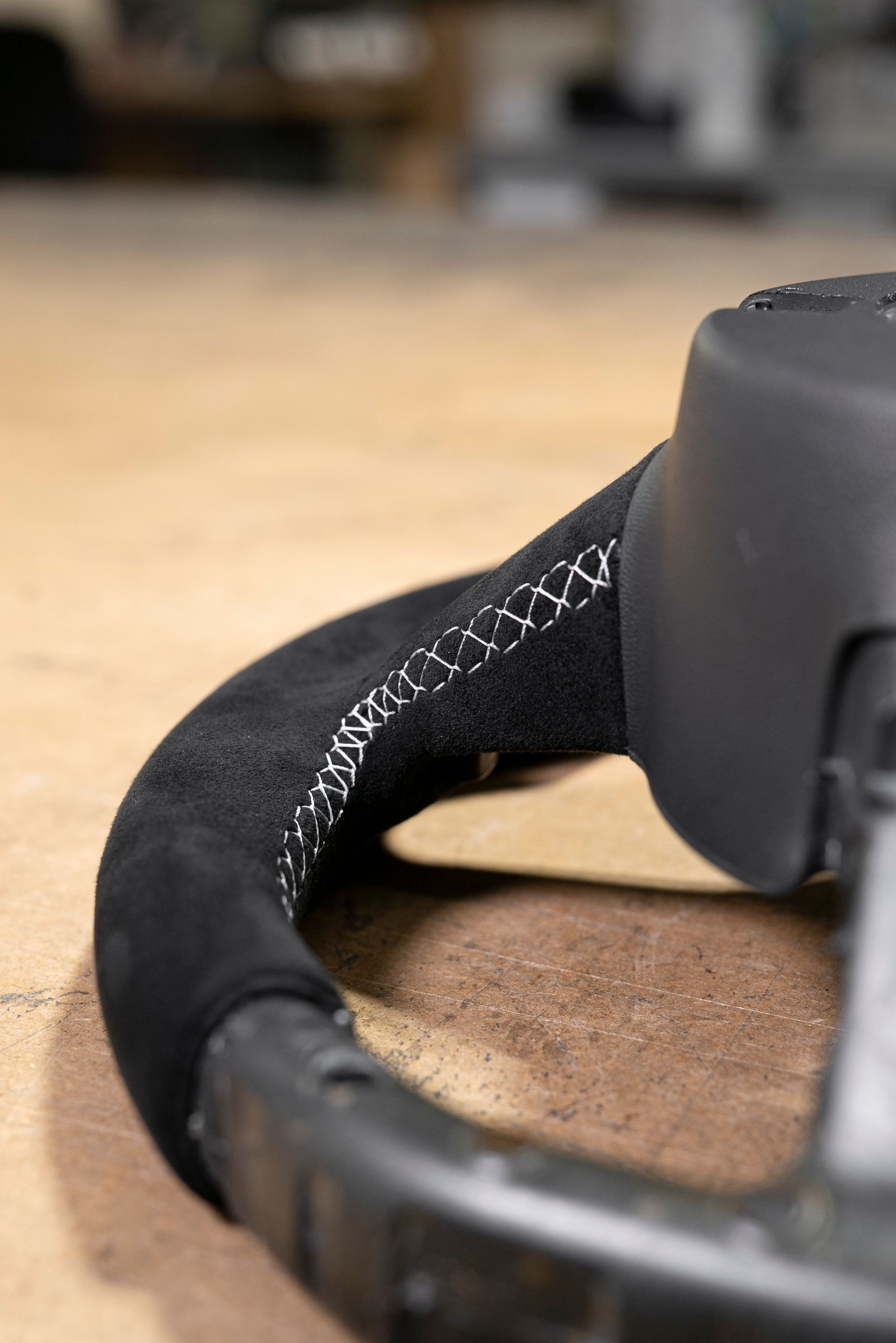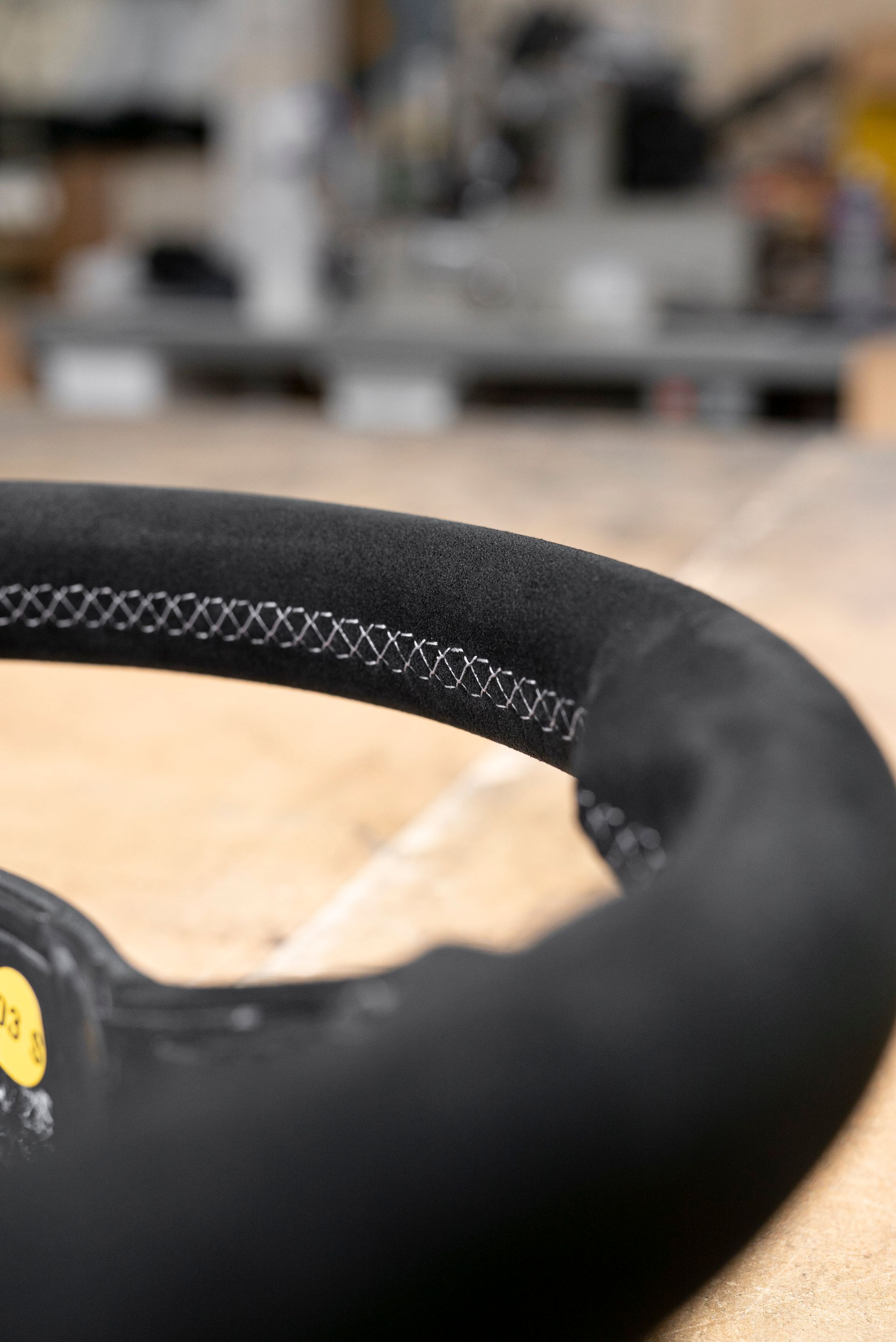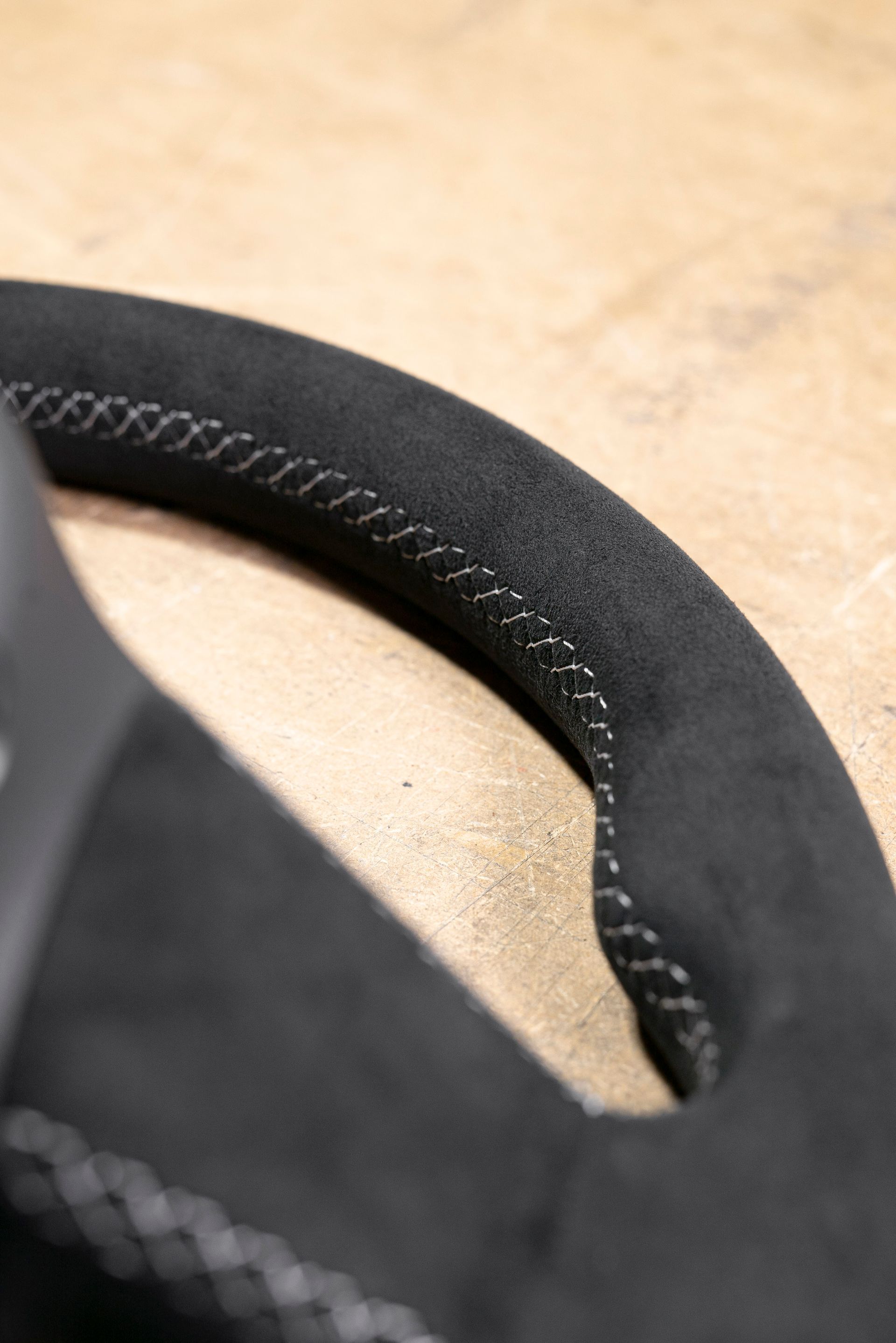 The steering wheel was in a bad way; being suede from the factory, this material does not age well, especially on highly used areas of a car (door handles, steering wheels, gear knobs). Our customer requested to retrim the wheel with Alcantara for a more modern look, with light grey stitching, a change from the OEM black.