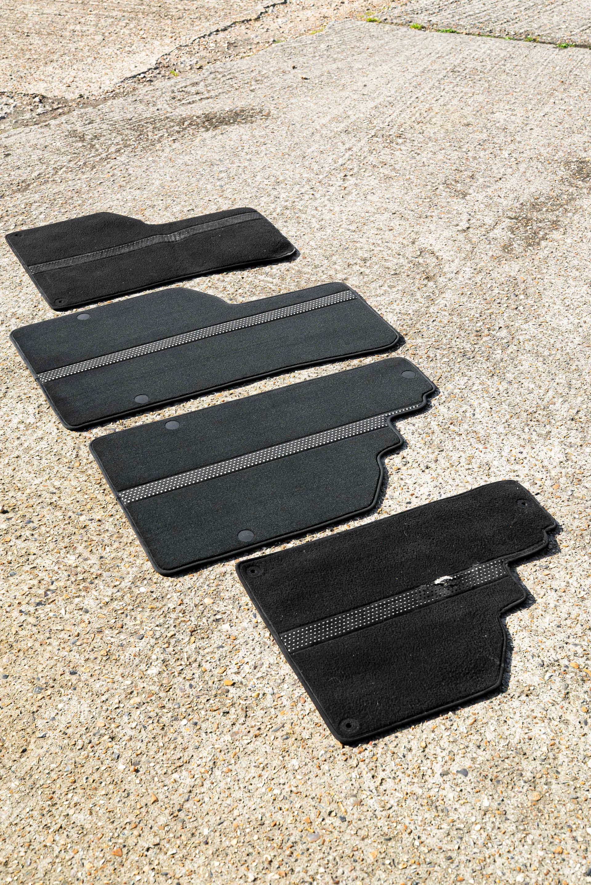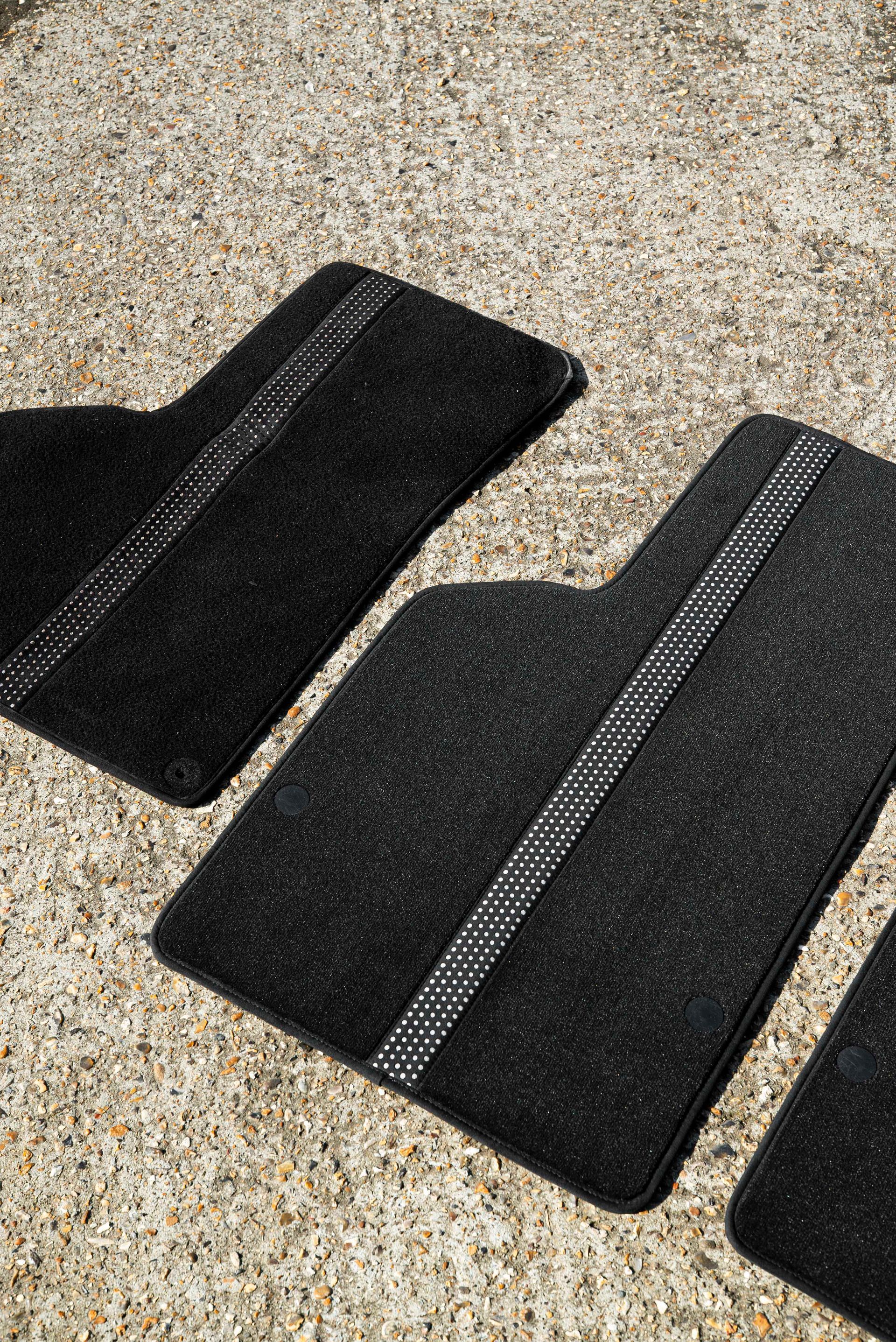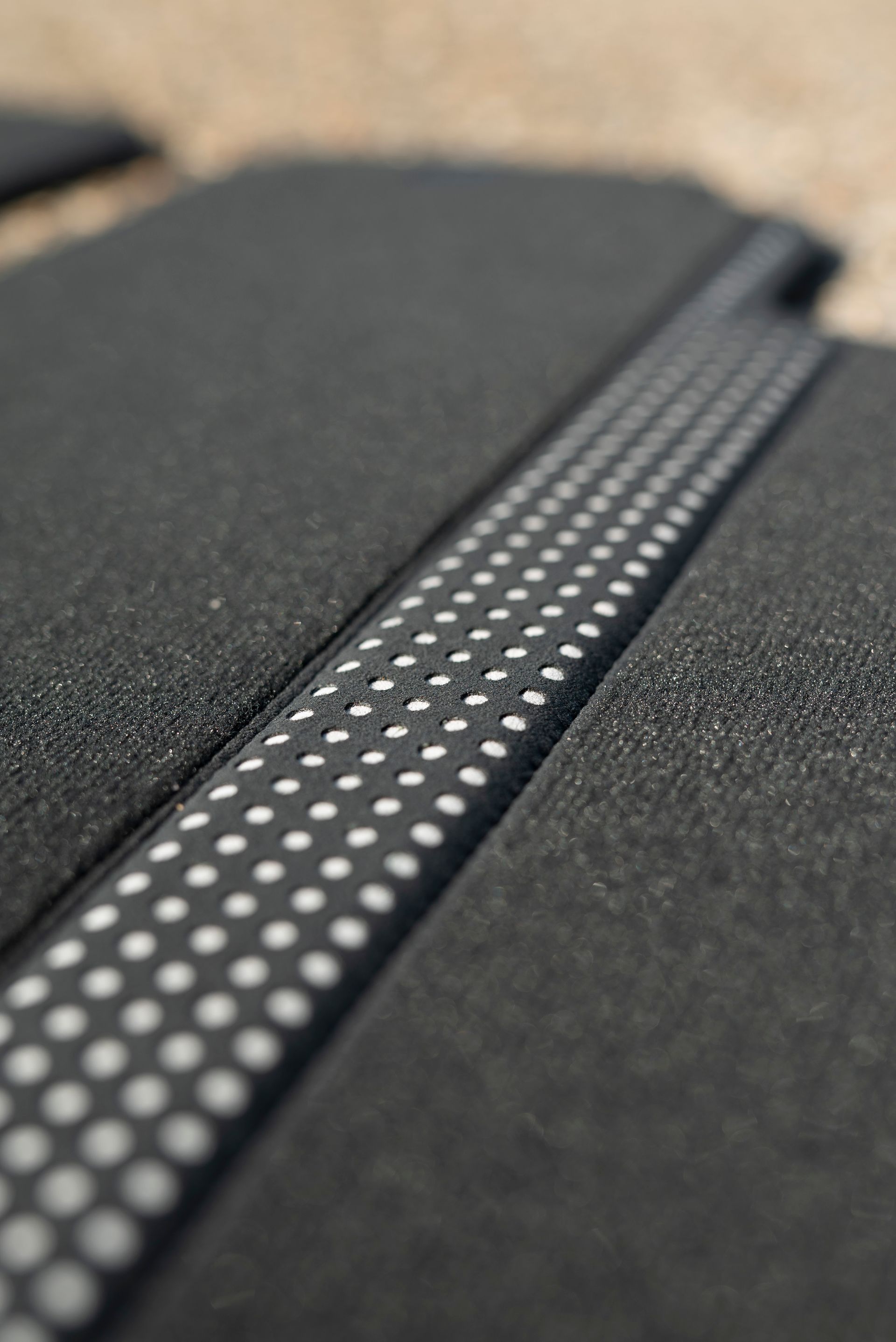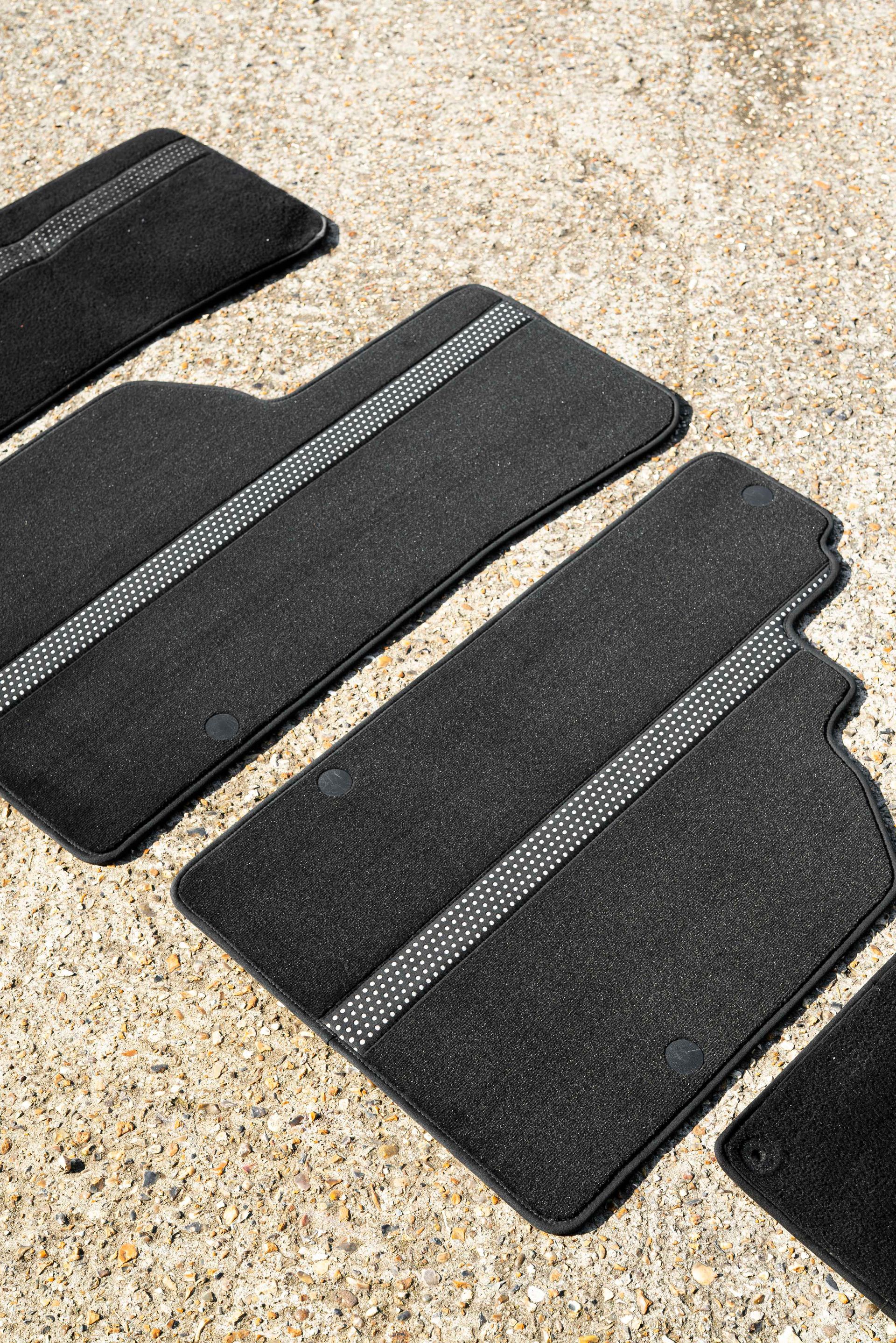 The floor mats were badly worn due to a poor design choice from Lamborghini by putting a fragile piece of perforated Alcantara where your heel rests. This is not the smartest of decisions, and after some years of use, the Alcantara has unsurprisingly split. This pattern has been recreated and laser cut, backed with grey cloth, added to a new piece of black carpet, and binded with some matching dark grey Alcantara. Lastly, the mats have been extended, as from factory they fall short and do not reach underneath the seats, a really smart upgrade.