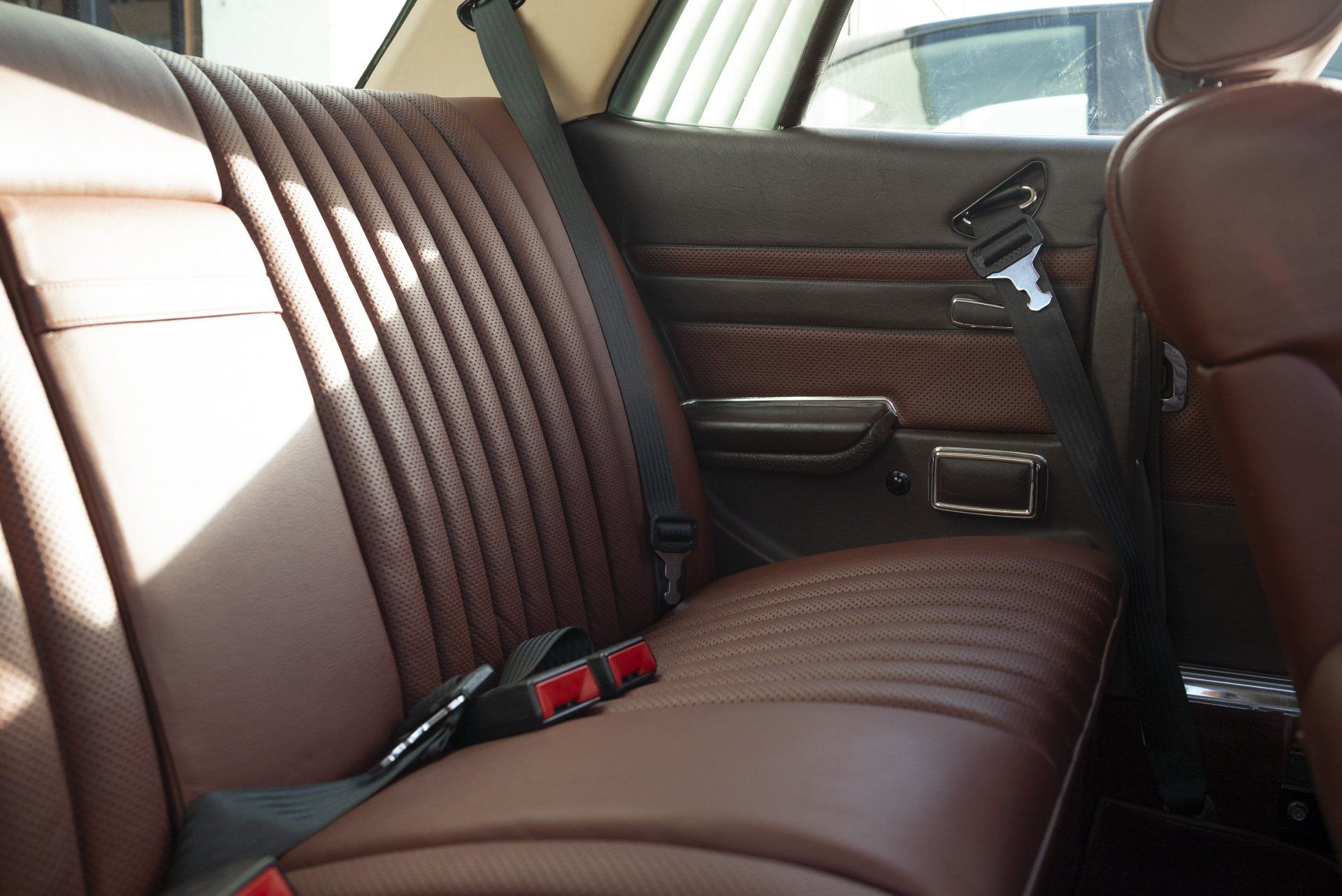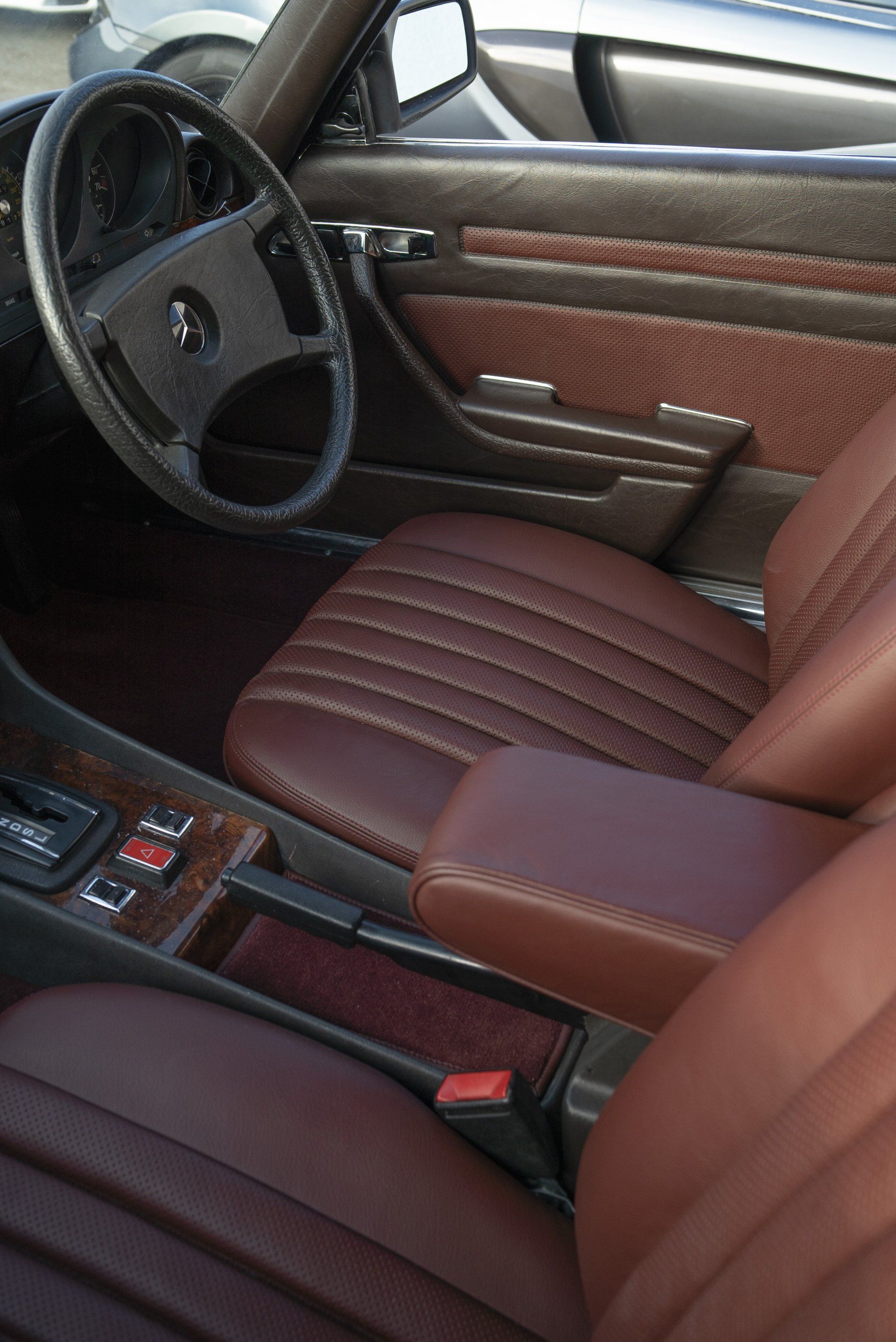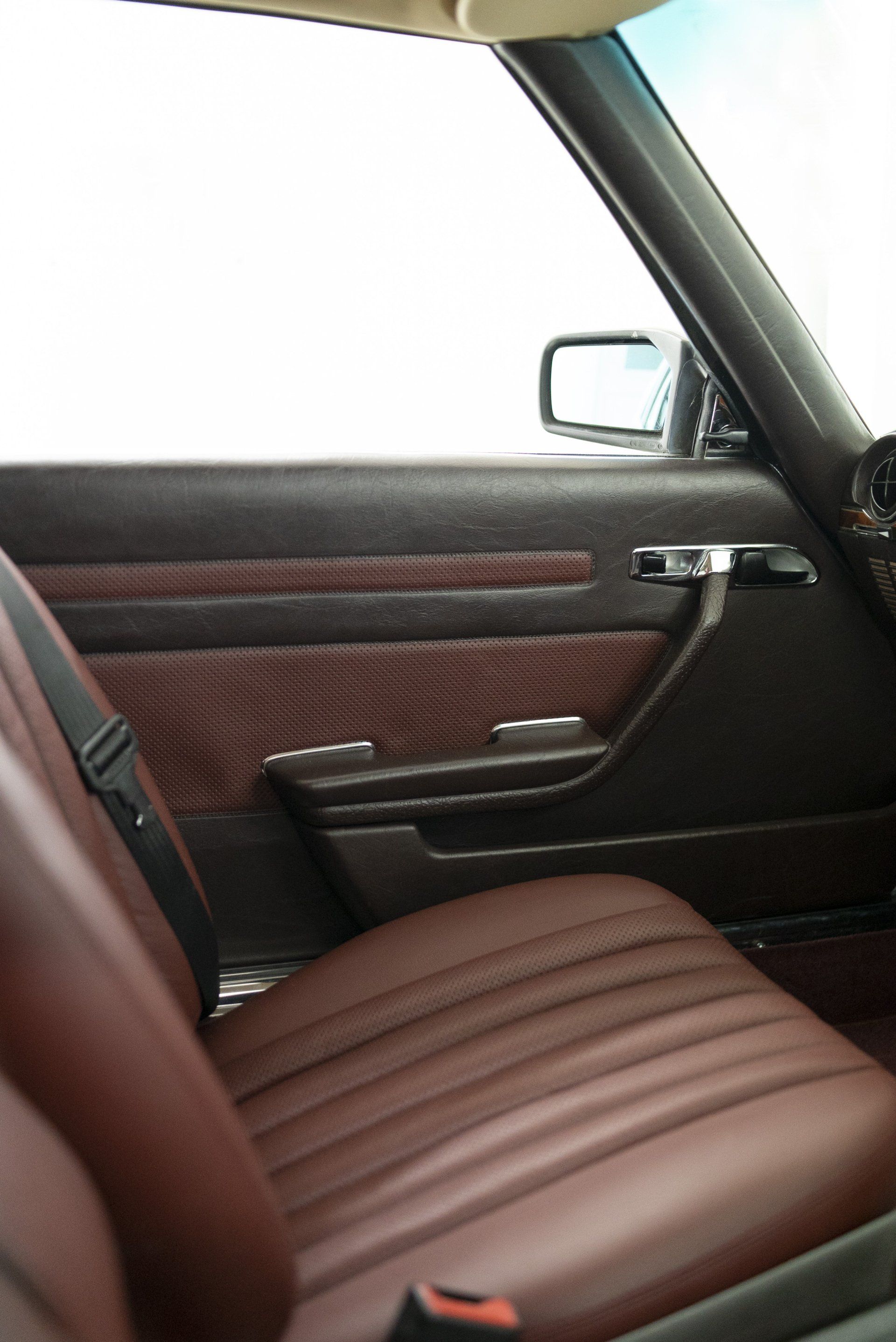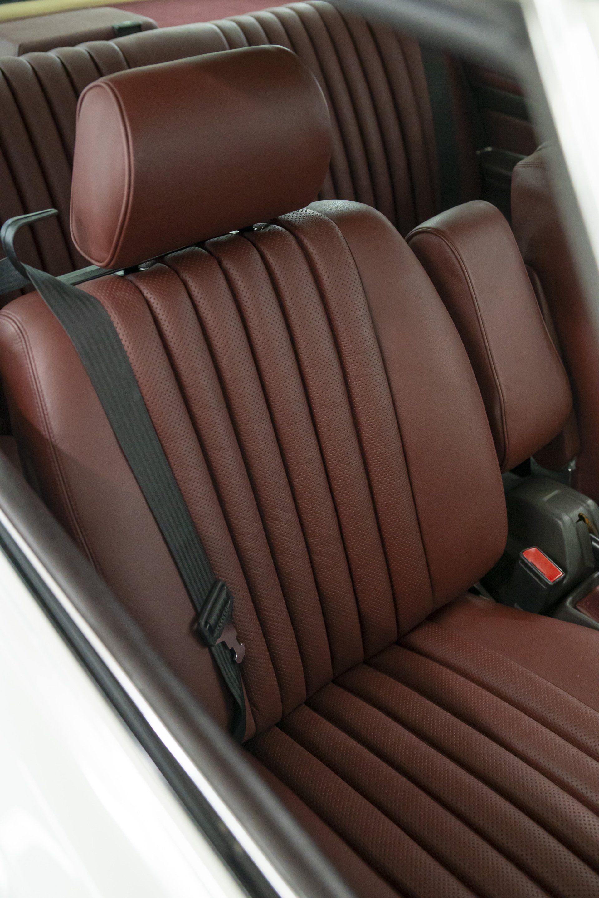 Mercedes C107 SLC in for a partial retrim. We have retrimmed the front seats, rear seats, carpets, over mats, front door cards, rear door cards and arm rests. The brown MB tex and cloth seats have been retrimmed in a lovely middle red leather with diamond perforated centres. Part of the door cards replaced with the same perforated leather. The brown carpet has been swapped out for a dark red wilton to match the now two tone interior.