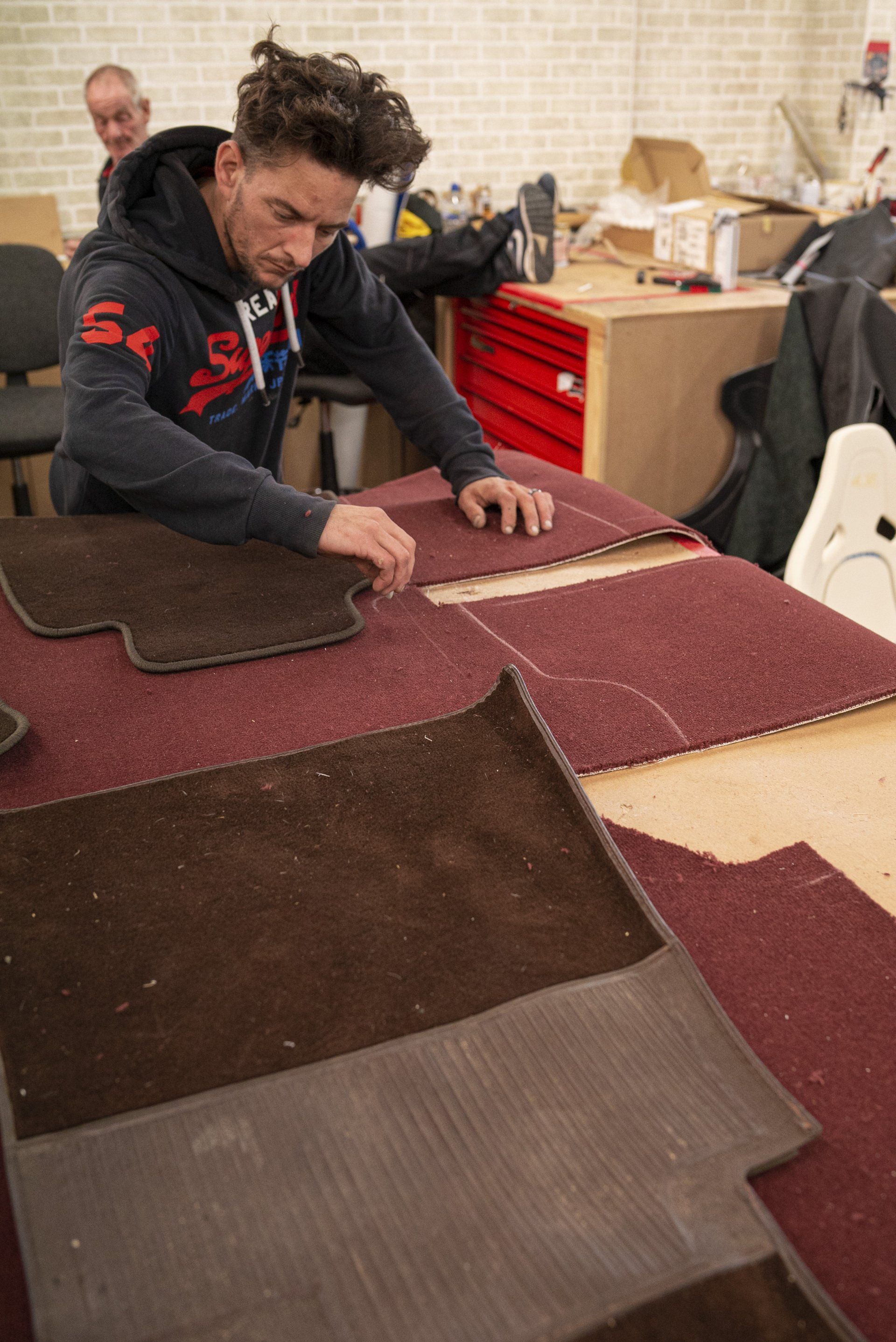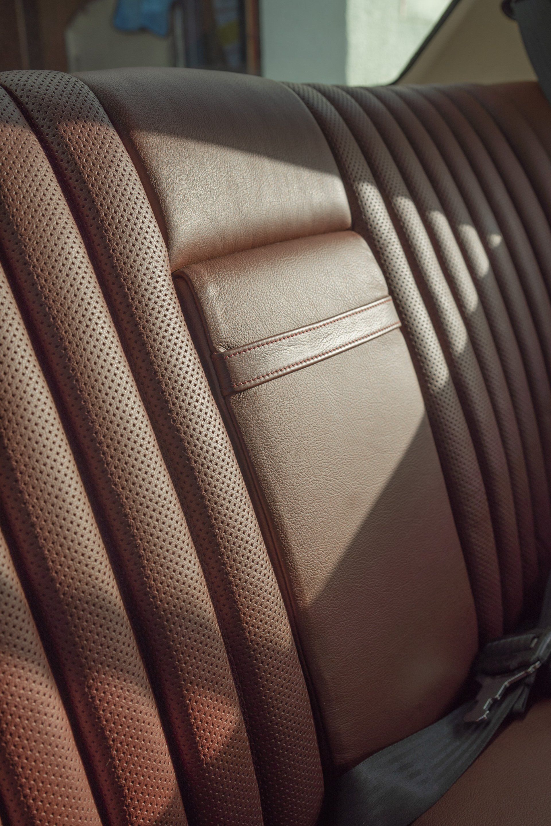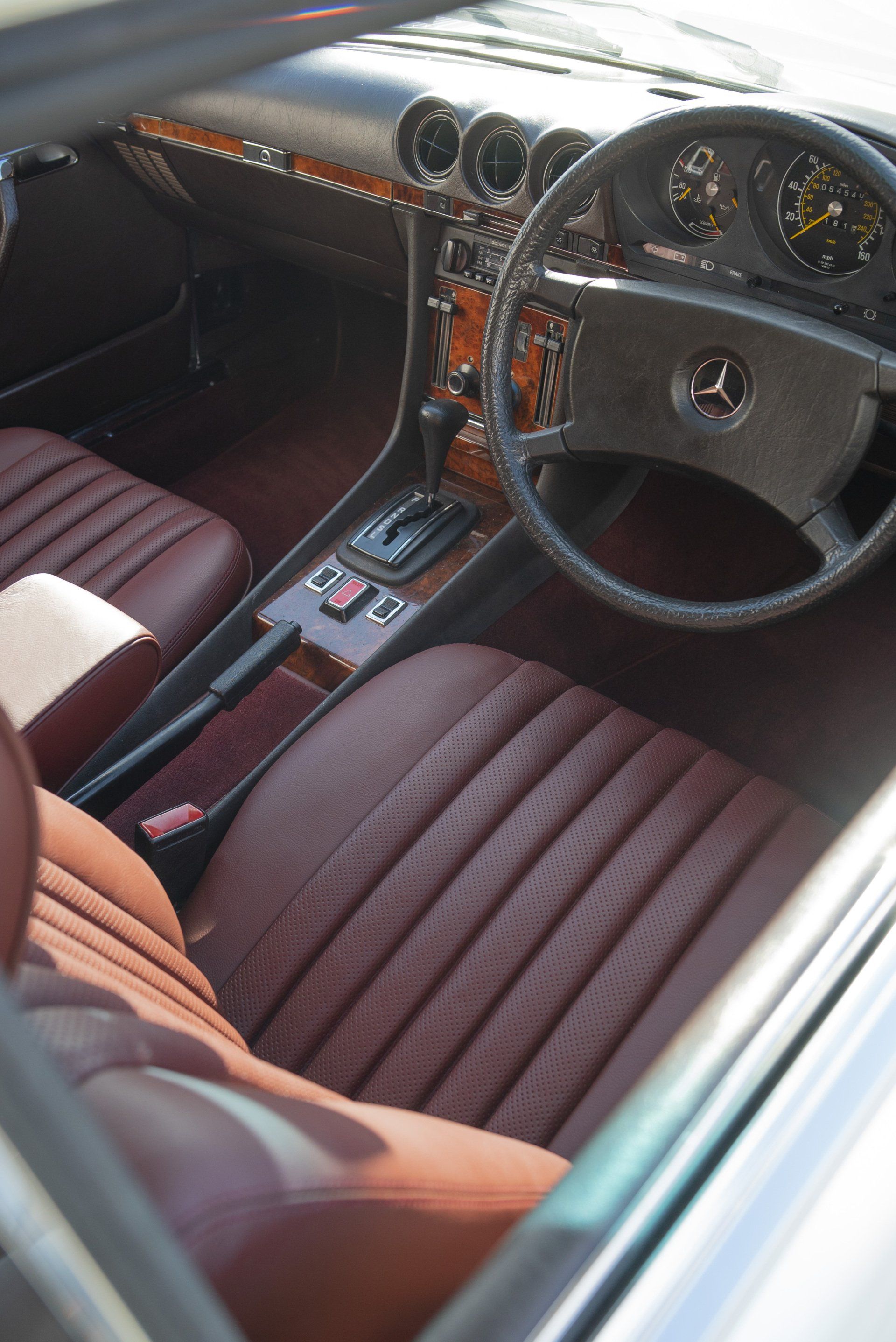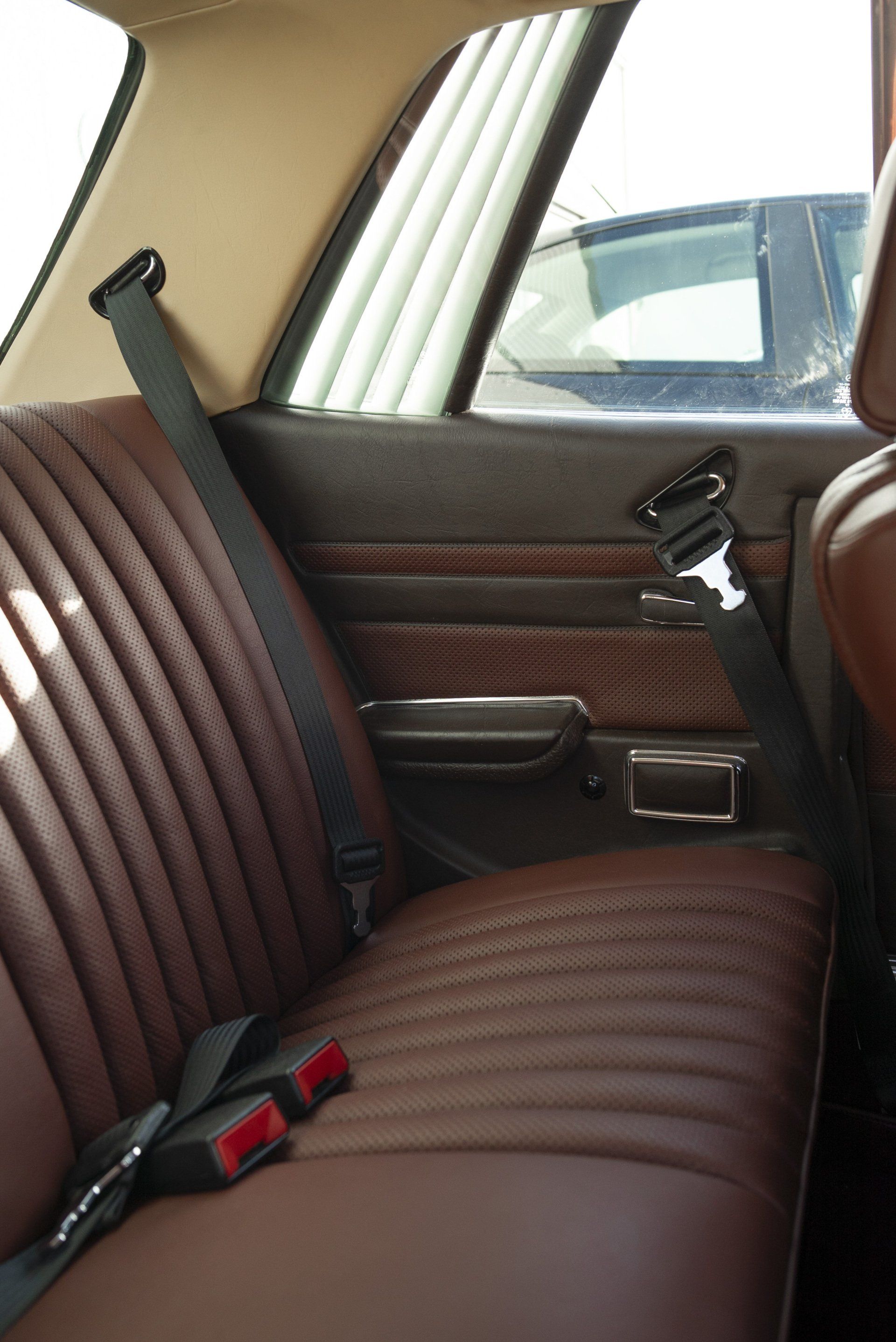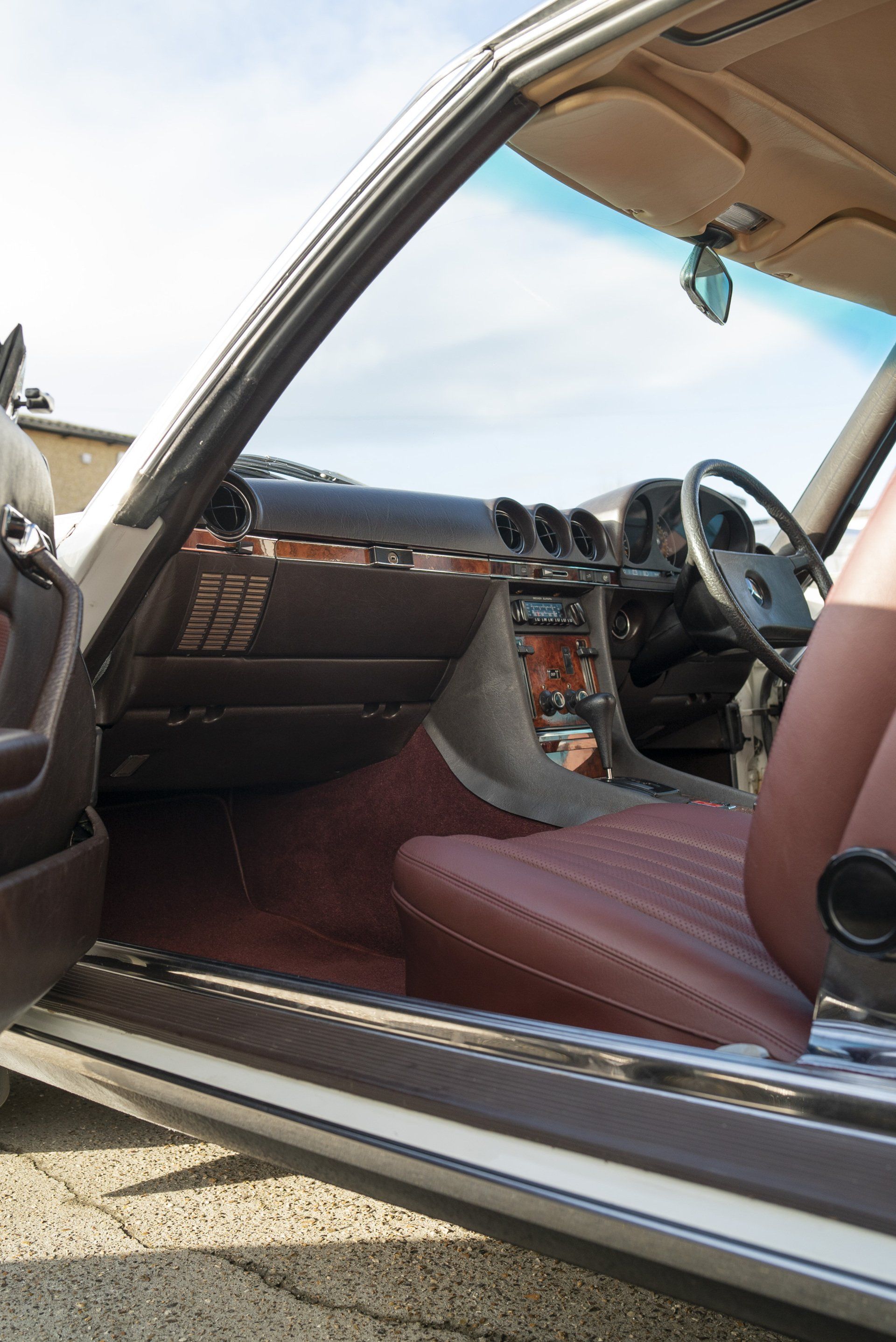 Mercedes C107 SLC in for a partial retrim. We have retrimmed the front seats, rear seats, carpets, over mats, front door cards, rear door cards and arm rests. The brown MB tex and cloth seats have been retrimmed in a lovely middle red leather with diamond perforated centres. Part of the door cards replaced with the same perforated leather. The brown carpet has been swapped out for a dark red wilton to match the now two tone interior.
