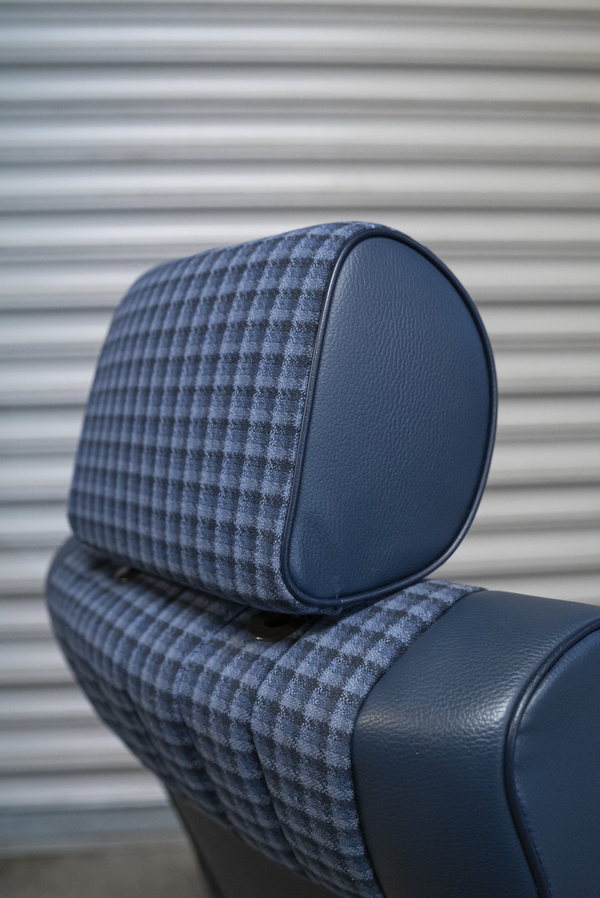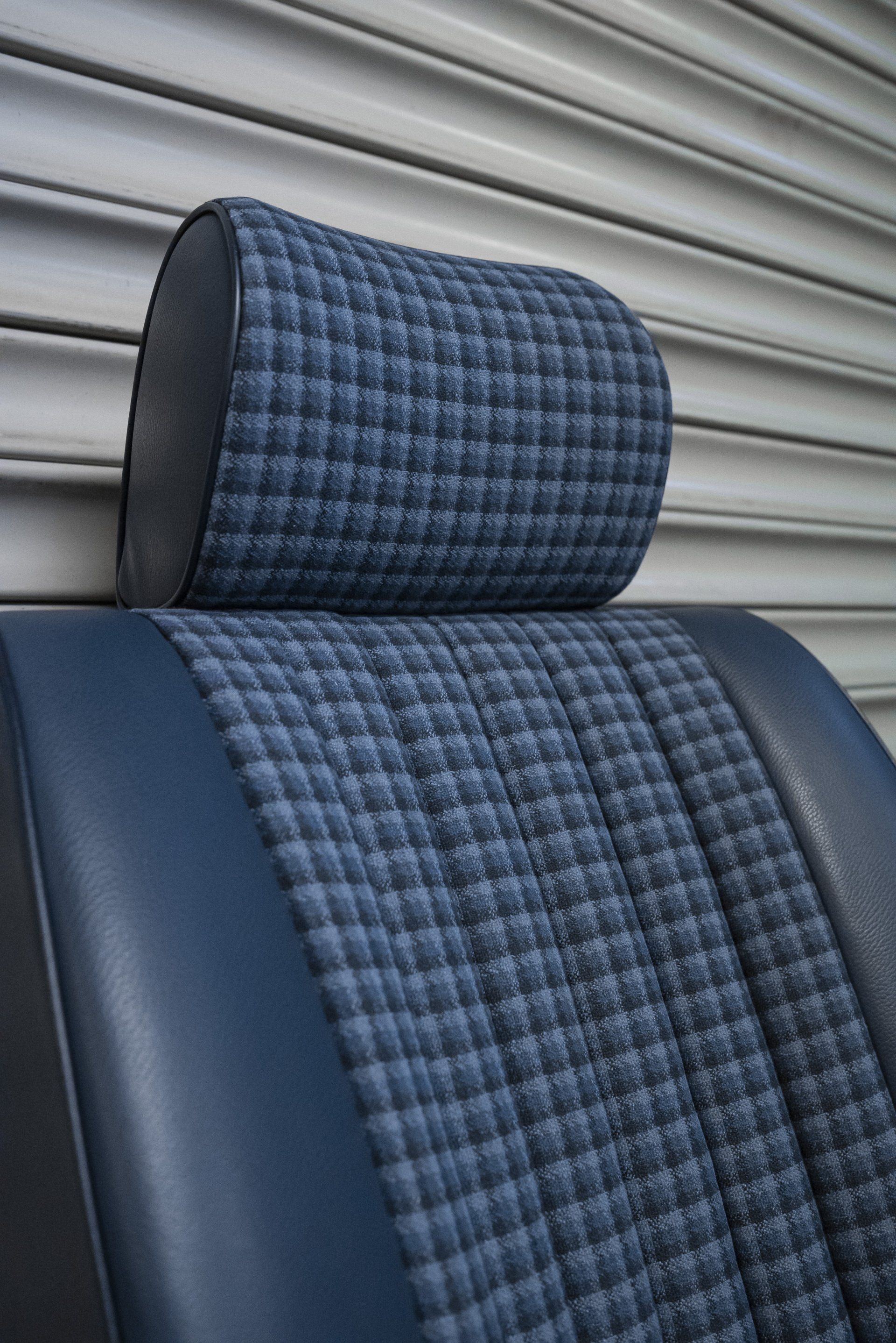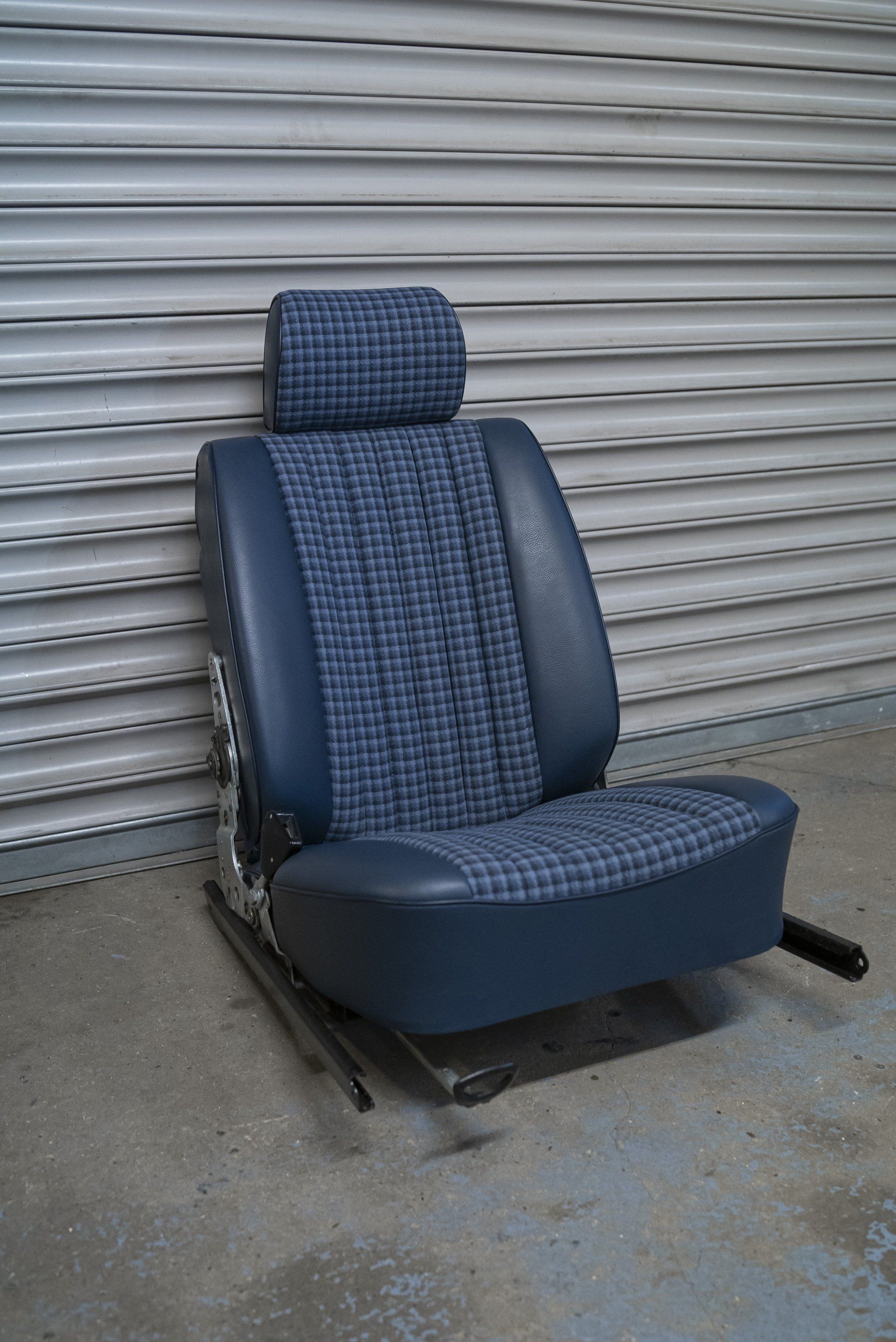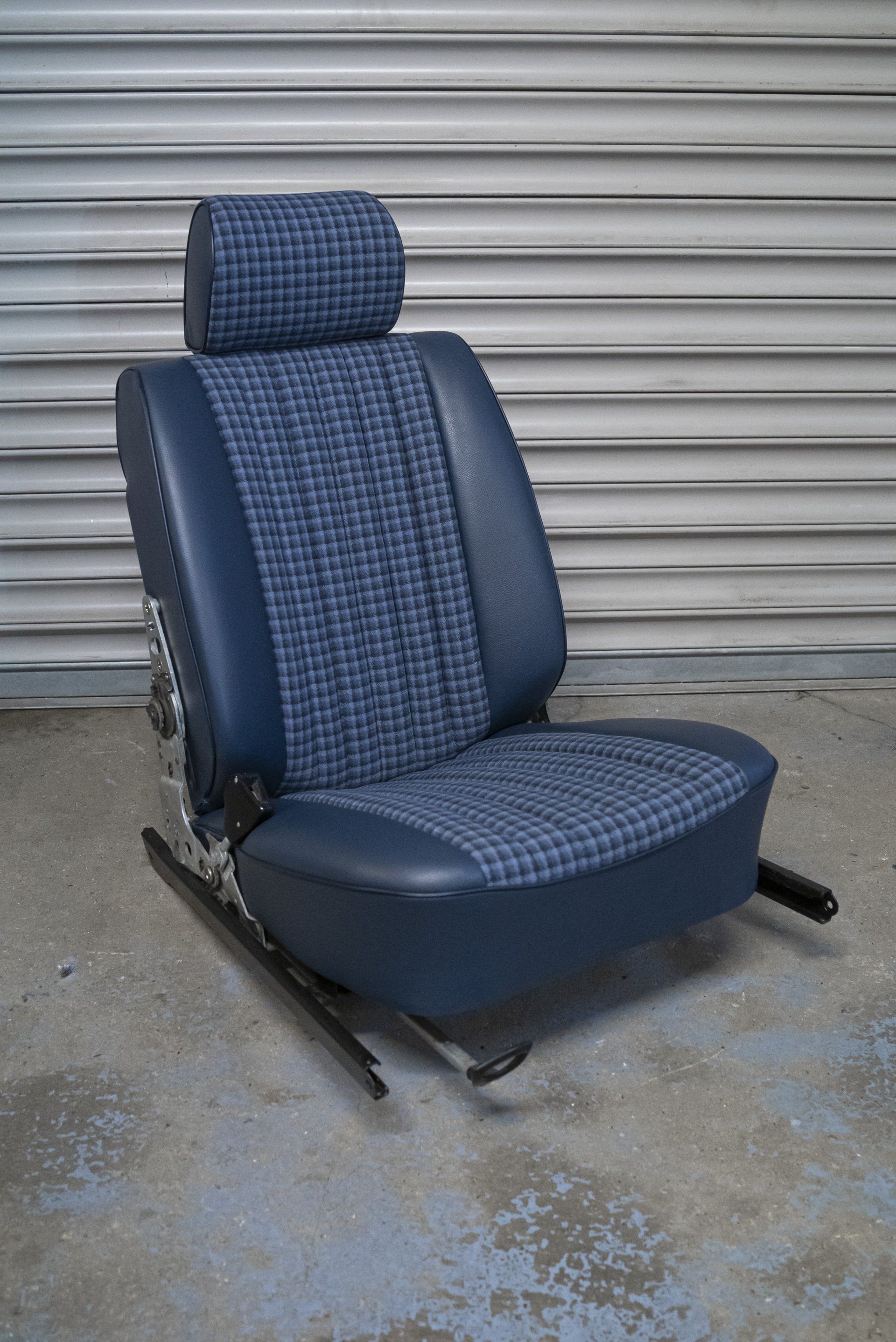 A set of Mercedes-Benz R107 seats and door cards. As you can see by the photographs these seats were in desperate need of a retrim. Mismatching vinyl, collapsed seat foams, rusty seat frames and warped door cards are some of the reasons why this vehicle received some d:class treatment. Blue Karo sports check supplied by @dclassautoshop.