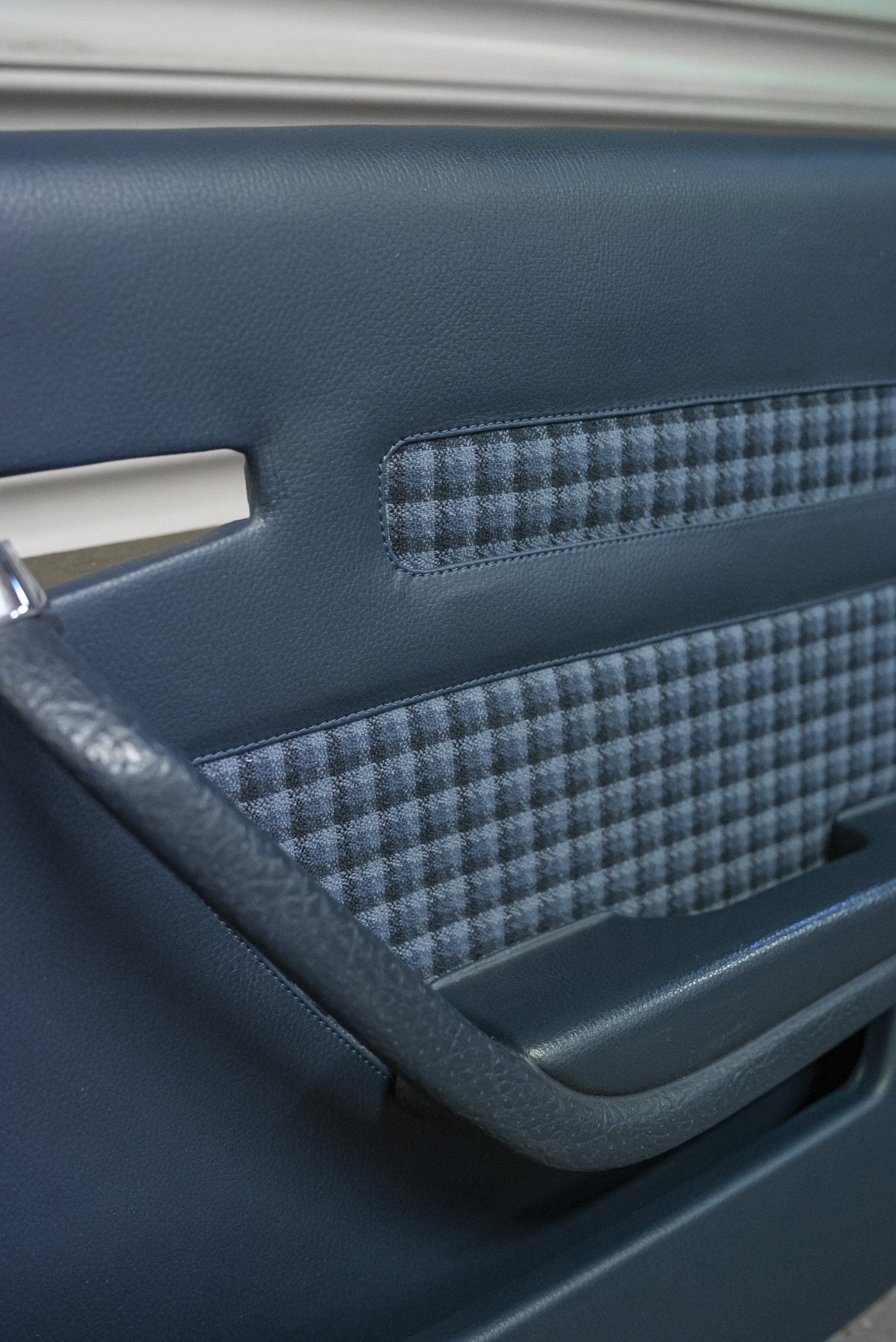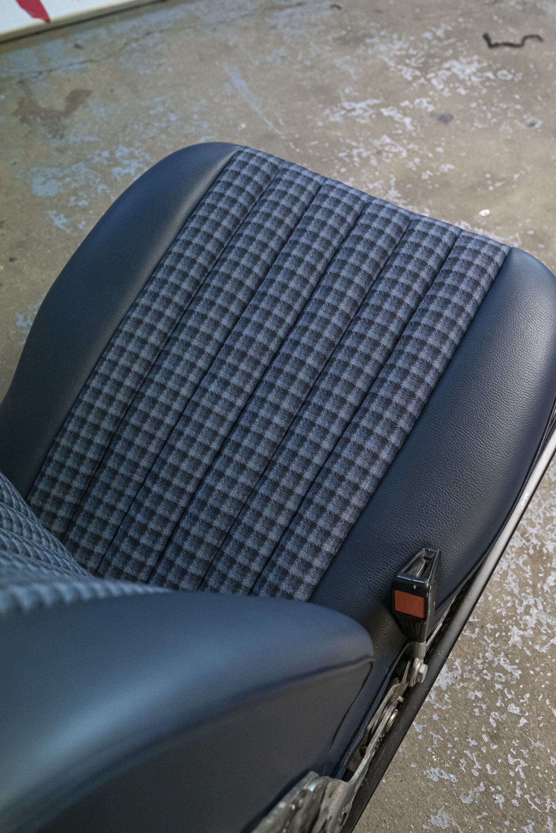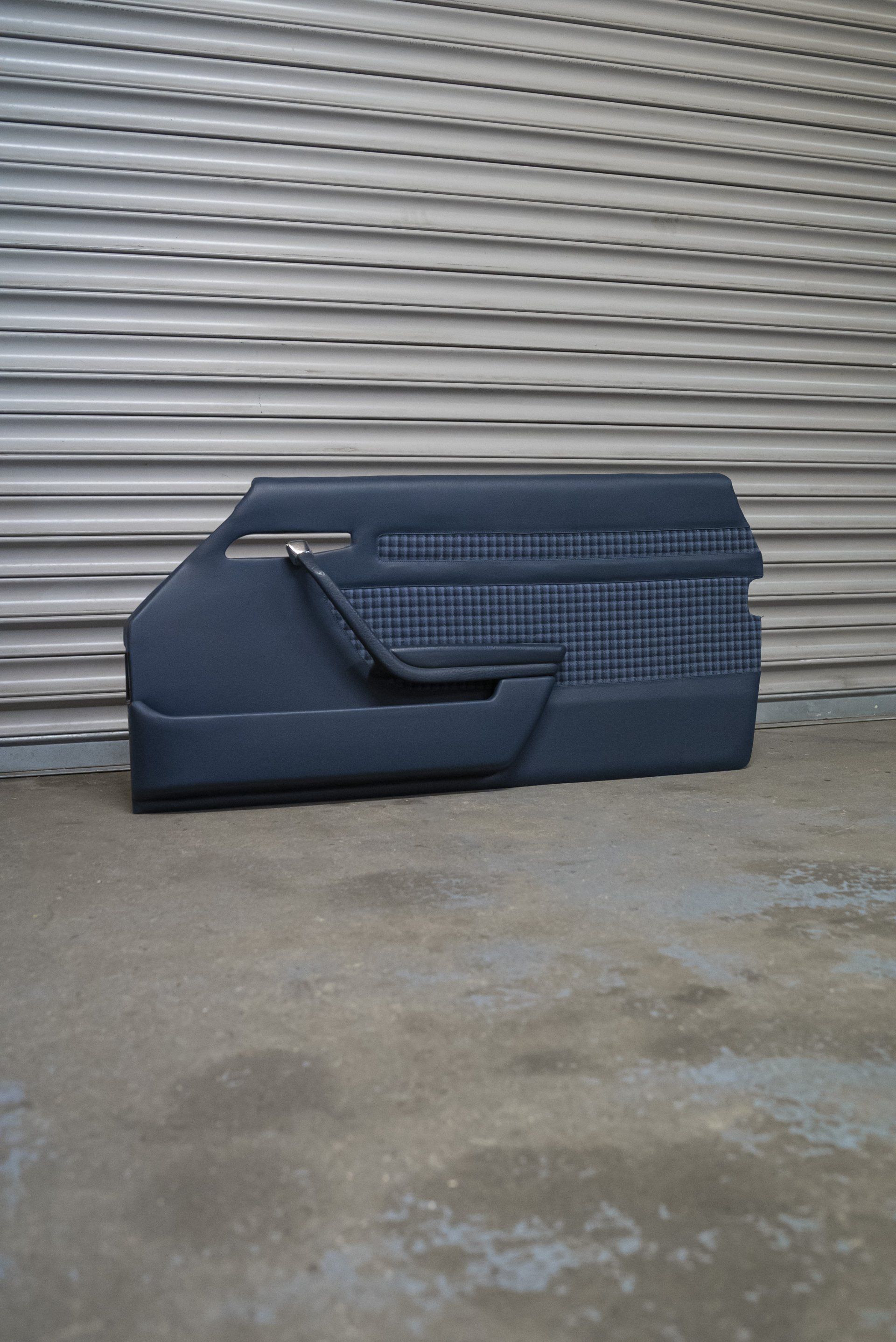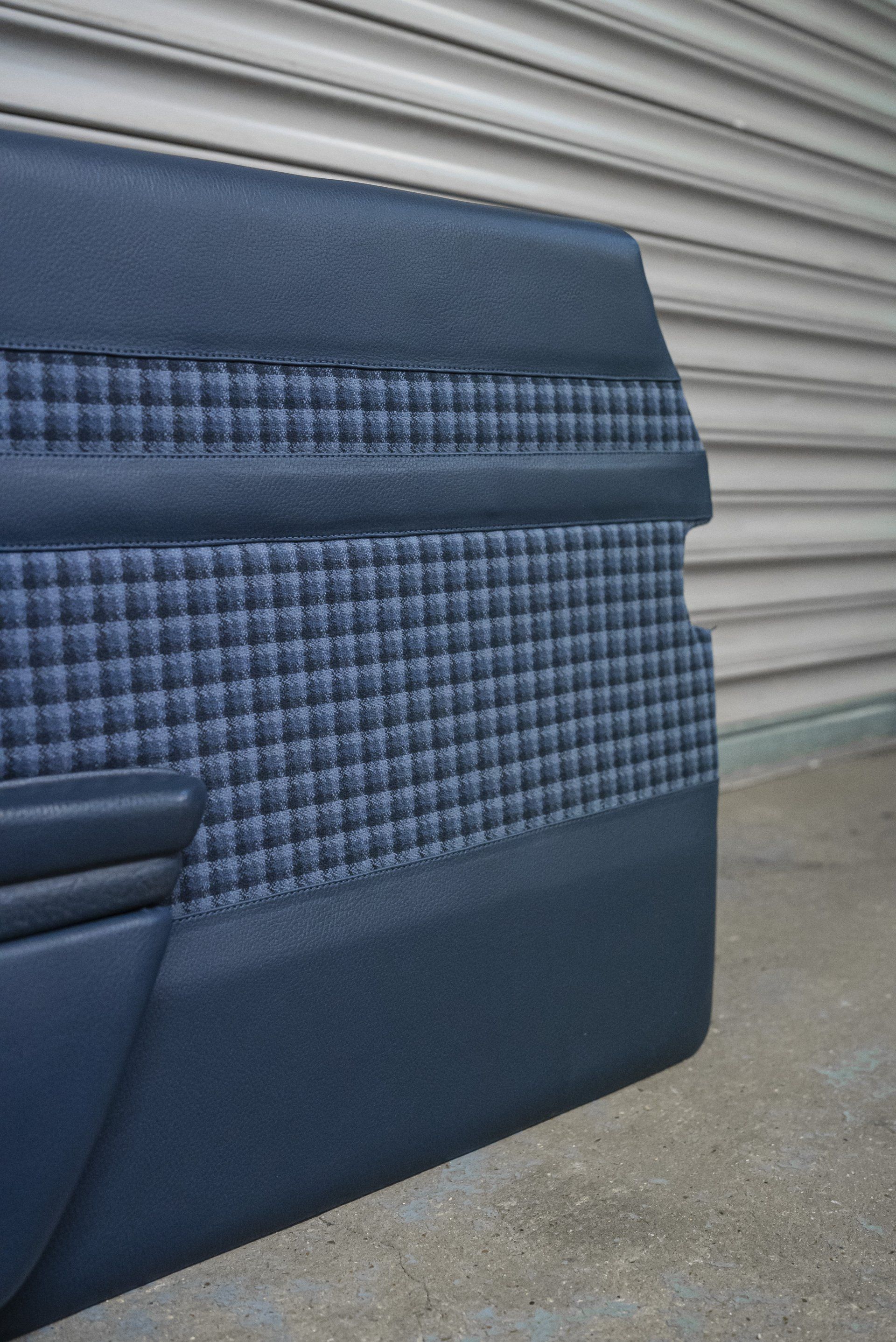 A set of Mercedes-Benz R107 seats and door cards. As you can see by the photographs these seats were in desperate need of a retrim. Mismatching vinyl, collapsed seat foams, rusty seat frames and warped door cards are some of the reasons why this vehicle received some d:class treatment. Blue Karo sports check supplied by @dclassautoshop.