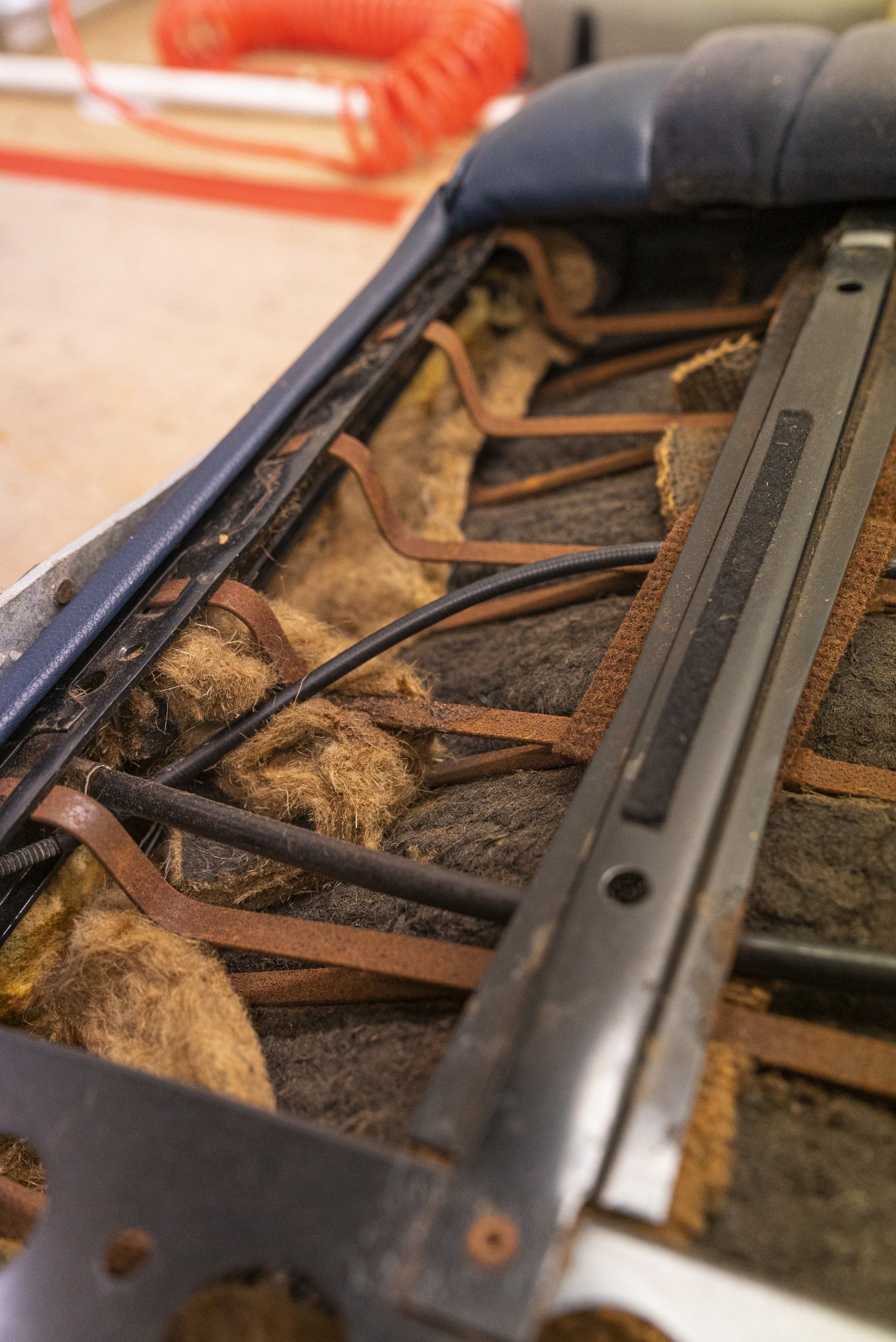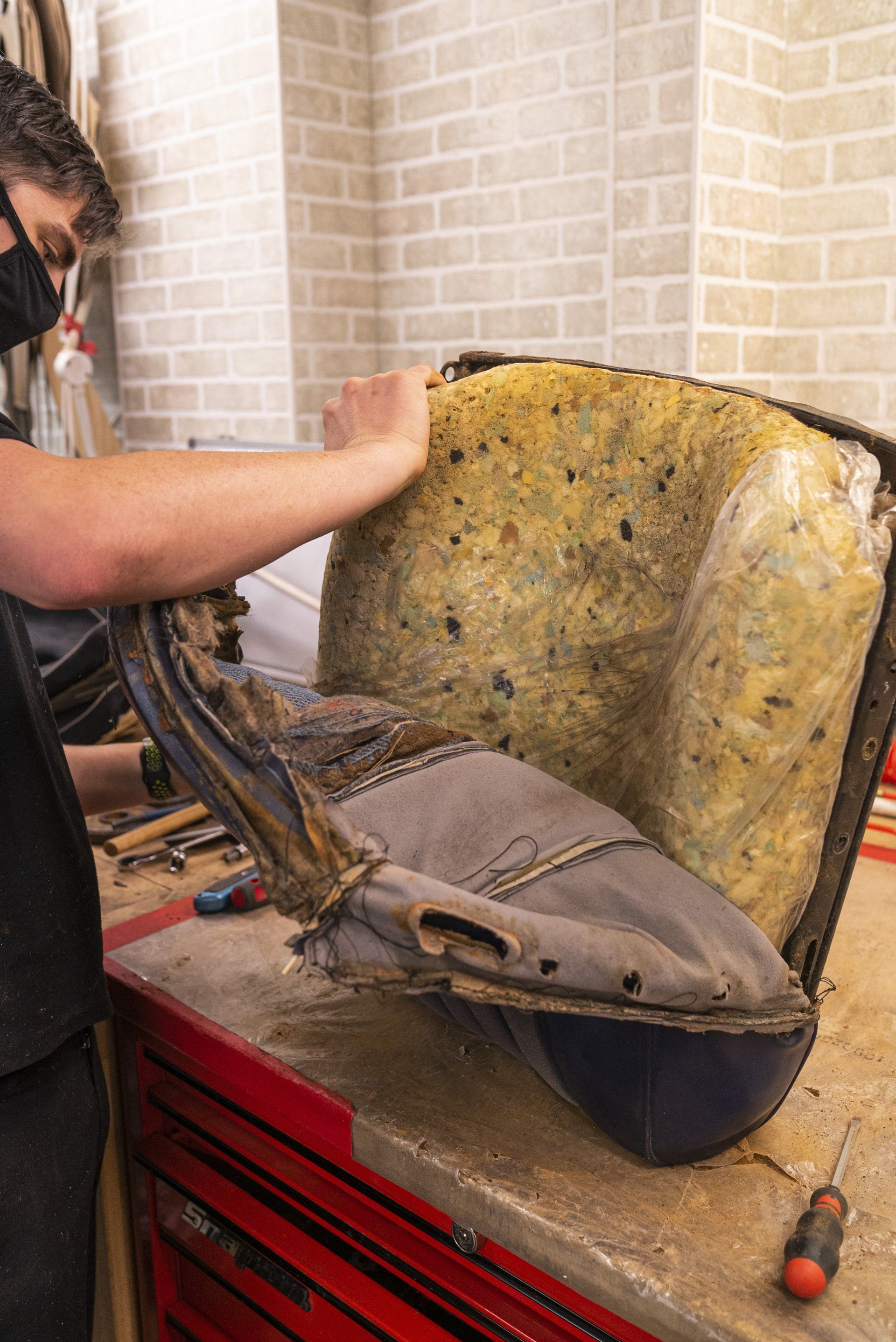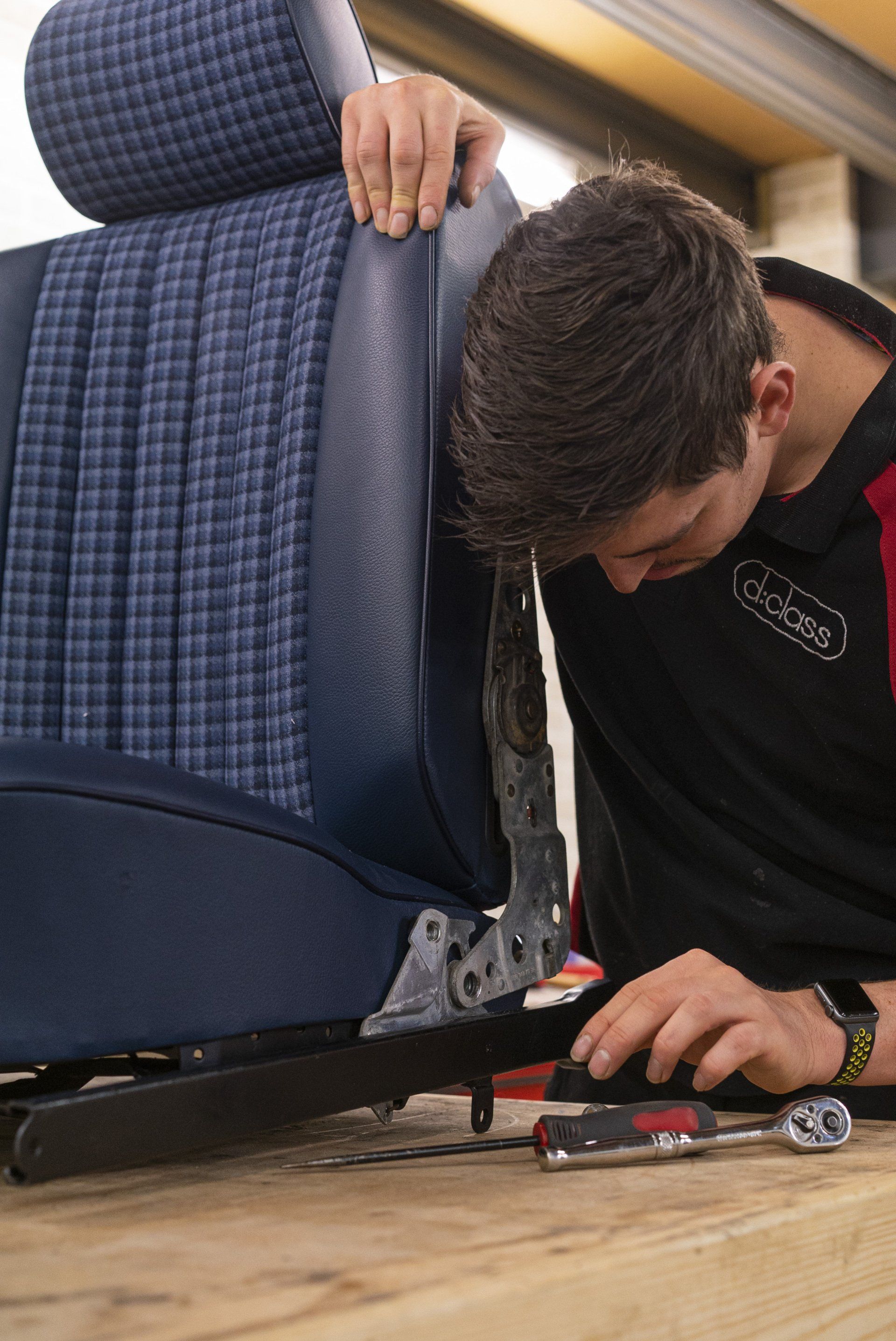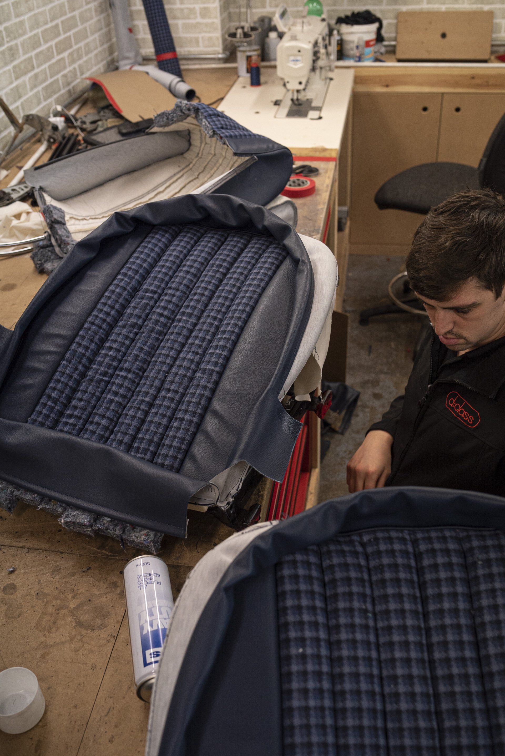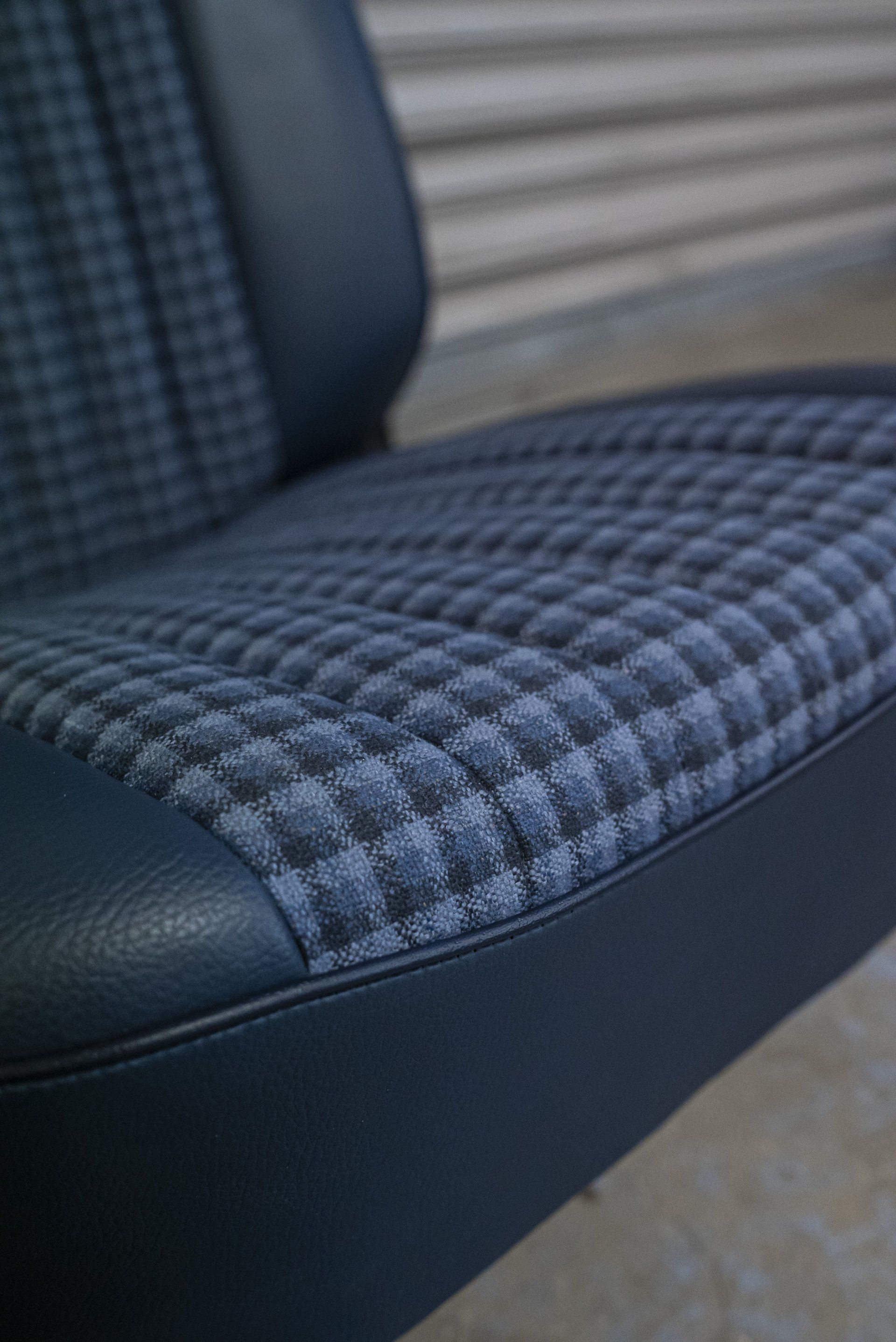 A set of Mercedes-Benz R107 seats and door cards. As you can see by the photographs these seats were in desperate need of a retrim. Mismatching vinyl, collapsed seat foams, rusty seat frames and warped door cards are some of the reasons why this vehicle received some d:class treatment. Blue Karo sports check supplied by @dclassautoshop.
