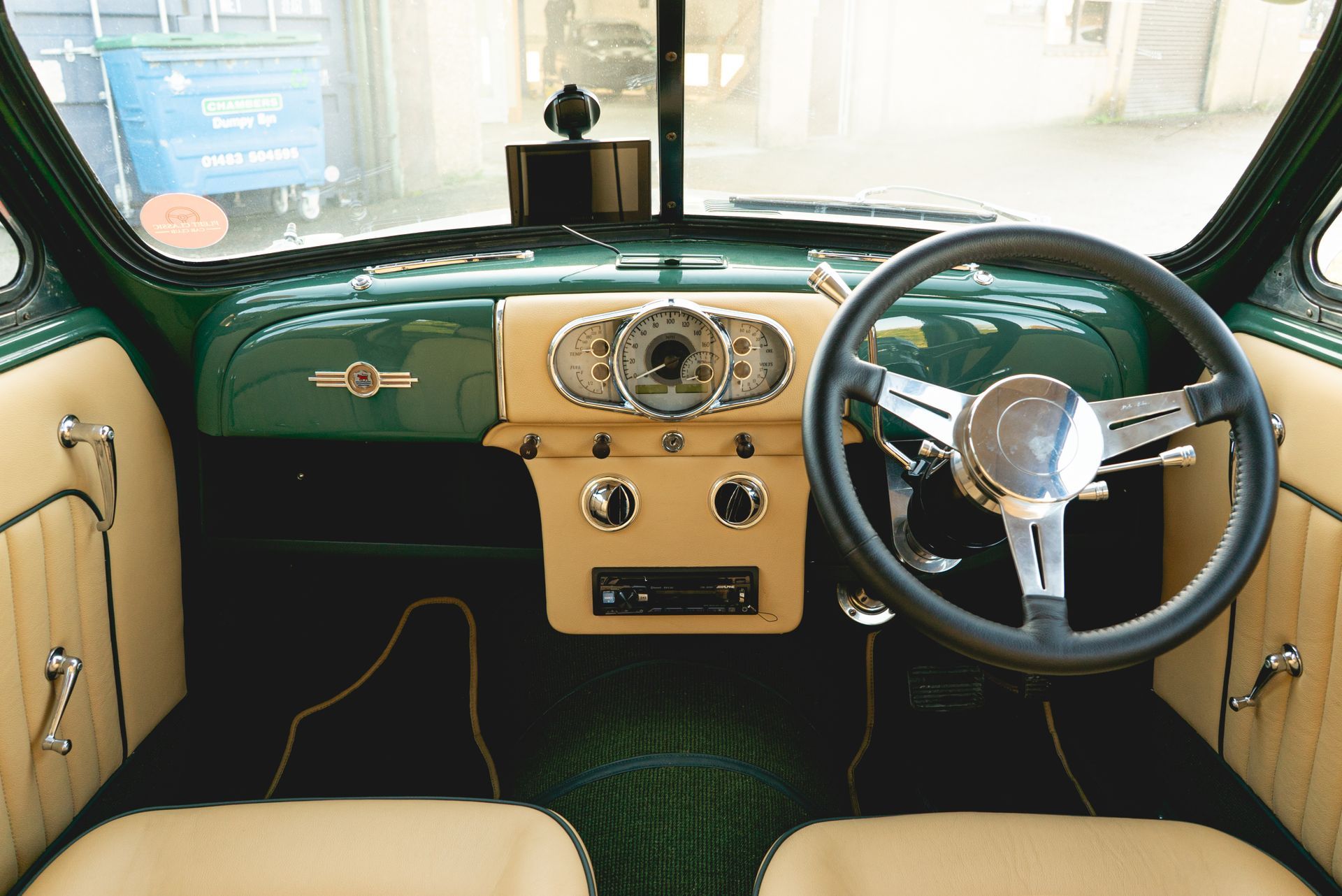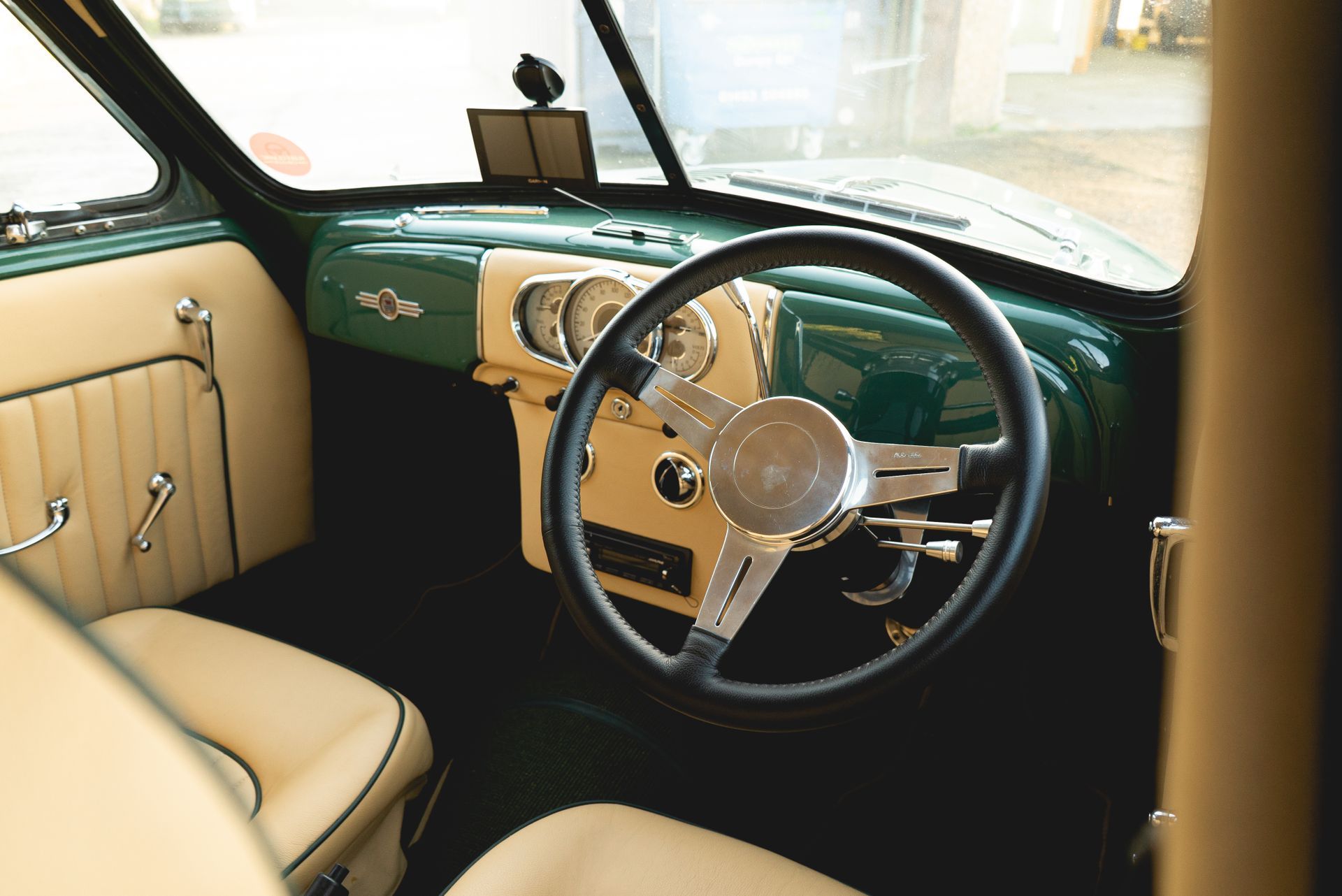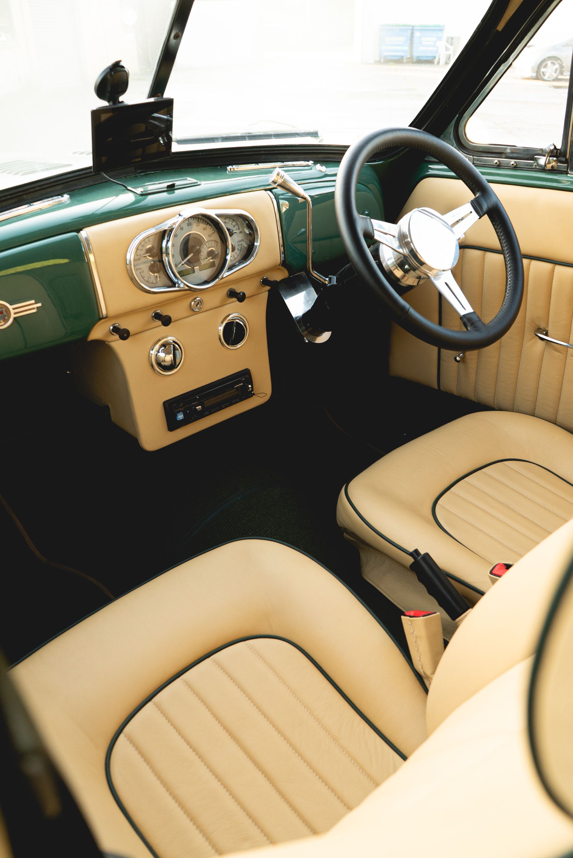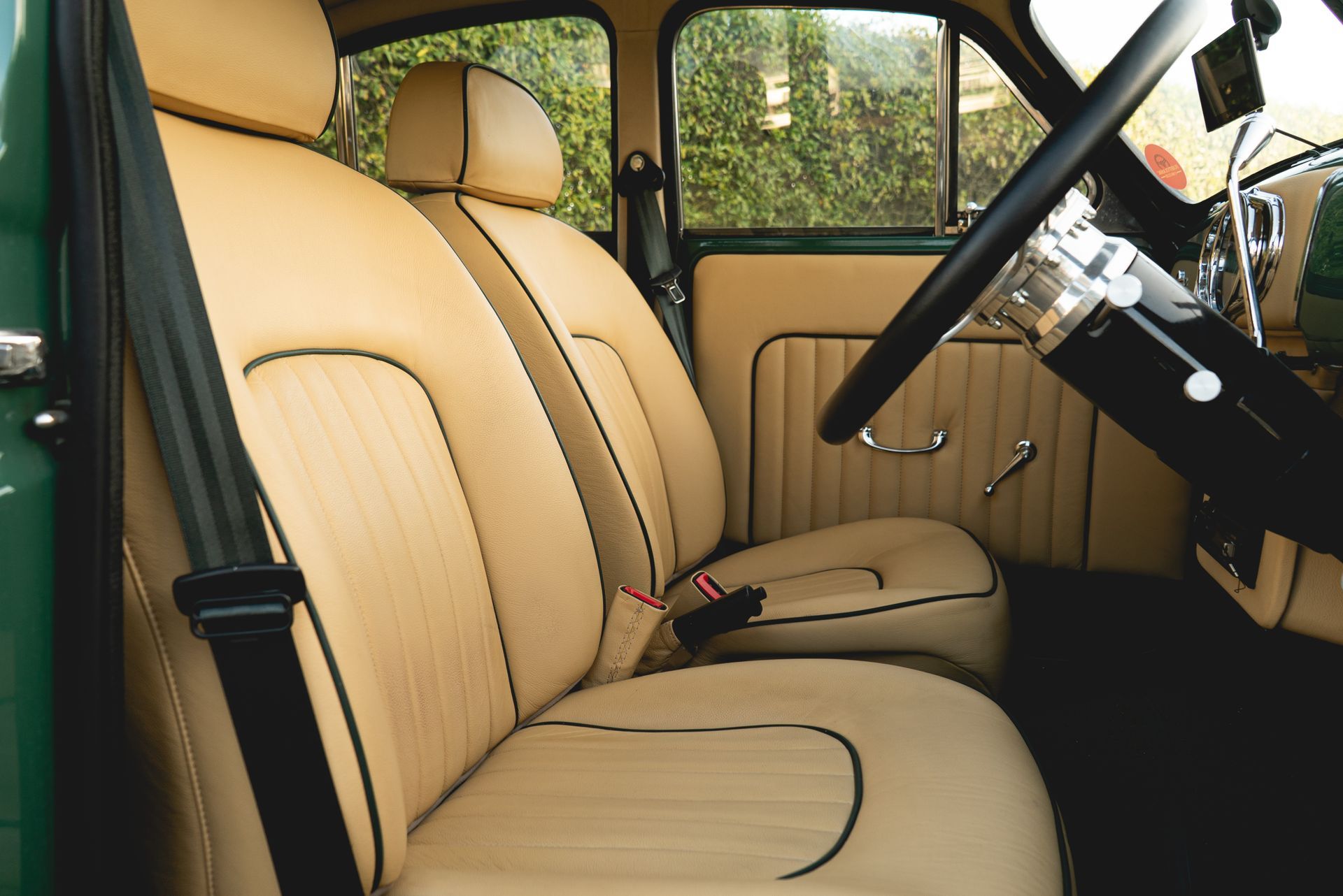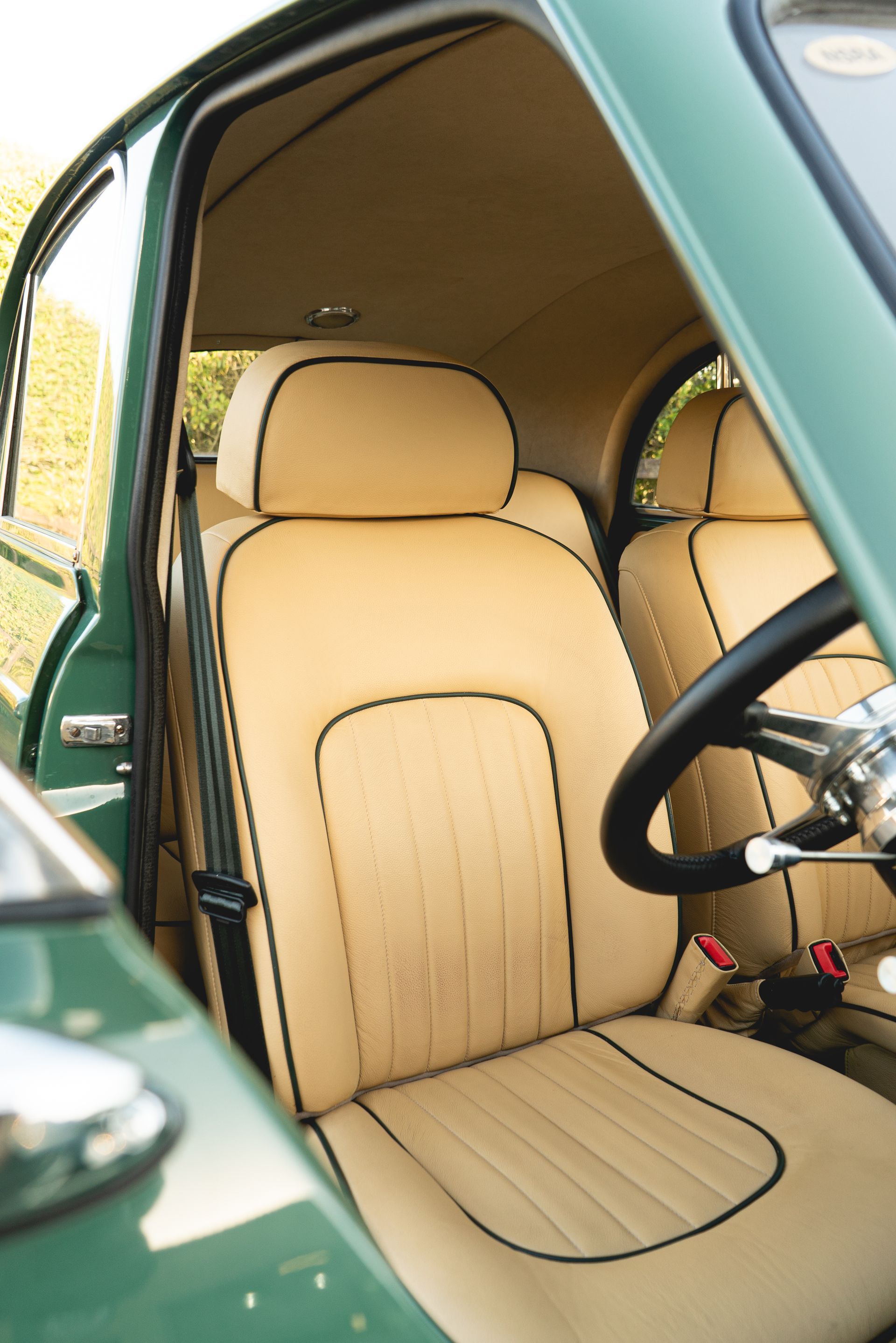 Starting off with the seats, for our keen-eyed readers you may recognise these from another vehicle. They are in fact from a Jaguar X-Type, but customised to fit into this vehicle. The rear bench is the original but has received customised foams in order to match the style and shape of the Jaguar seats. Magnolia grained leather has been used with green piping around the edges to withstand the classic look of the car.