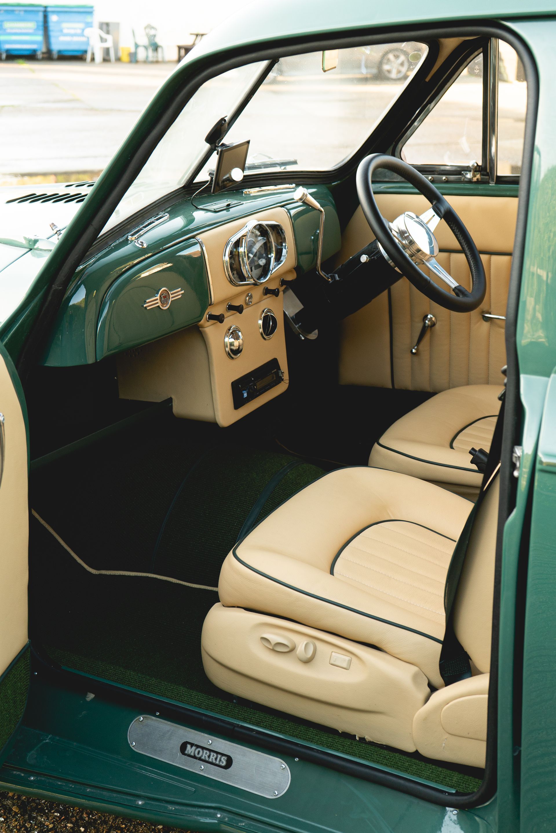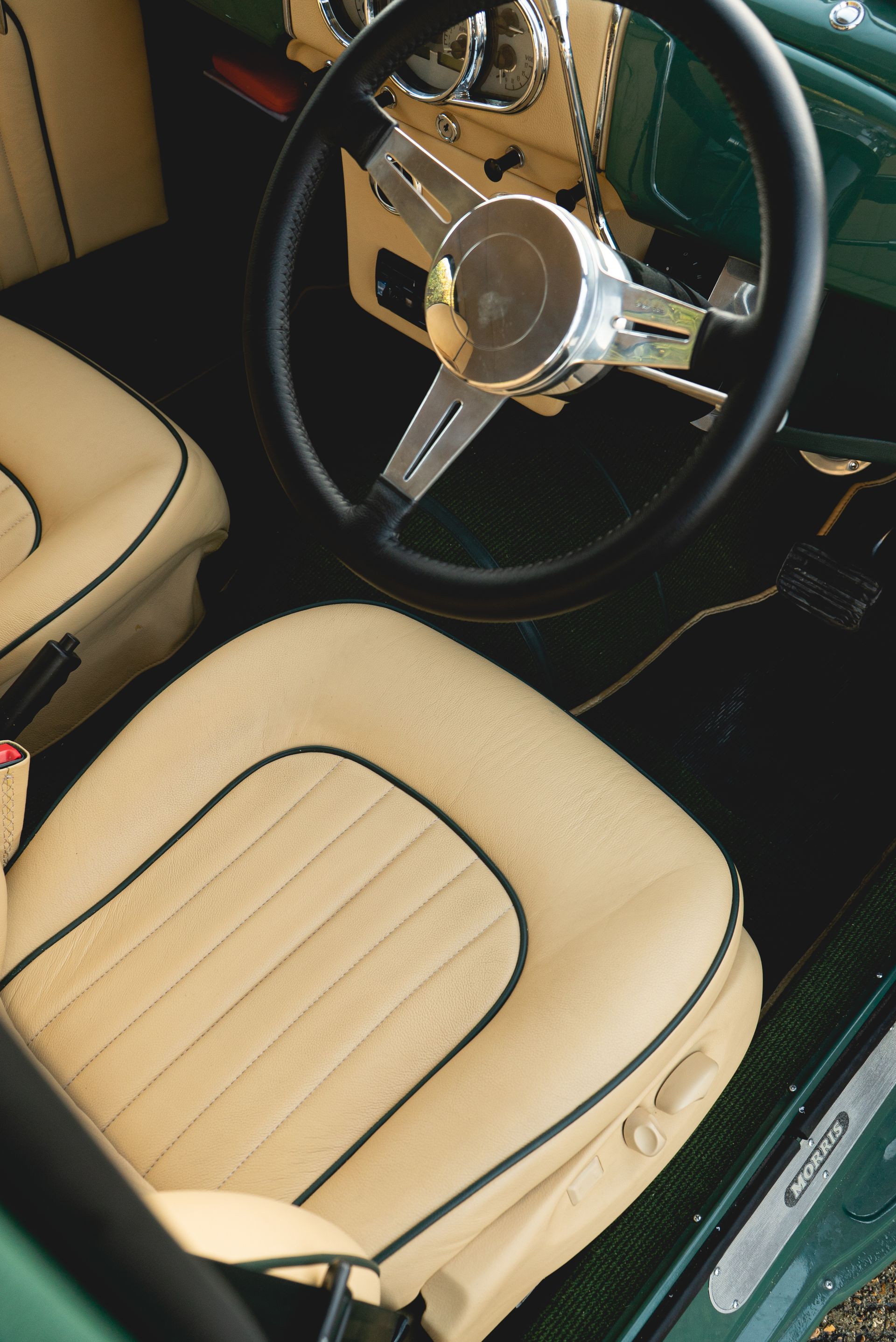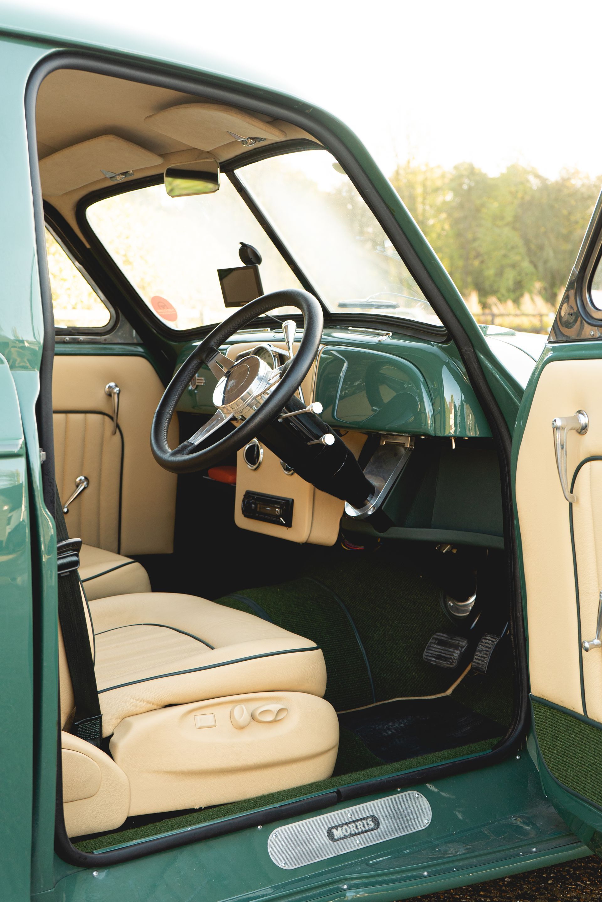 This Morris is by no means your average off-the-shelf vehicle, with a modified chassis, fresh repaint, modified engine, and now with a totally custom interior. We adore it.