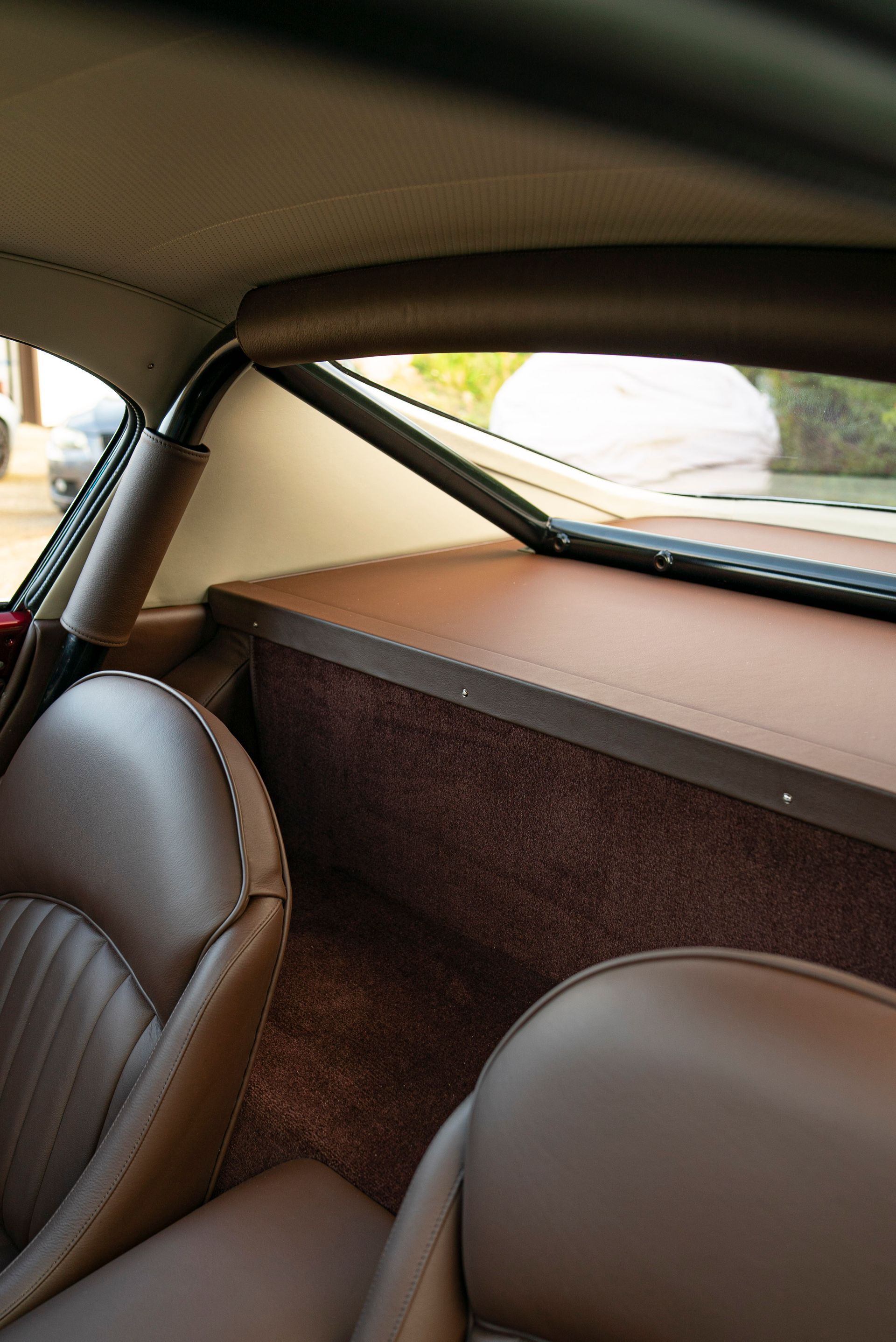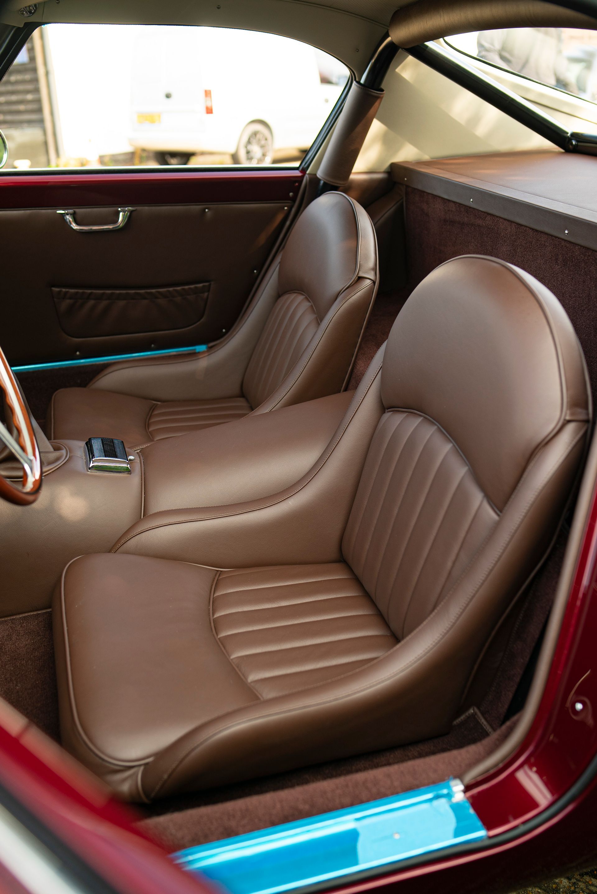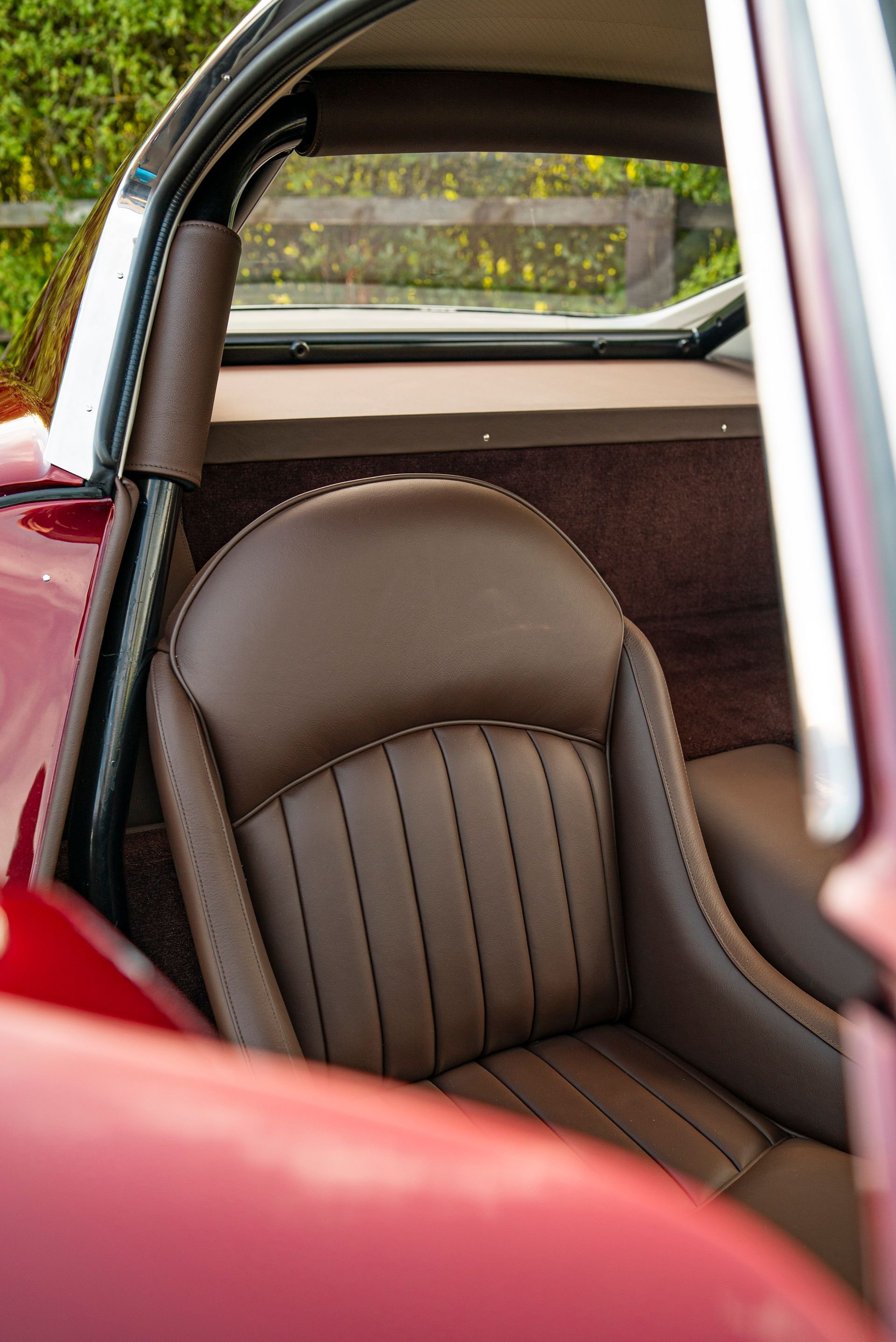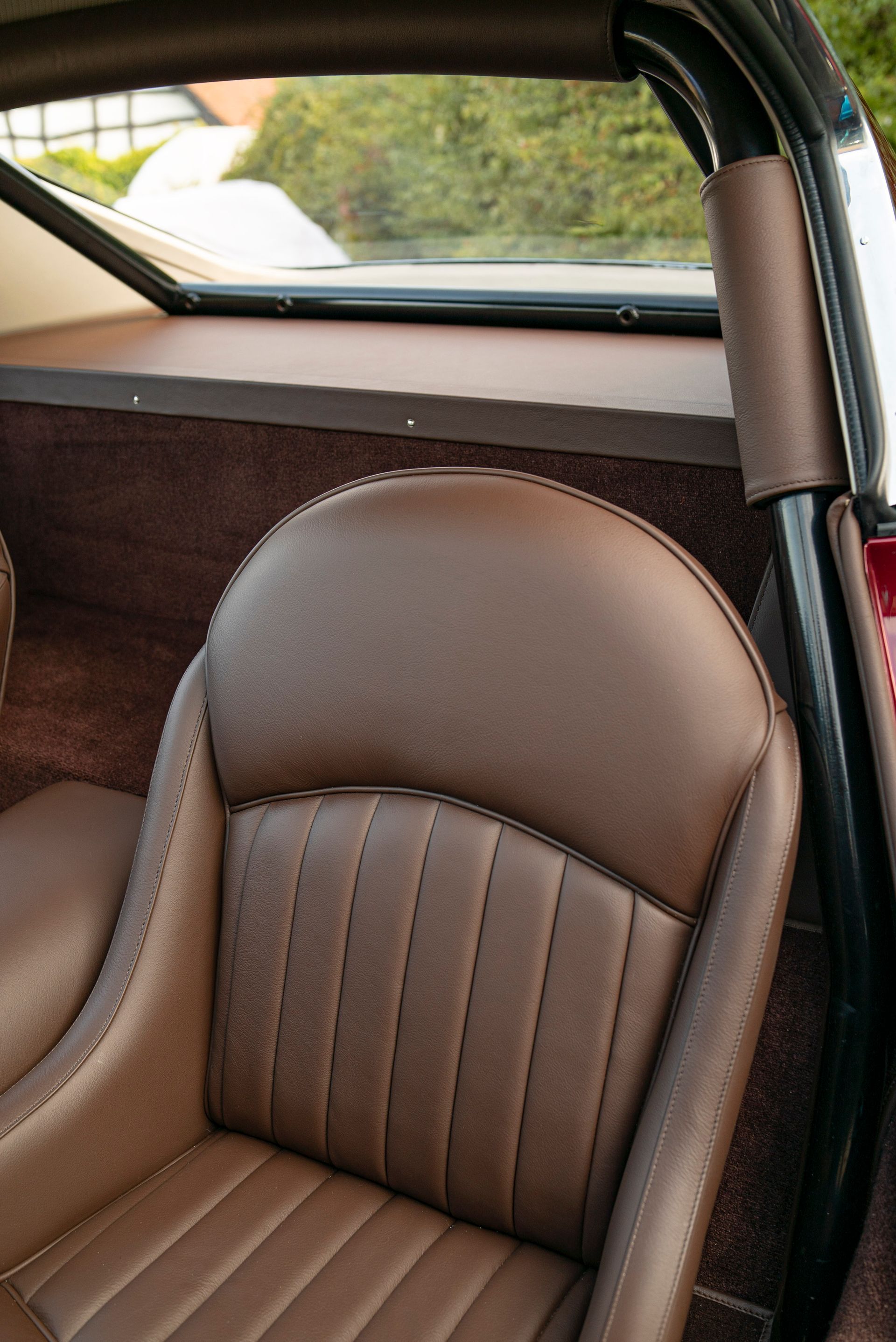 Brown Italian wool carpet was selected for all carpets and over mats, including the rear bulkhead. The leather seats, door cards, parcel shelf, roll cage padding, centre tunnel, and carpet binding were all trimmed in UK hide-supplied brown Vaumol leather.