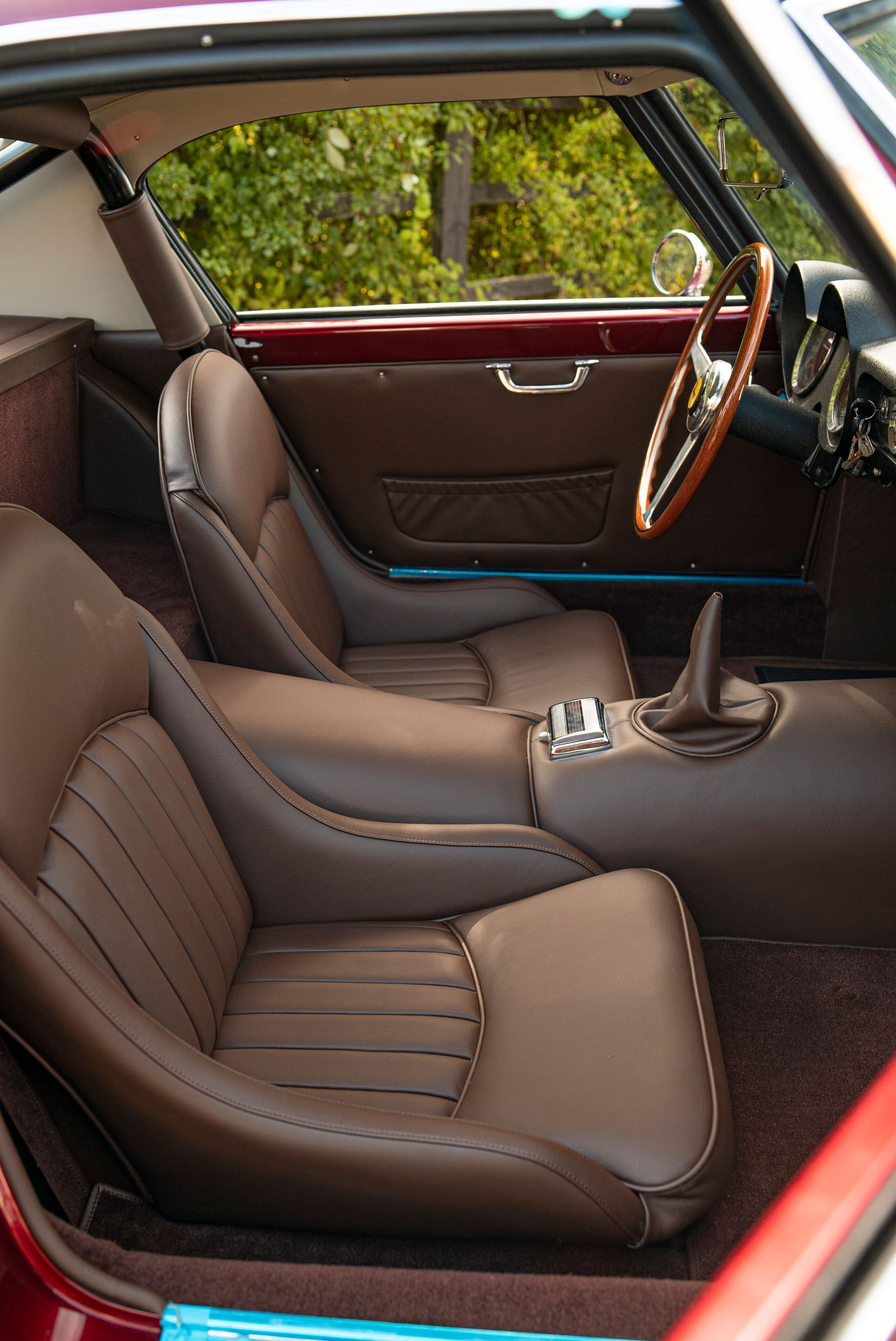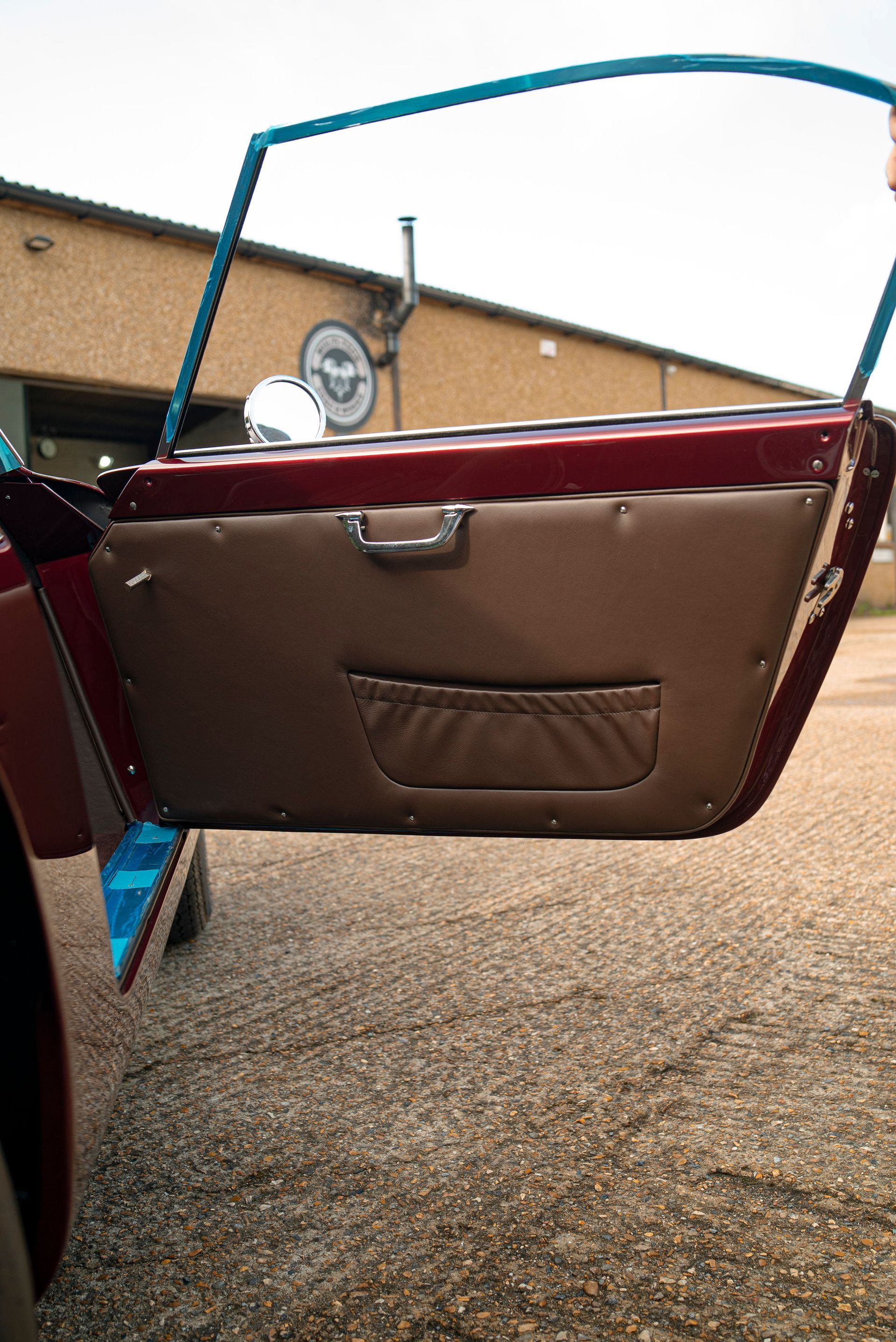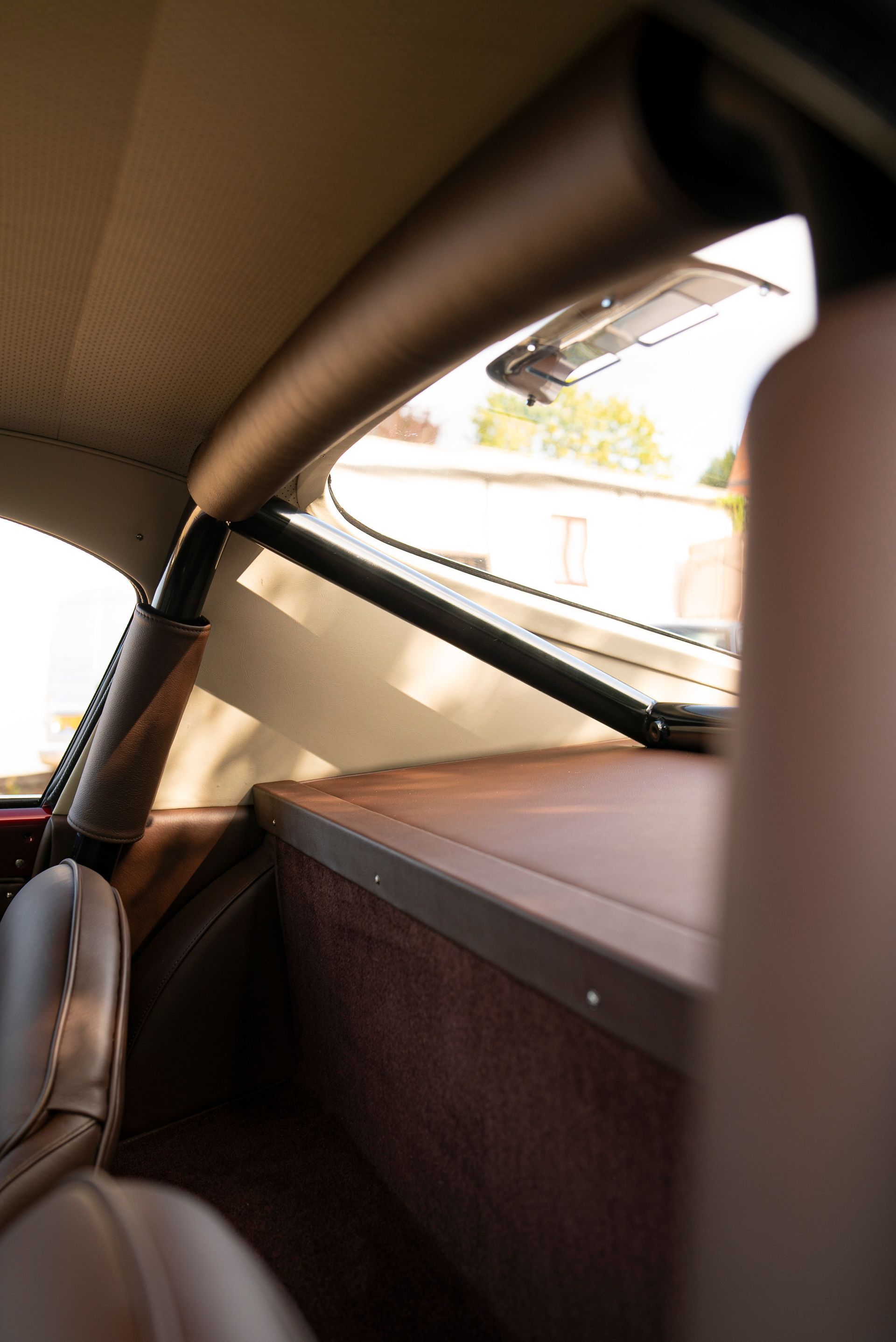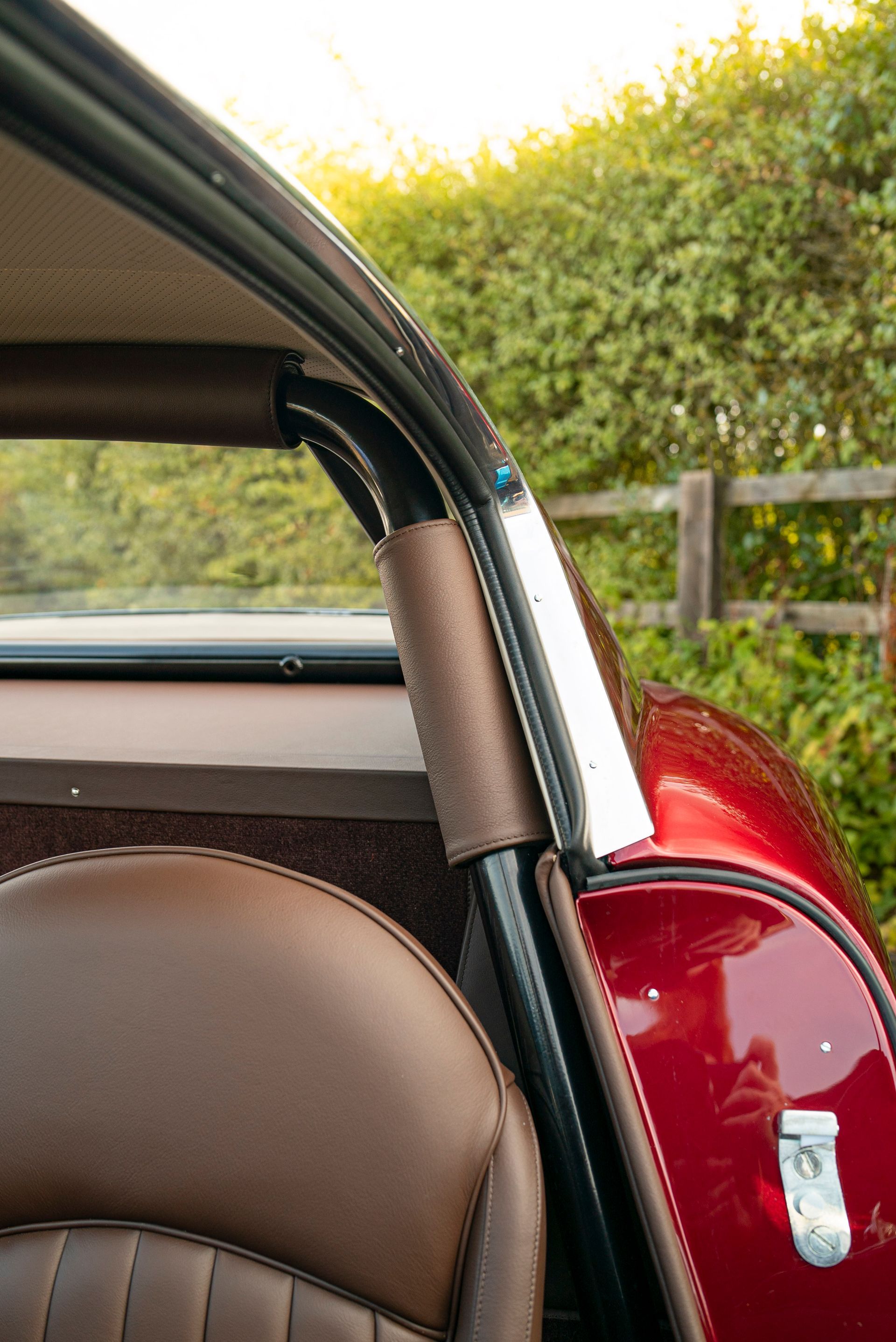 Brown Italian wool carpet was selected for all carpets and over mats, including the rear bulkhead. The leather seats, door cards, parcel shelf, roll cage padding, centre tunnel, and carpet binding were all trimmed in UK hide-supplied brown Vaumol leather.