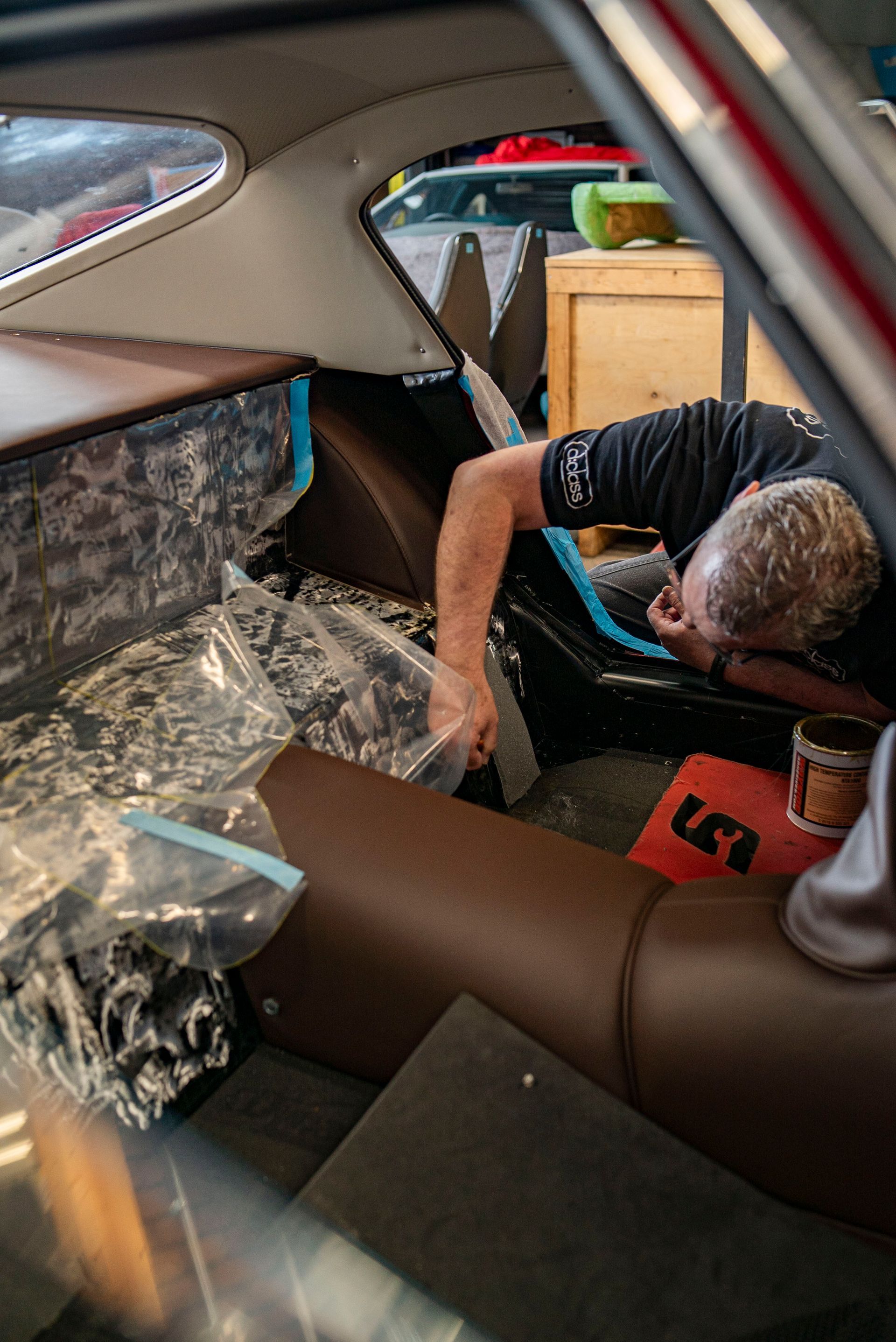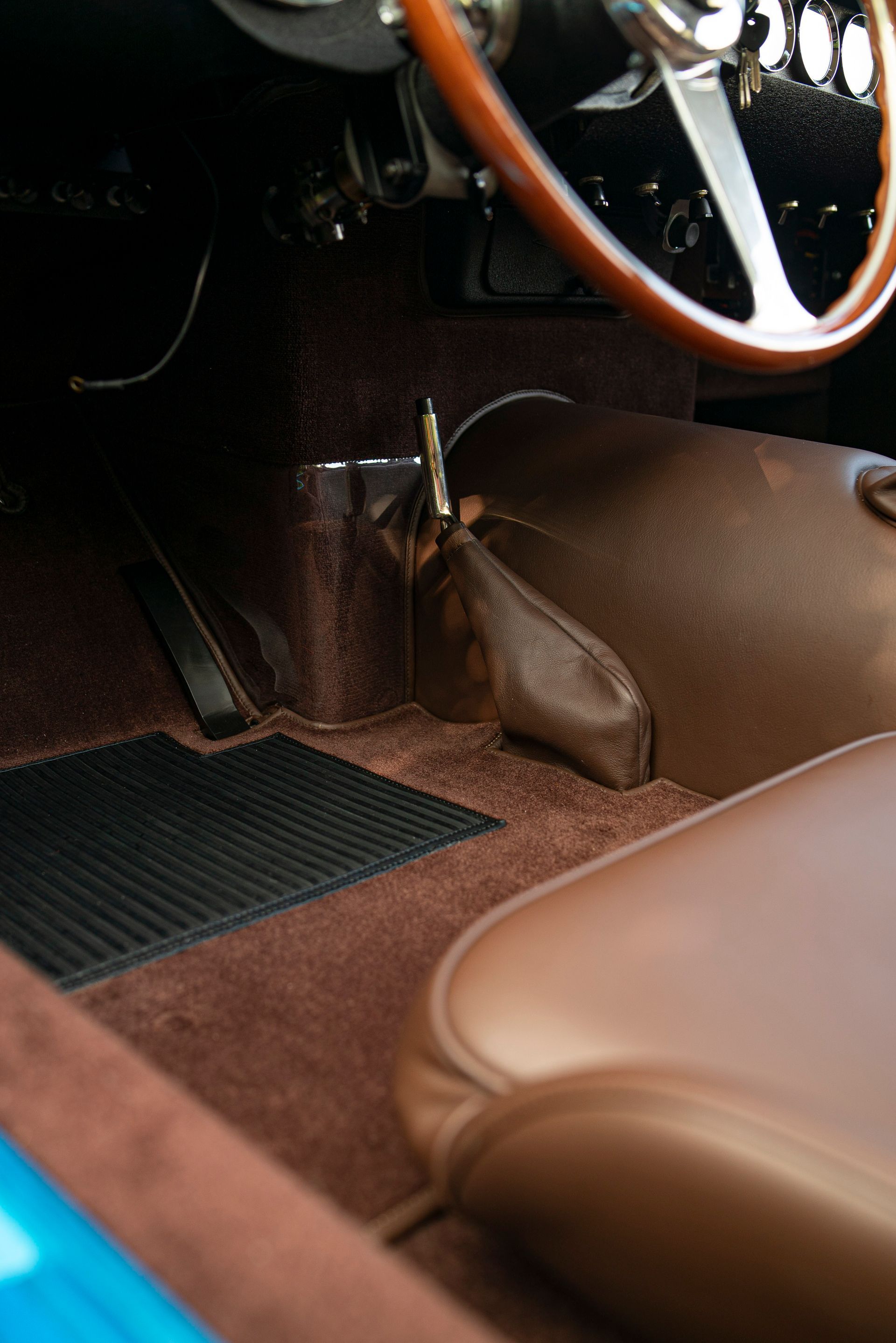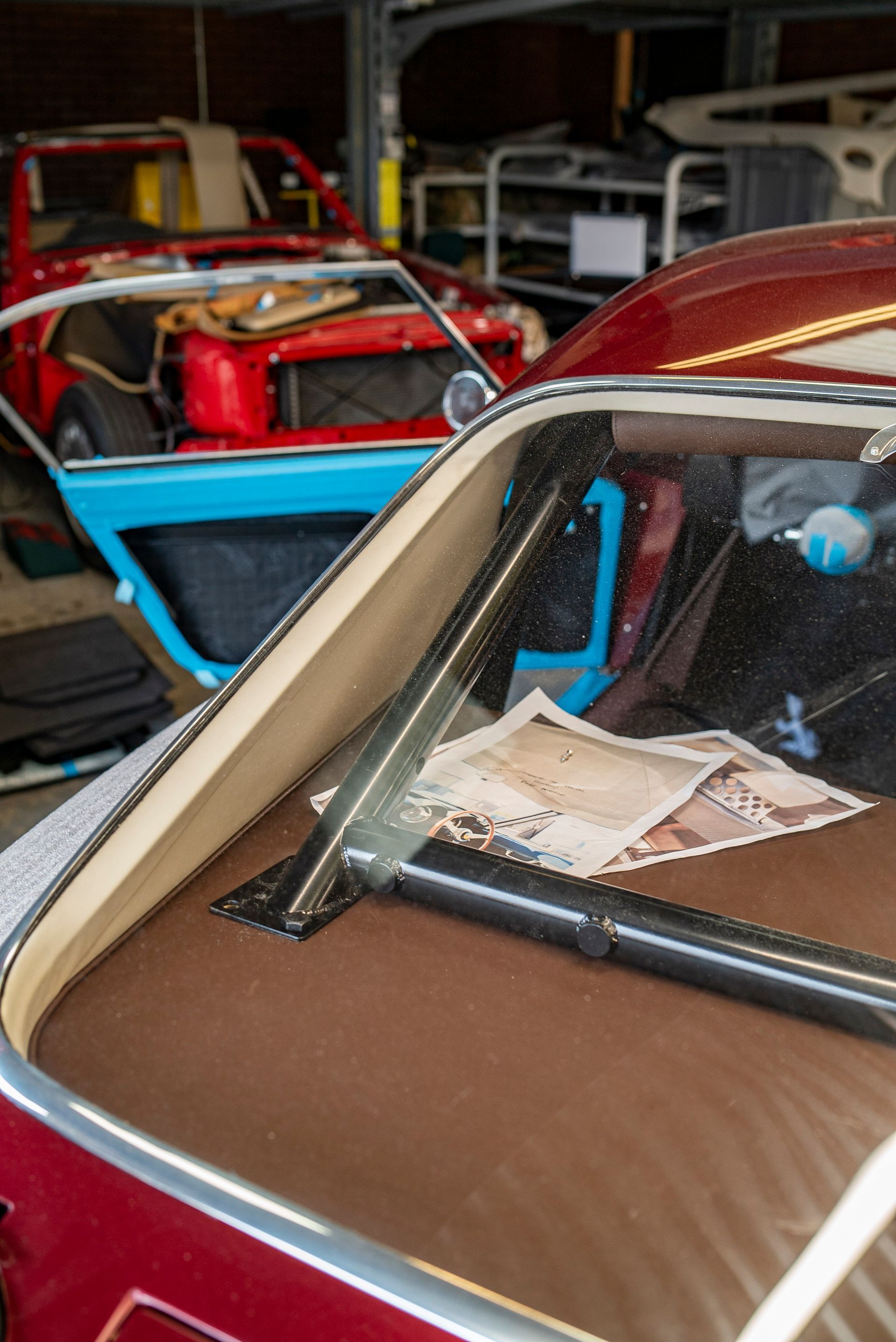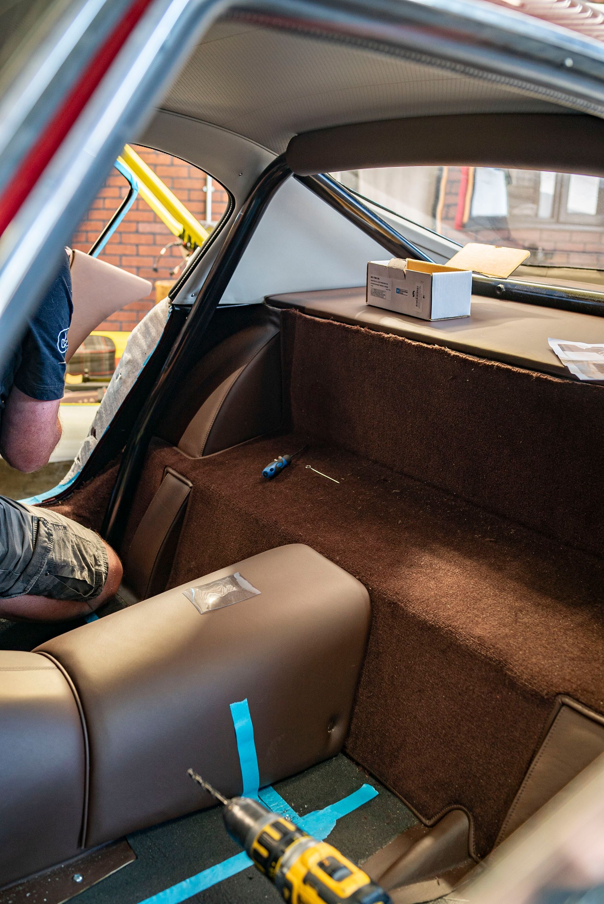 Brown Italian wool carpet was selected for all carpets and over mats, including the rear bulkhead. The leather seats, door cards, parcel shelf, roll cage padding, centre tunnel, and carpet binding were all trimmed in UK hide-supplied brown Vaumol leather.