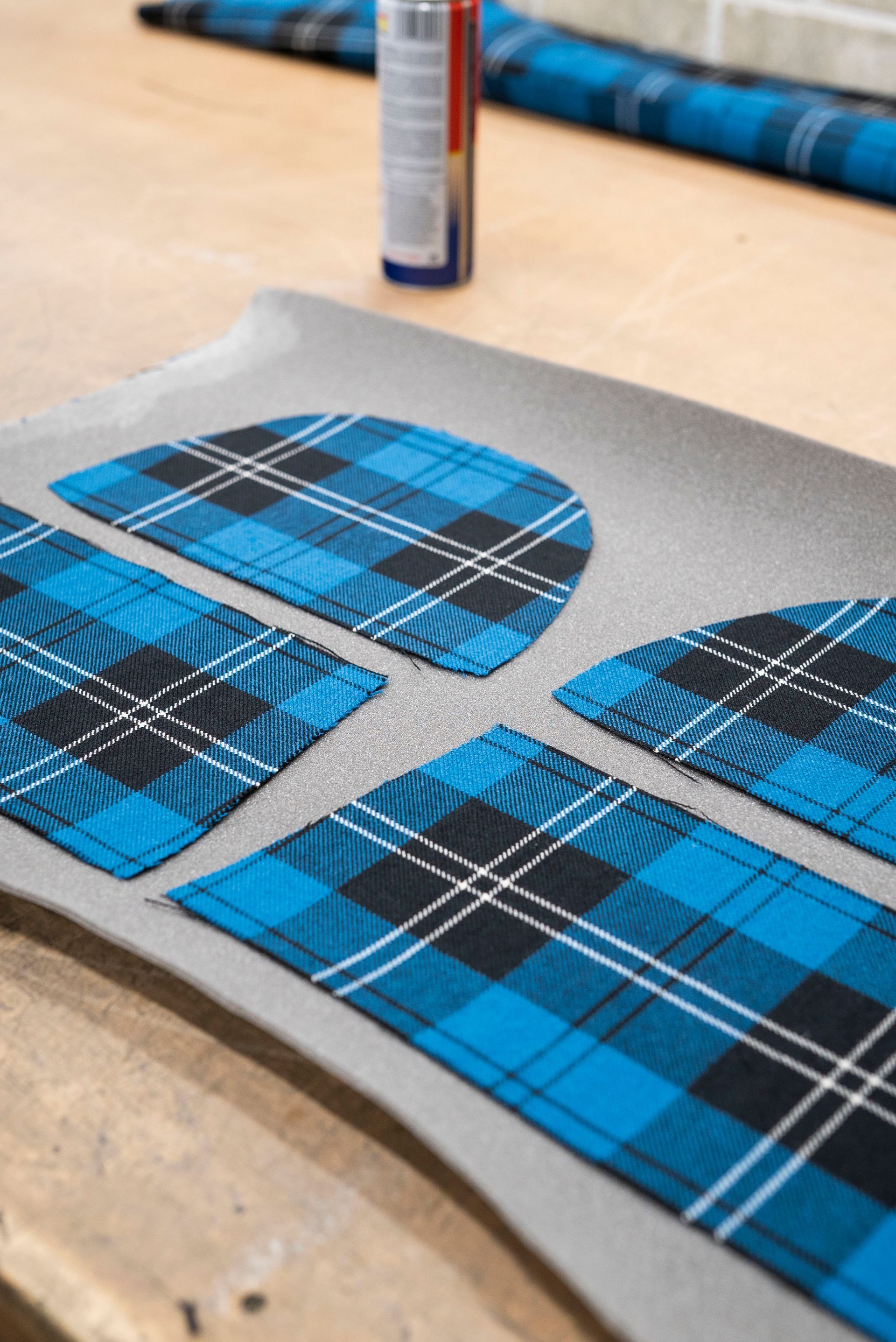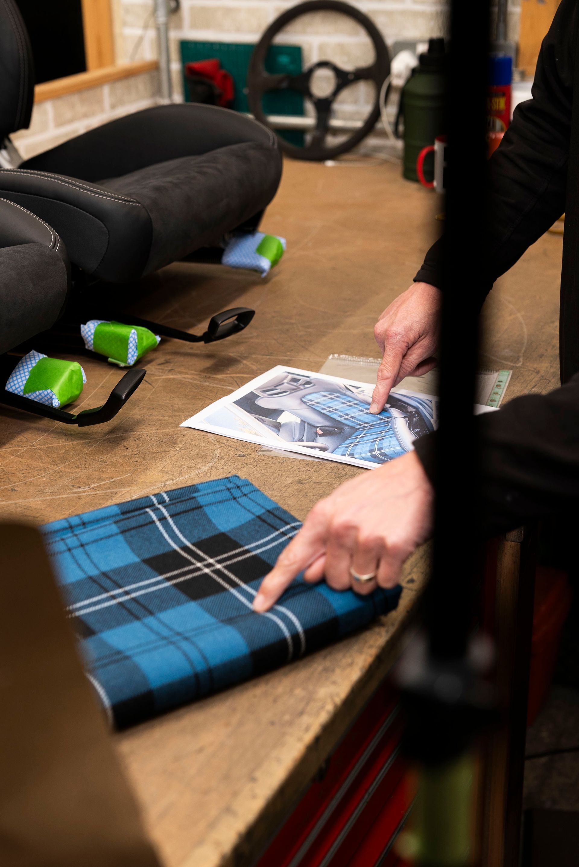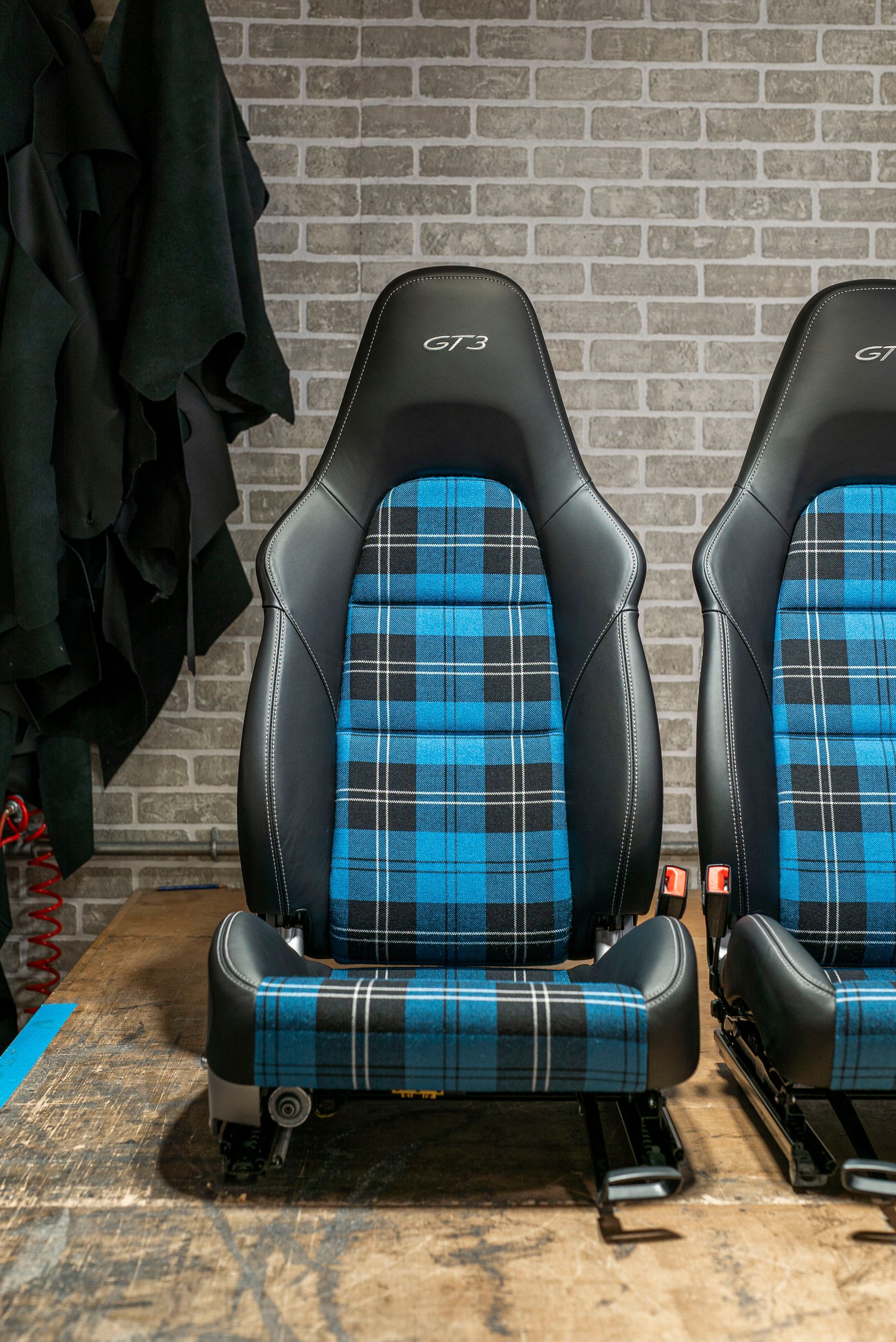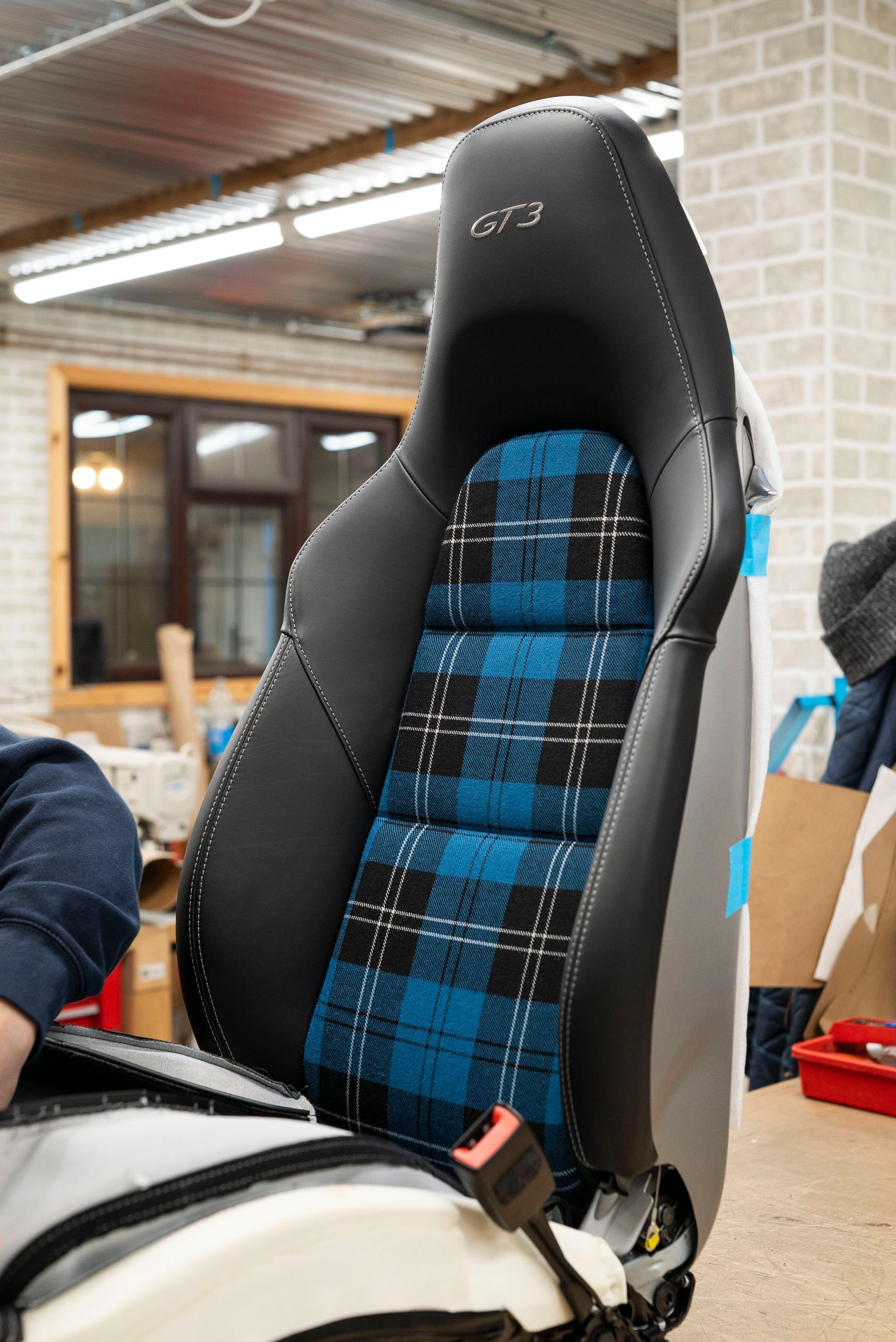 A vibrant job for these Porsche GT3 seats we had through our doors recently. Our customer contacted us after finding our website online and enquired about having their GT3 comfort seats retrimmed. Blue tartan material was supplied to us, originally destined for making kilts.