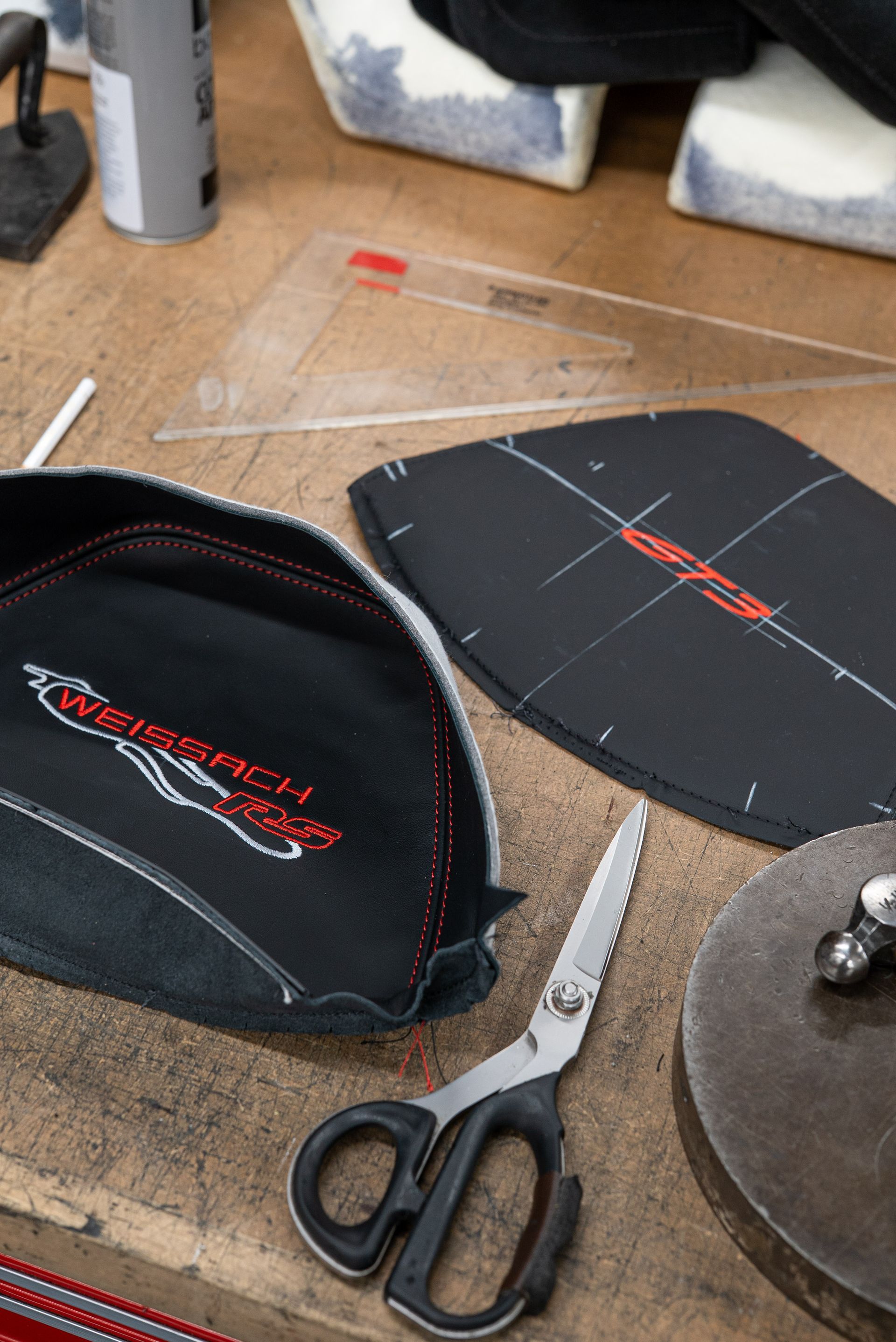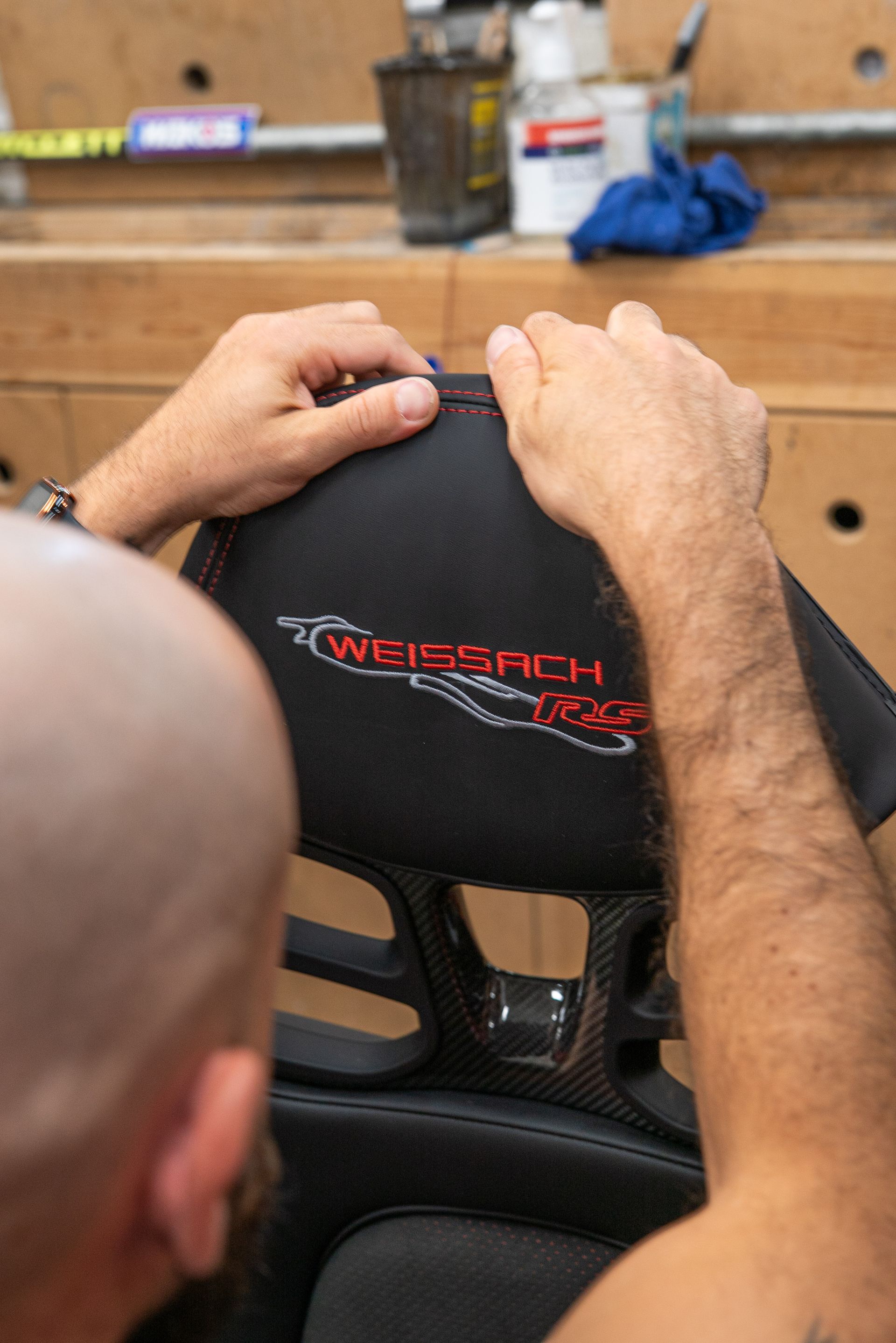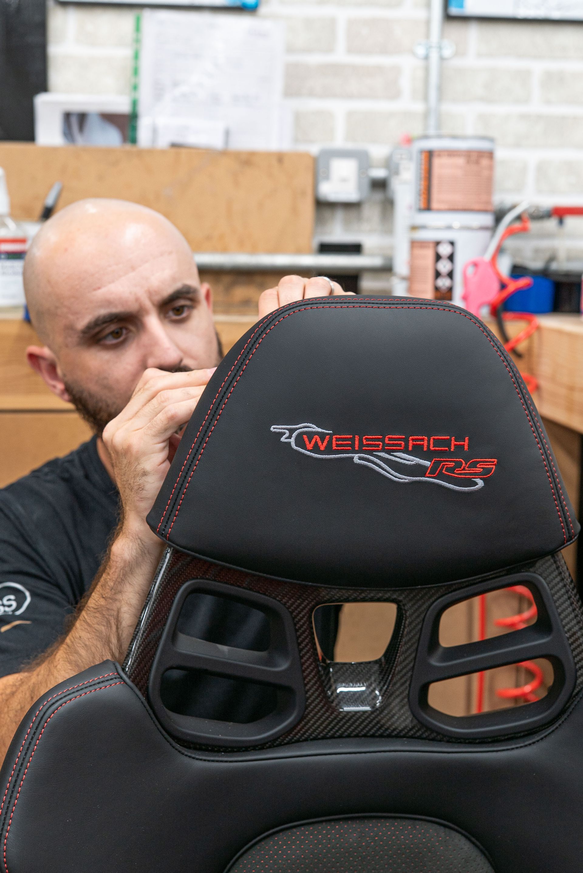 So for this one, we were tasked with changing the headrest pads for this Porsche GT3 to feature embroidered Weissach RS logos. With this you cannot simply remove the previous embroidery, but instead you need to retrim the panel. So new headrest panels were made in matching OEM Porsche leather. We recreated the Weissach RS artwork in-house and had it embroidered to the correct and exact measurement.