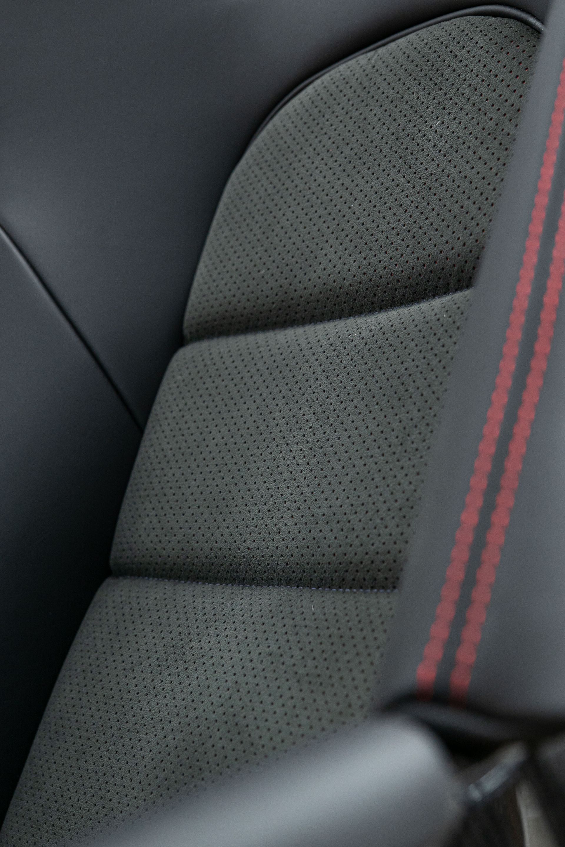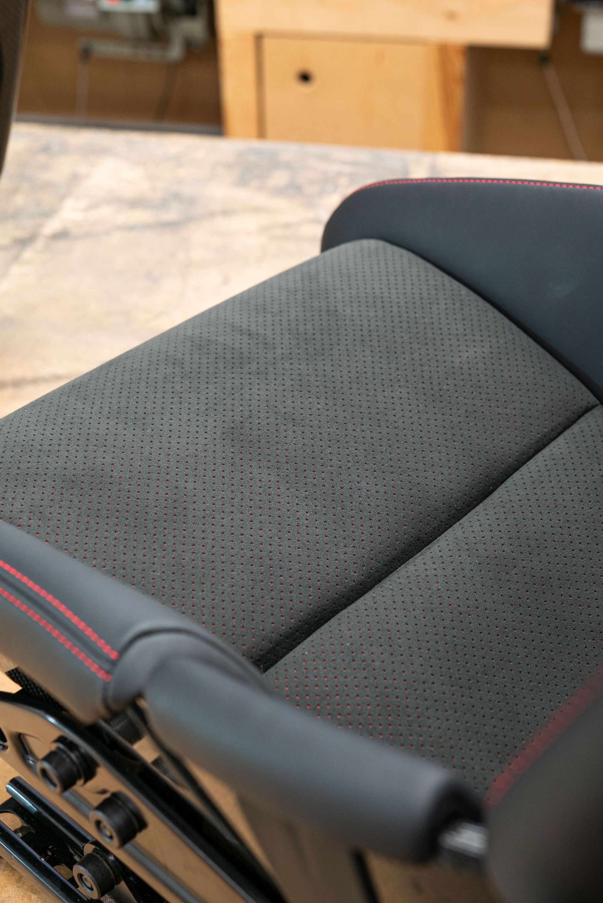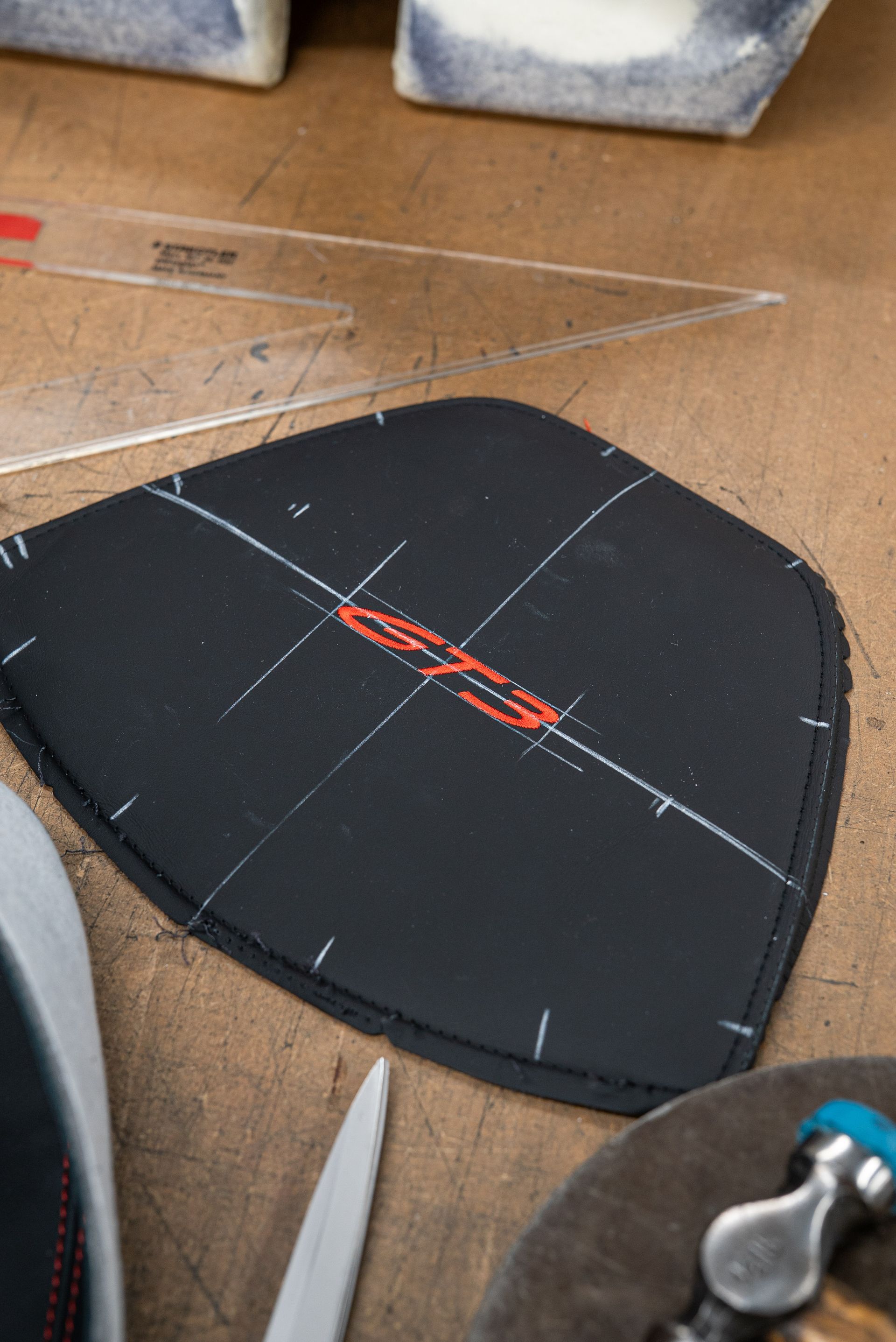 So for this one, we were tasked with changing the headrest pads for this Porsche GT3 to feature embroidered Weissach RS logos. With this you cannot simply remove the previous embroidery, but instead you need to retrim the panel. So new headrest panels were made in matching OEM Porsche leather. We recreated the Weissach RS artwork in-house and had it embroidered to the correct and exact measurement.