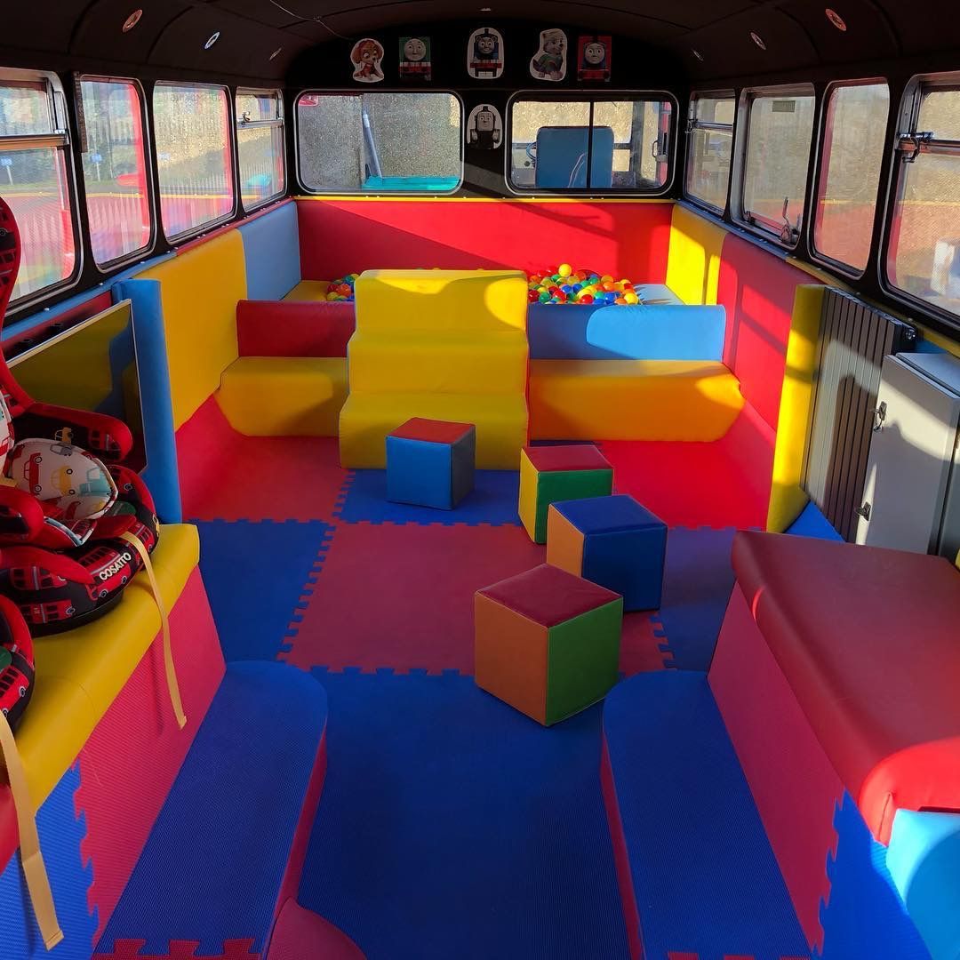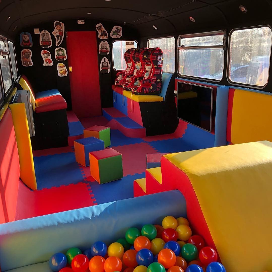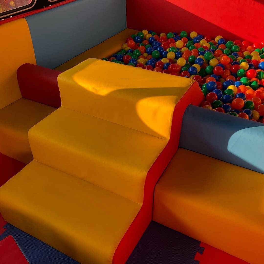Next, was building the interior back up. In the downstairs children's area we built a ball pit, padded side panels, bench seating and tiled foam floors. We mixed matched the colours of all of the trim to make it vibrant and fun for the kids, a complete contrast to upstairs. The parent section upstairs had a bar, seating, stools, padded panels, carpet, and roof all trimmed. We added a pair of leather sofas too so that people could be comfortable whilst their little darlings played downstairs.