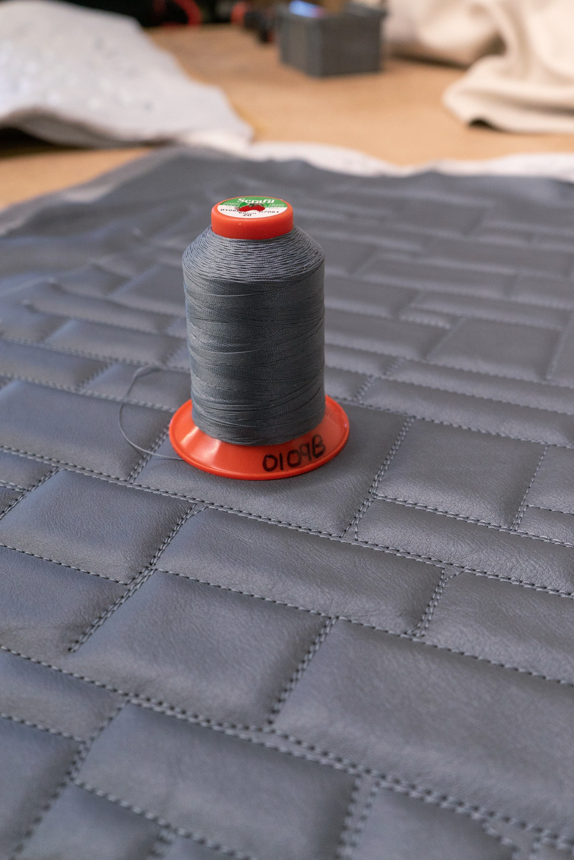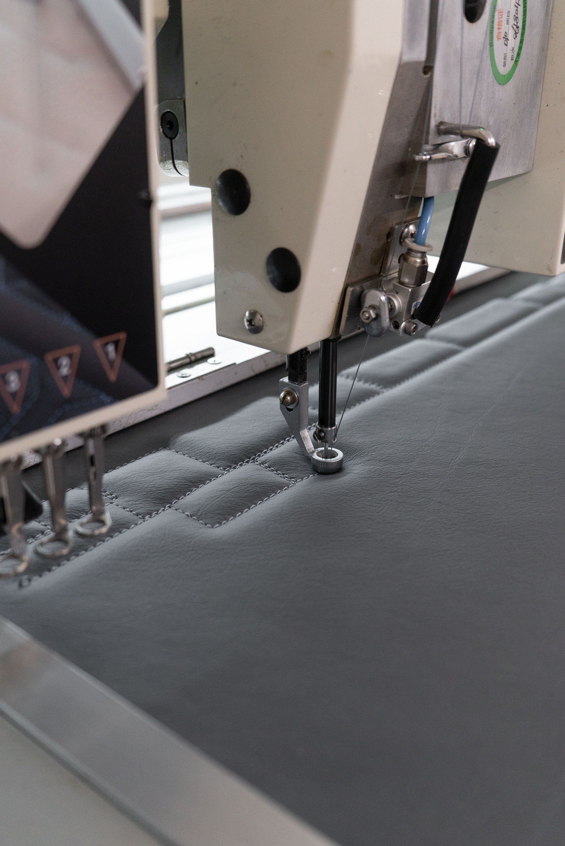 Lastly we began designing and creating the leather trimmed panels which are mounted to the front of the office desks. These are made from metallic grey leather with a bespoke brick CNC Pattern from our sister company d:class autostitch.
