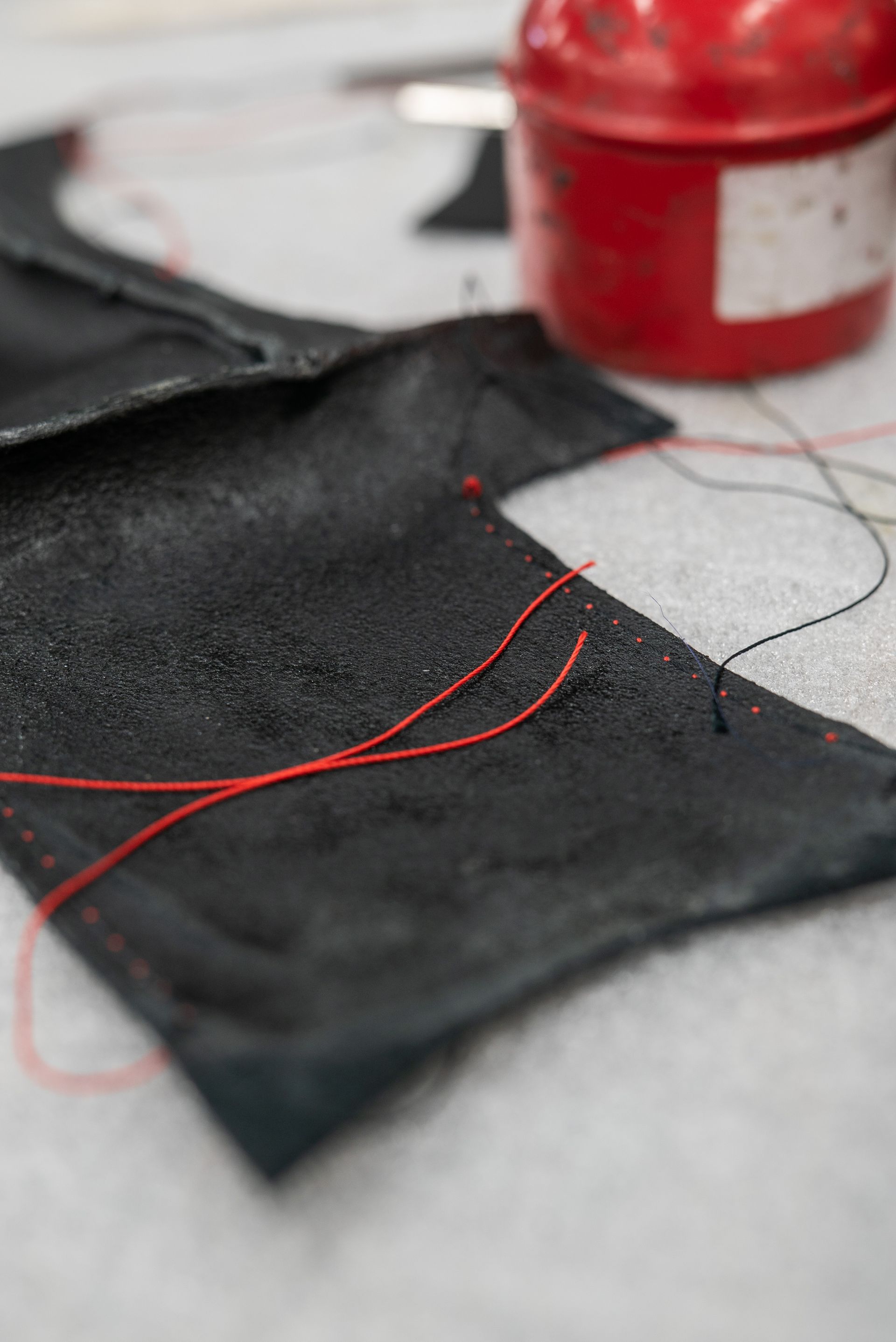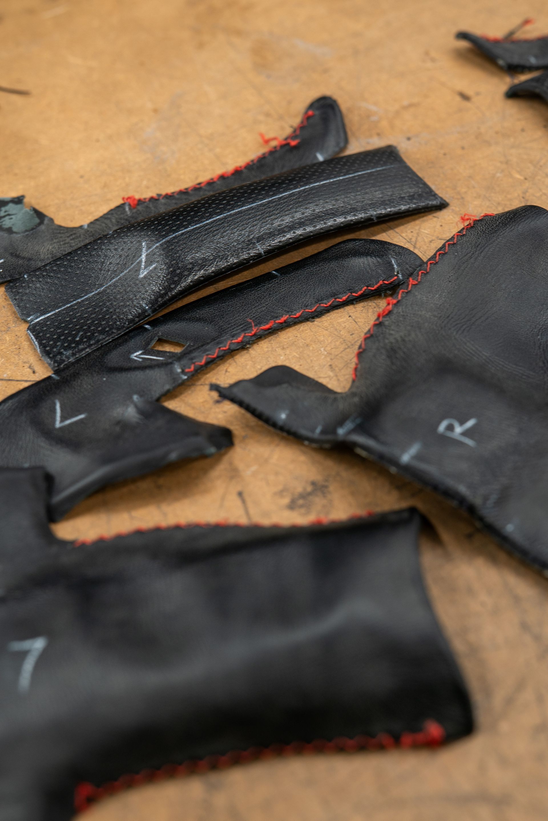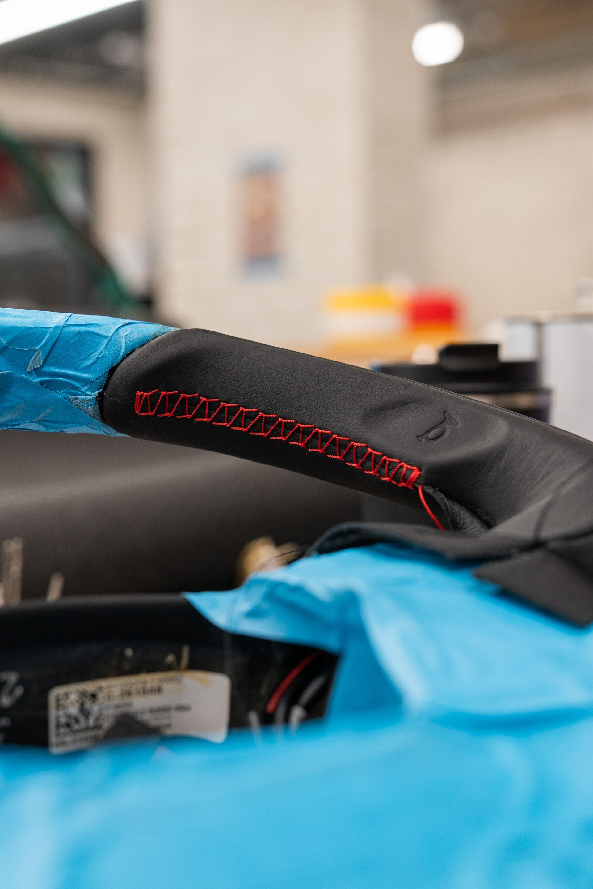 We used Ferrari black nappa leather for the wheel, ensuring an OEM finish. We aslo had the correct horn push plate for debossing on file, a common detail often missed on wheel retrims. The thread came from our very own d:class autoshop, where we supply and sell official Ferrari threads.