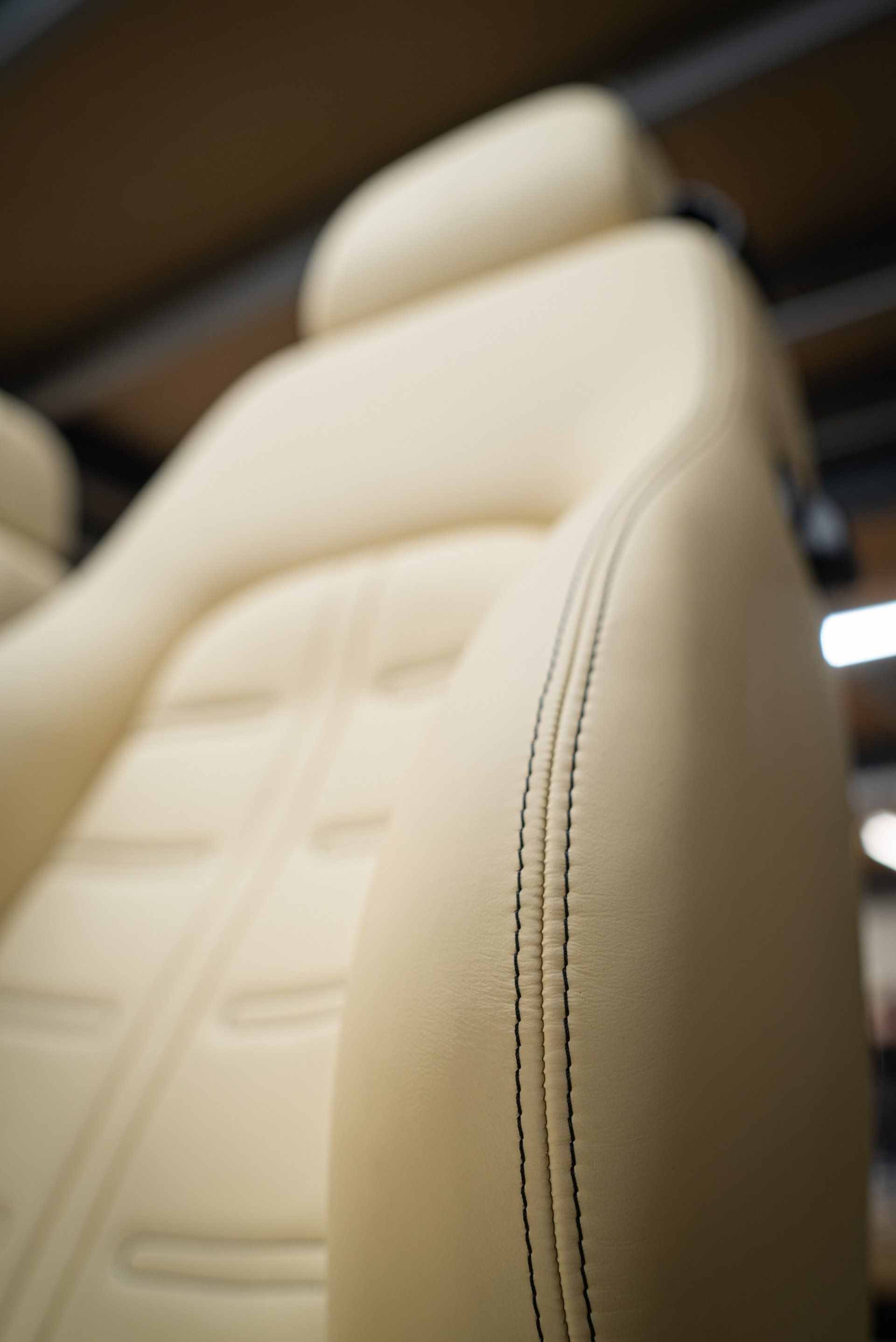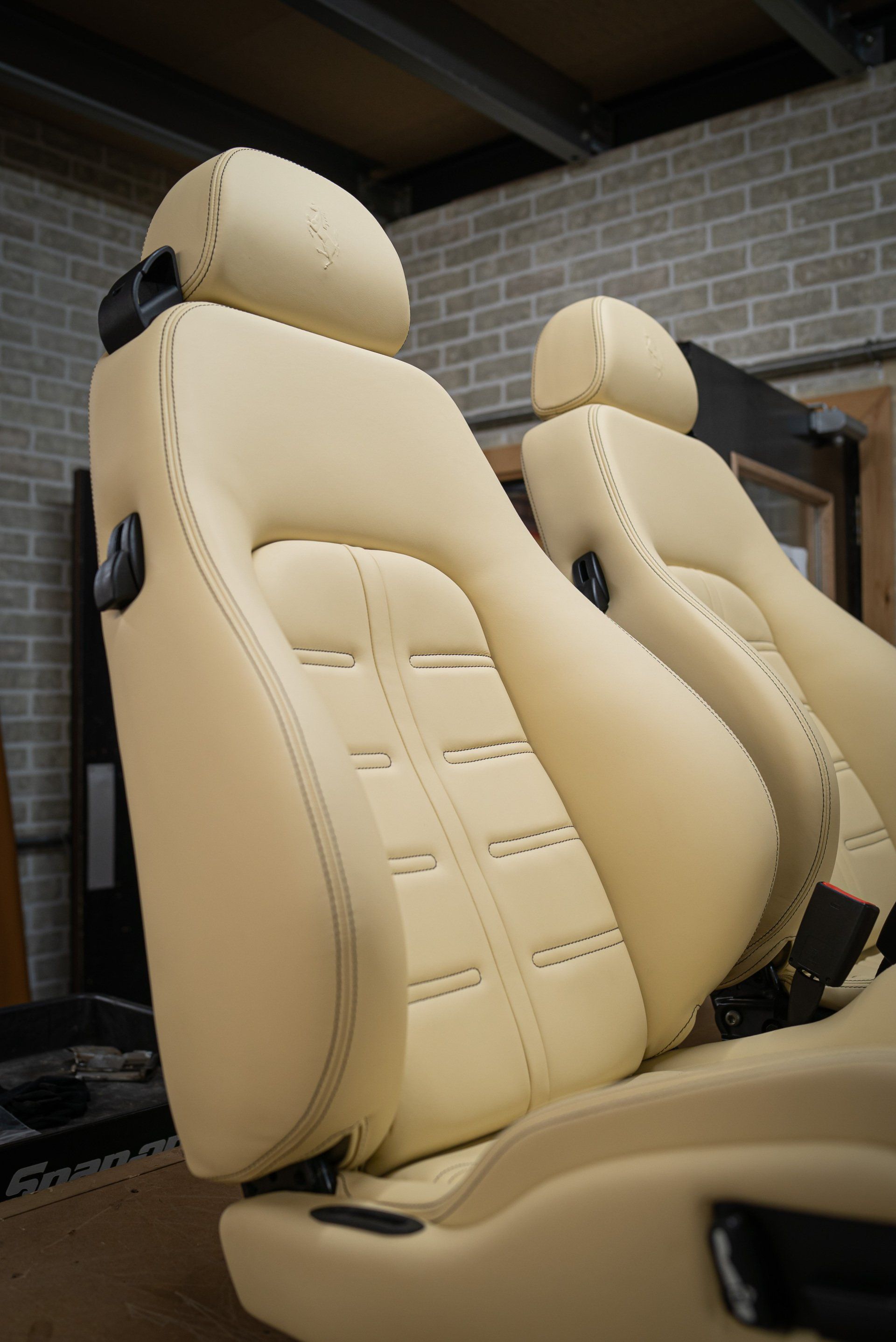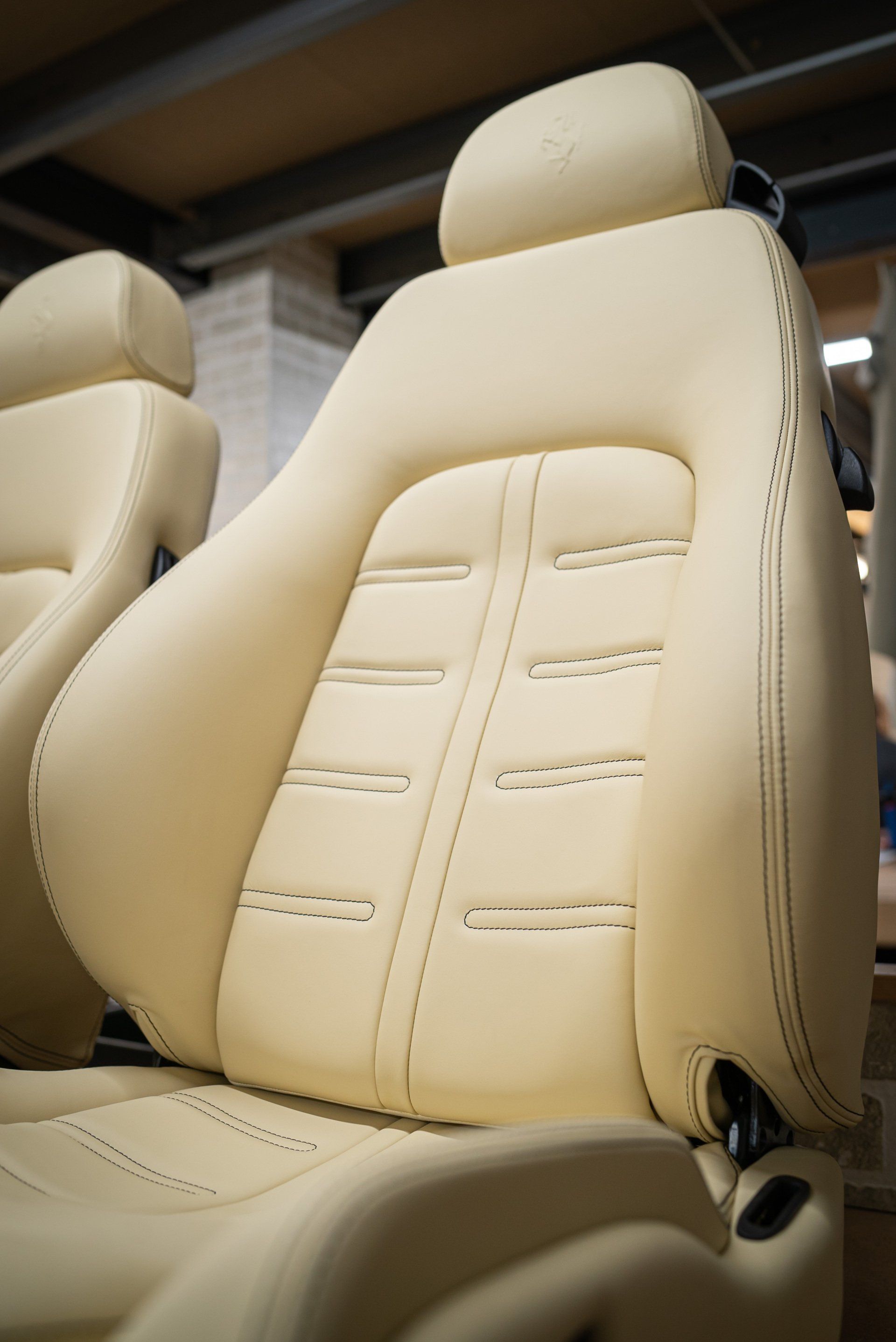A pair of Ferrari 575 seats came to d:class HQ for a full retrim. We used Autolux Magnolia nappa leather supplied from @ukhideco . The headrests have been embossed with Ferrari's prancing horse emblem, contrast black stitching has been sewn into the seat centres recreating the OEM design and both upper and lower seat bolsters.