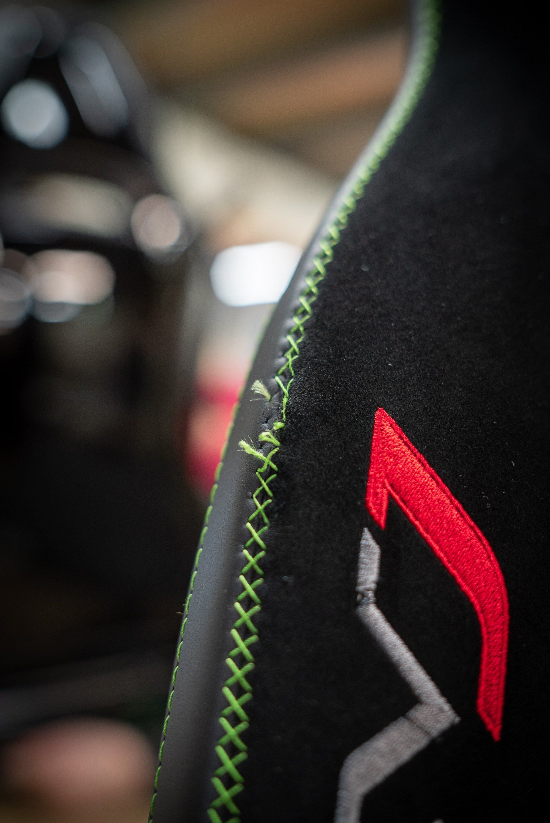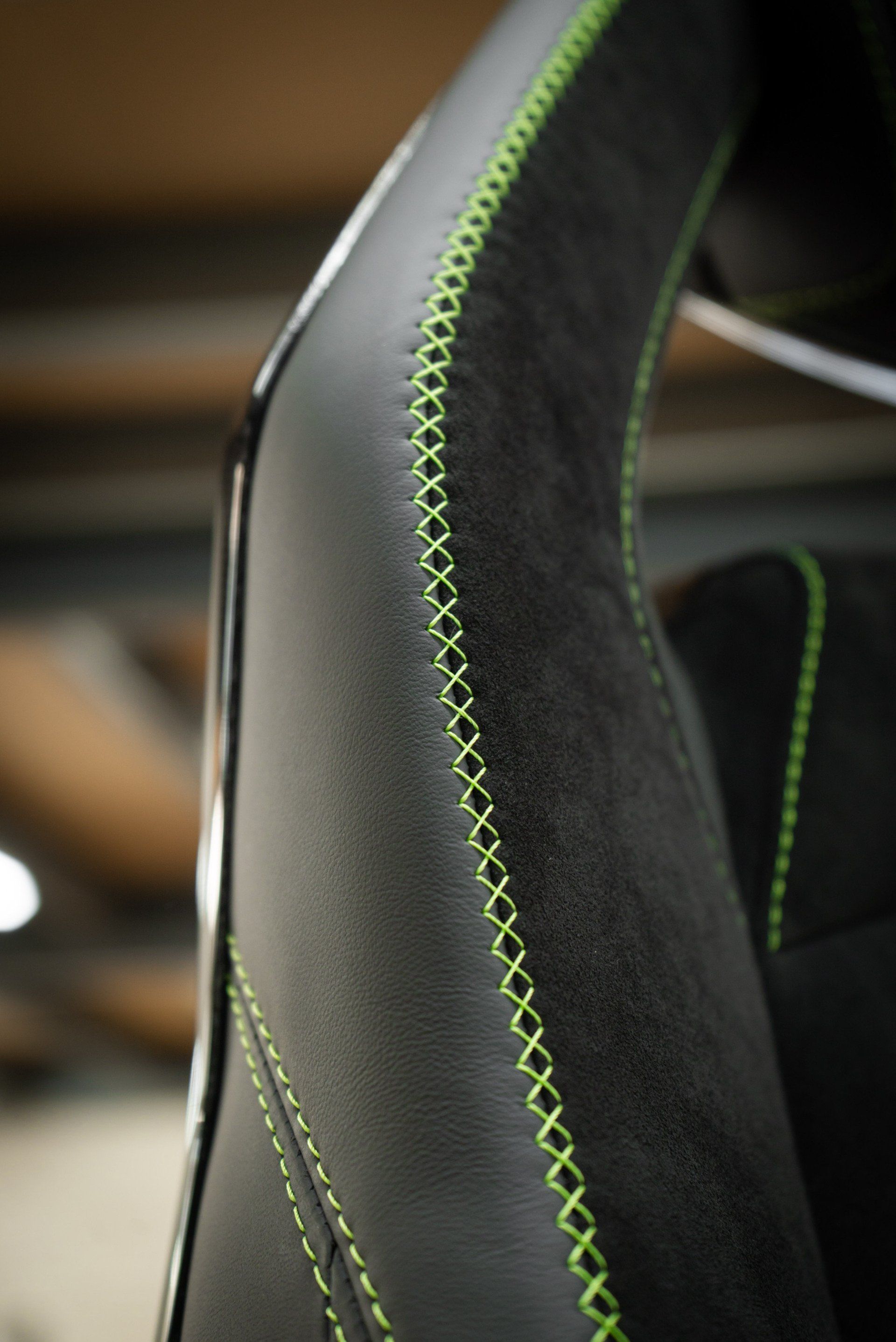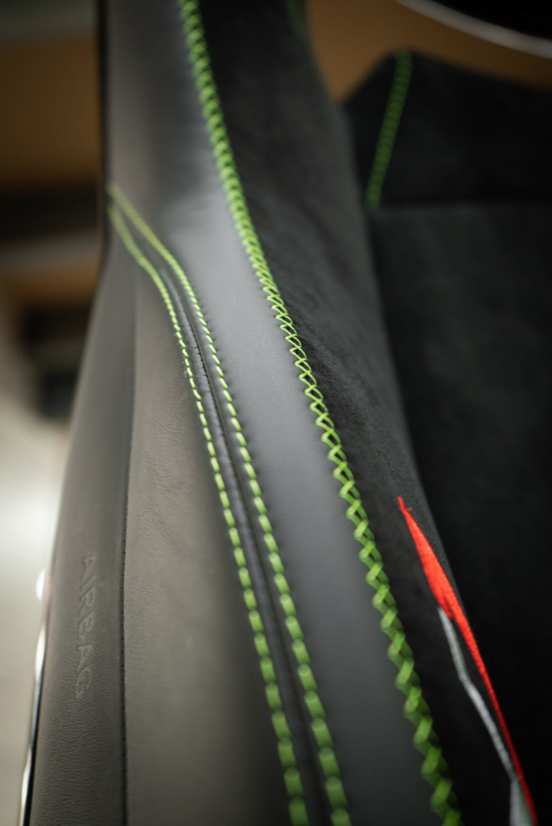 This Lamborghini Aventador SVJ seat came to us for a bolster repair from a dealership. Due to the embroidery and the decorative cross stitch being damaged, replacing the bolster panels was the only way to properly repair the seat. We used our ornamental sewing machine to recreate the cross stitch design. Also, we replaced the embroidered 'SVJ' logo on to a new piece of black Alcantara. The seat bolster panels were then sewn back together and attached to the seat cover, completing this job.