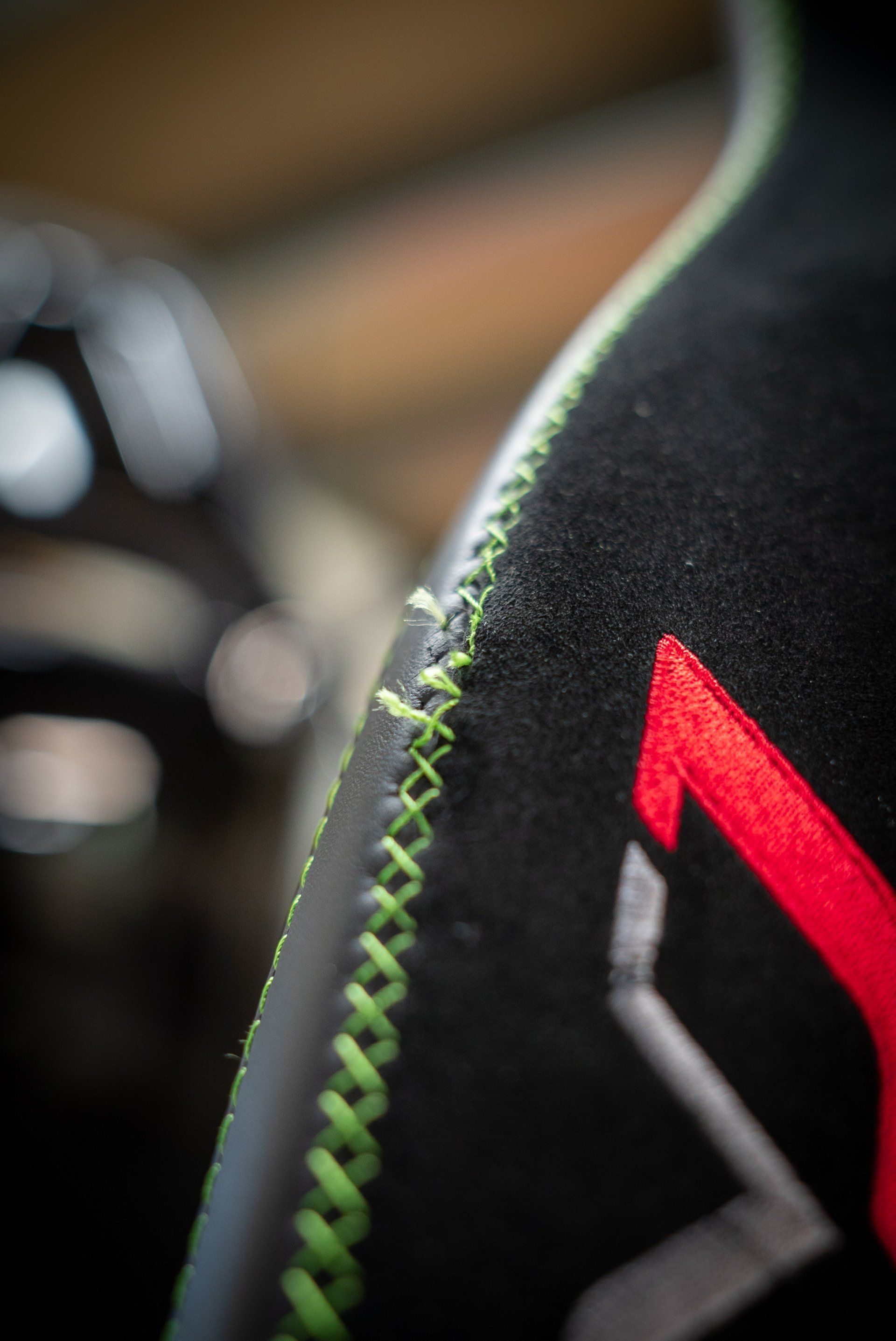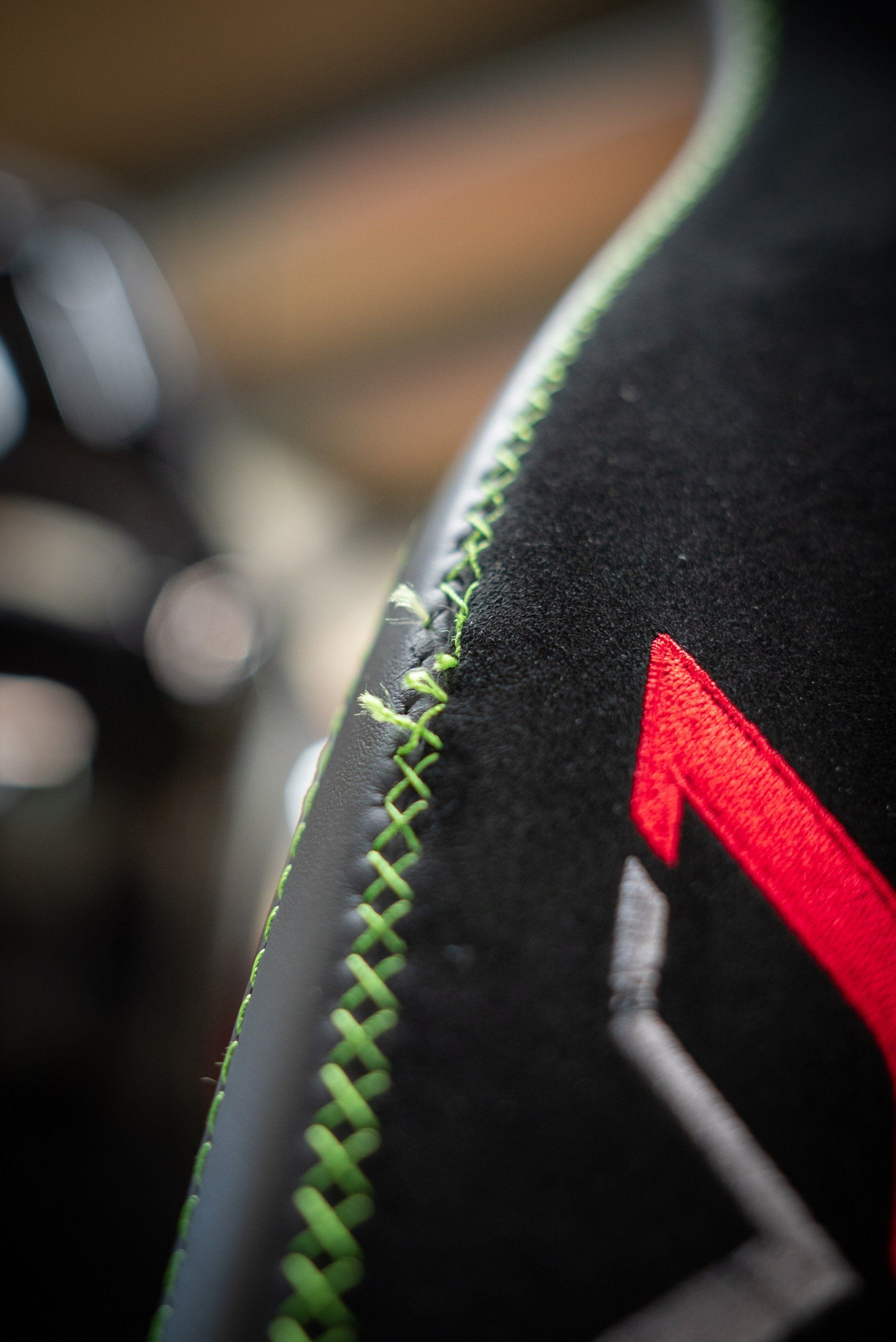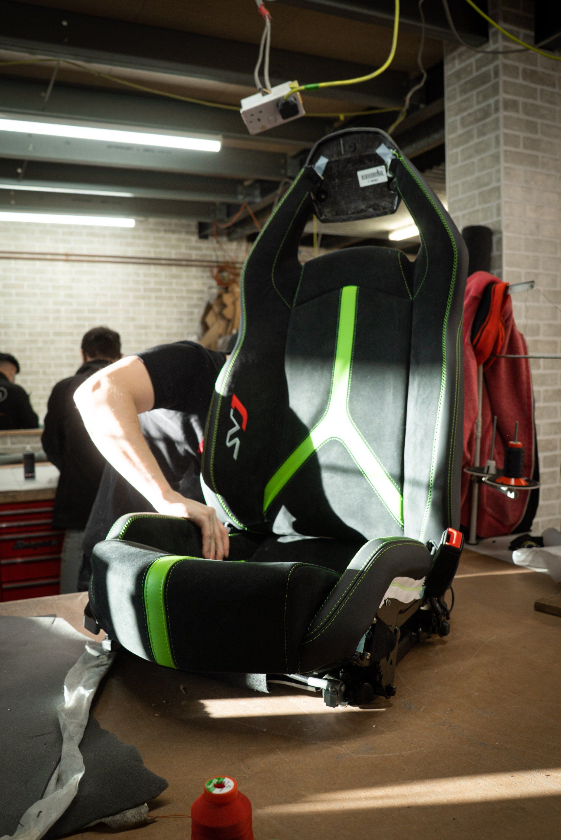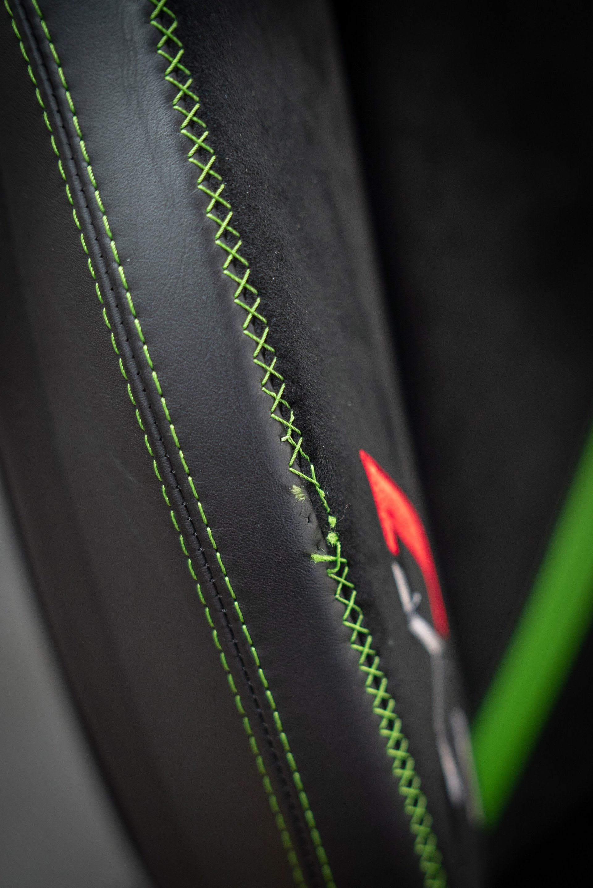 This Lamborghini Aventador SVJ seat came to us for a bolster repair from a dealership. Due to the embroidery and the decorative cross stitch being damaged, replacing the bolster panels was the only way to properly repair the seat. We used our ornamental sewing machine to recreate the cross stitch design. Also, we replaced the embroidered 'SVJ' logo on to a new piece of black Alcantara. The seat bolster panels were then sewn back together and attached to the seat cover, completing this job.