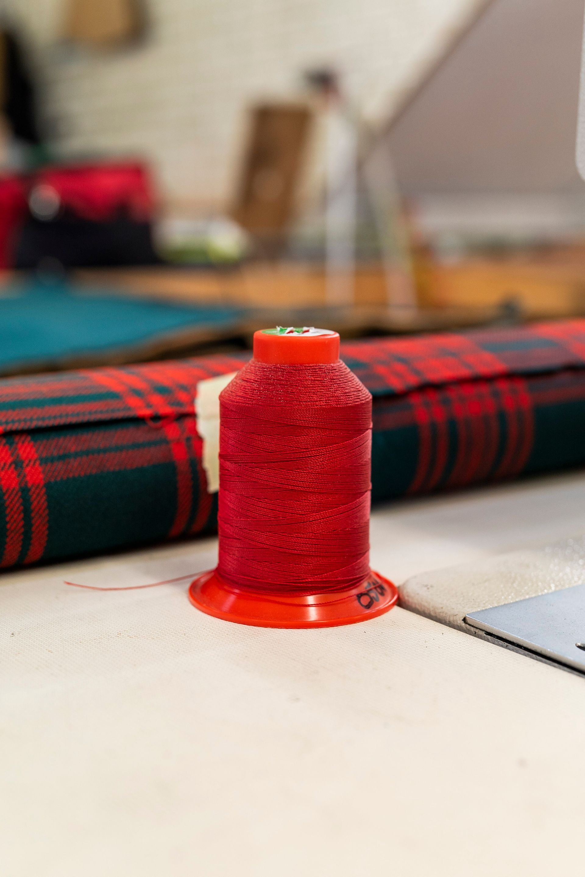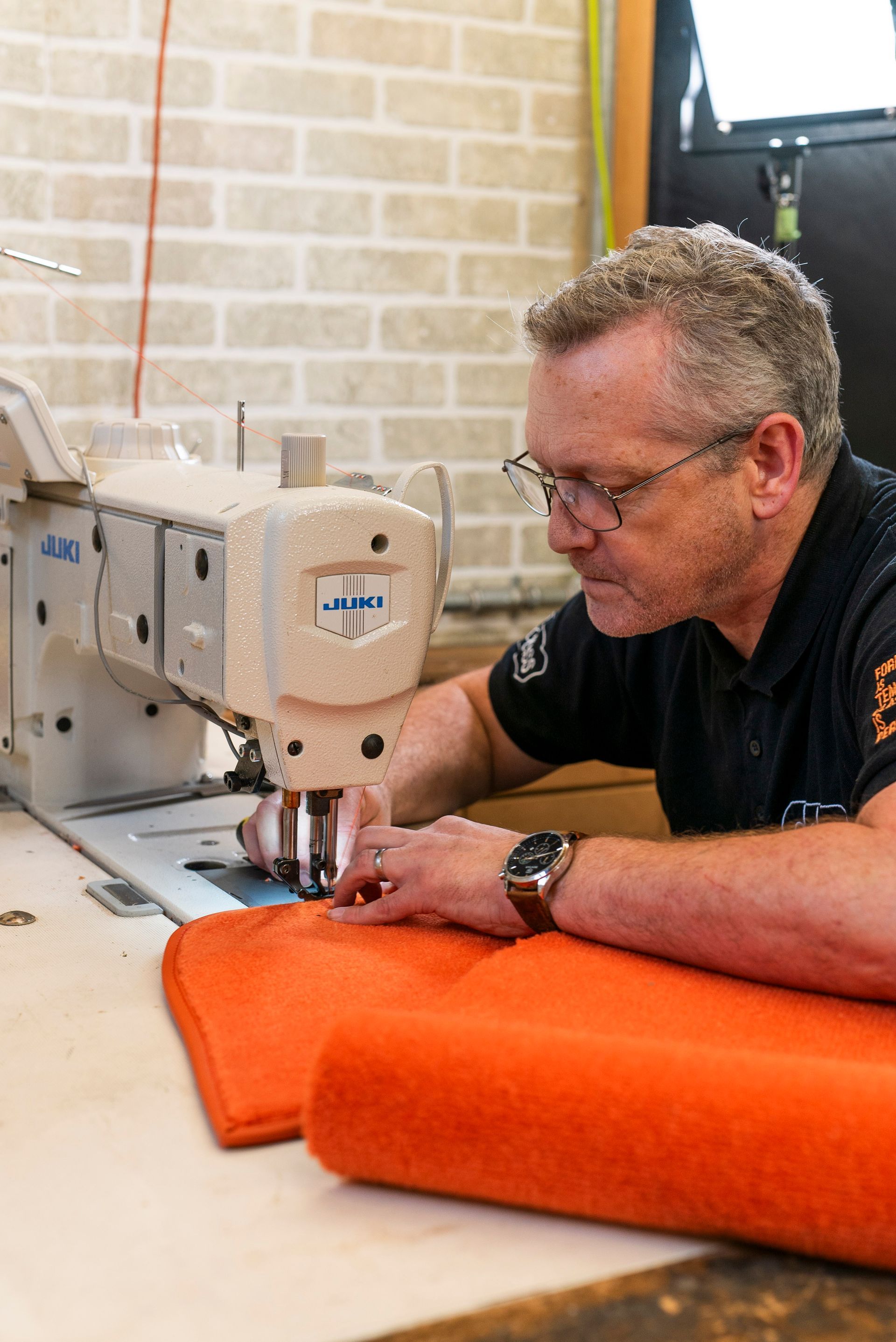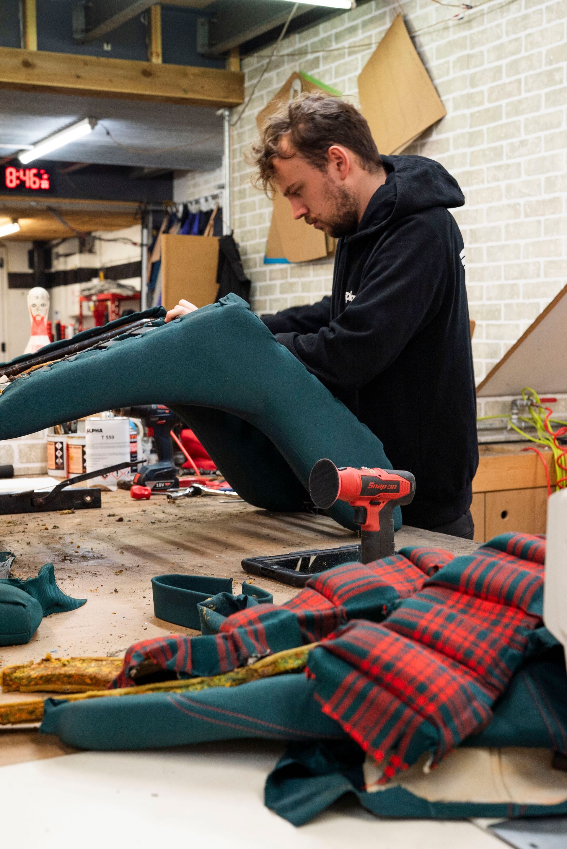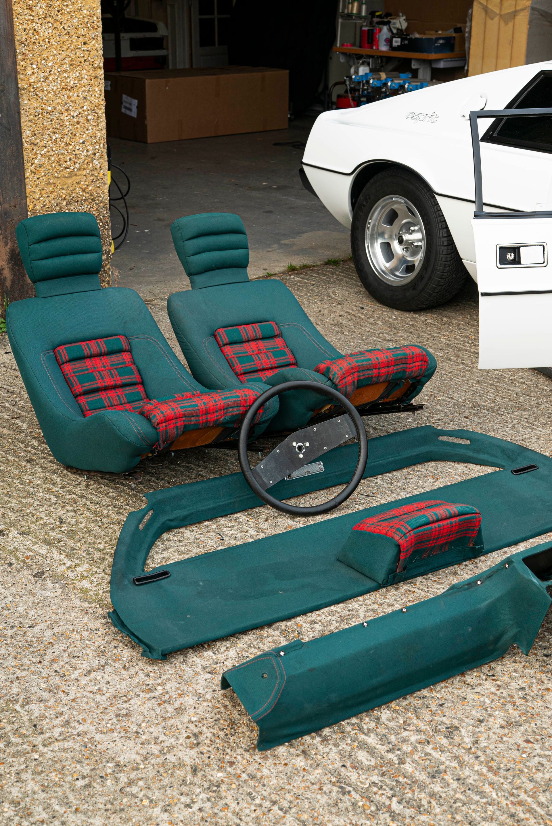 A difficult material to locate was the red and green tartan cloth. From our knowledge, the only vehicle to run this exact material was the Lotus Esprit. After following rumours and whispers about a potential supplier in the UK, a single roll of material was purchased. Matching Green cloth and orange carpet were also sourced and purchased.