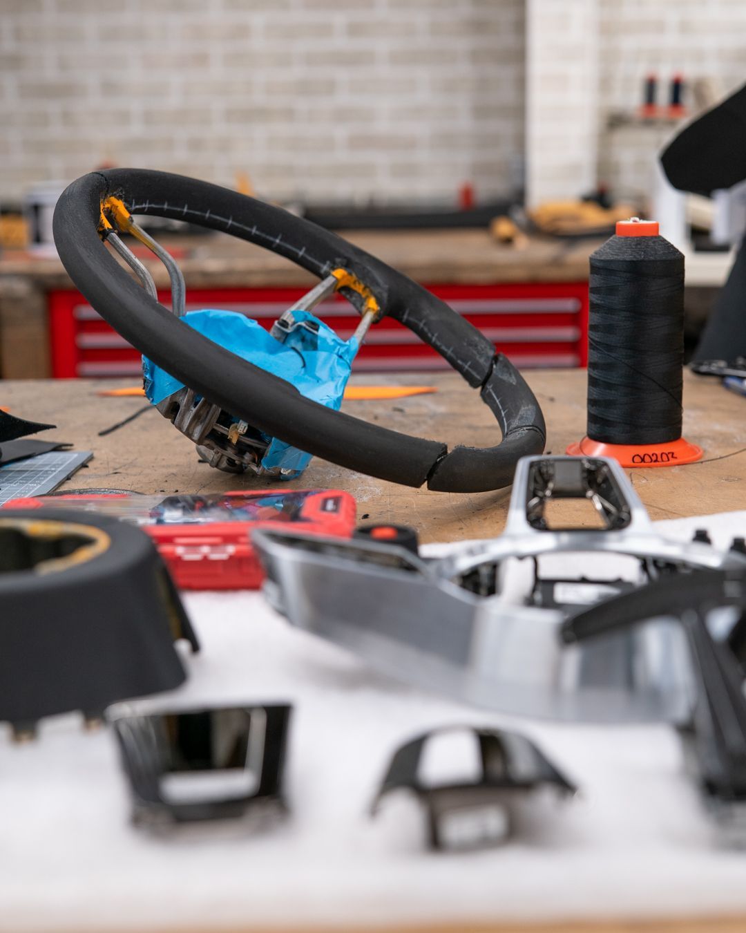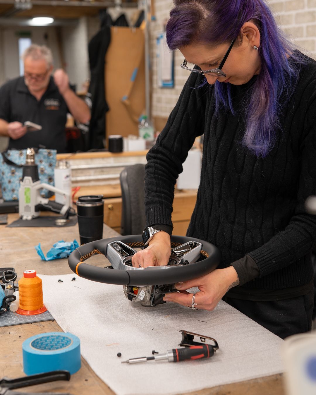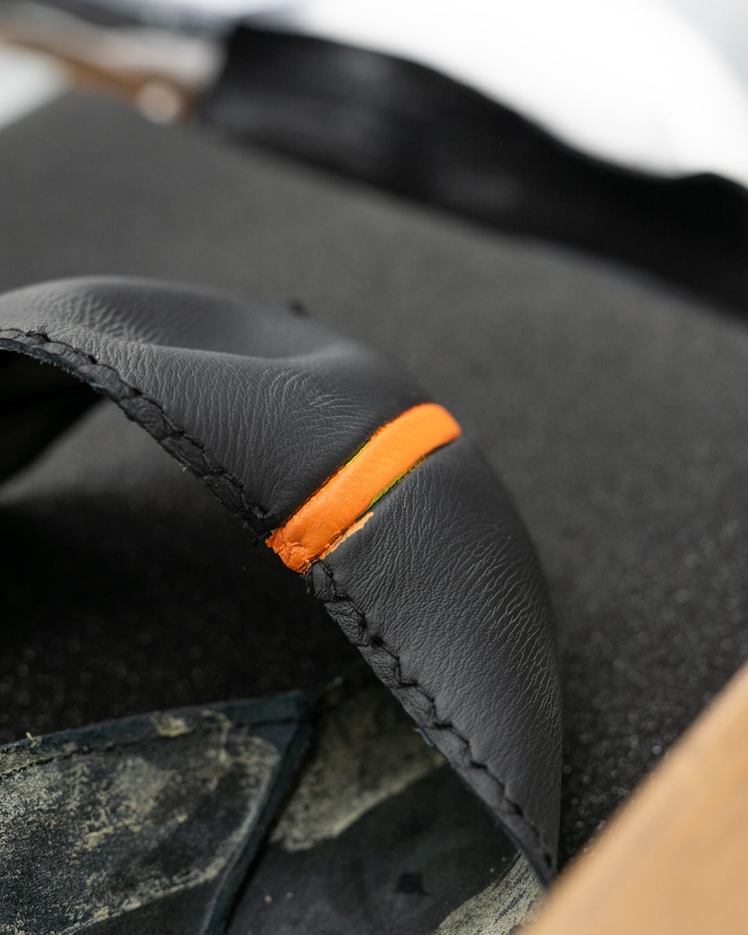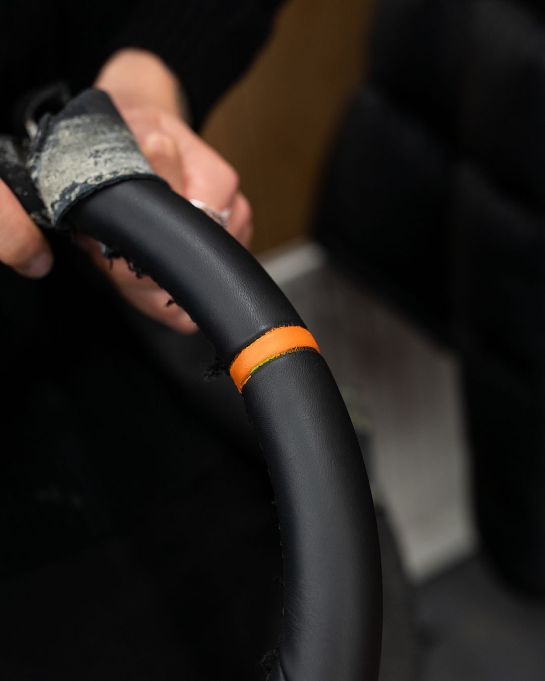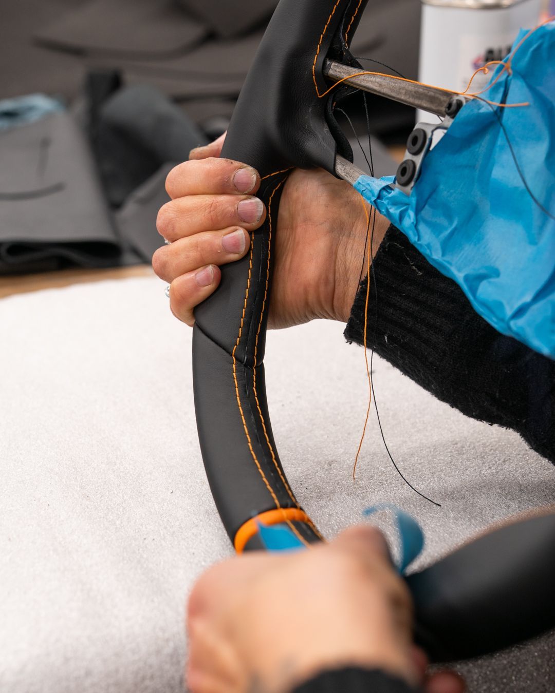 Using the correct Porsche black and orange nappa leather, we retrimmed this wheel to OEM standard, perhaps improved. The orange stitching is Porsche Spyder orange, which is sold on our online store here, along with plenty of other manufacturer threads, not just Porsche.