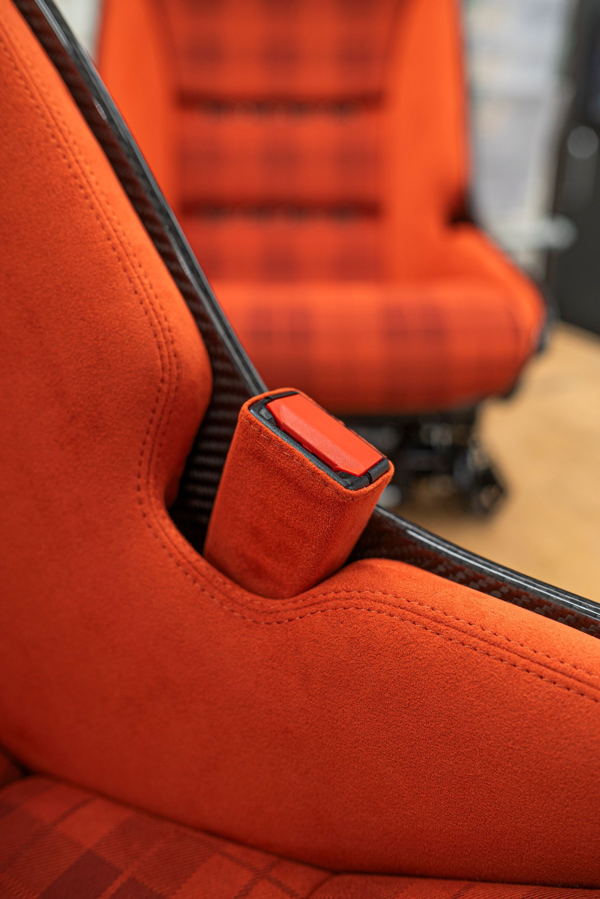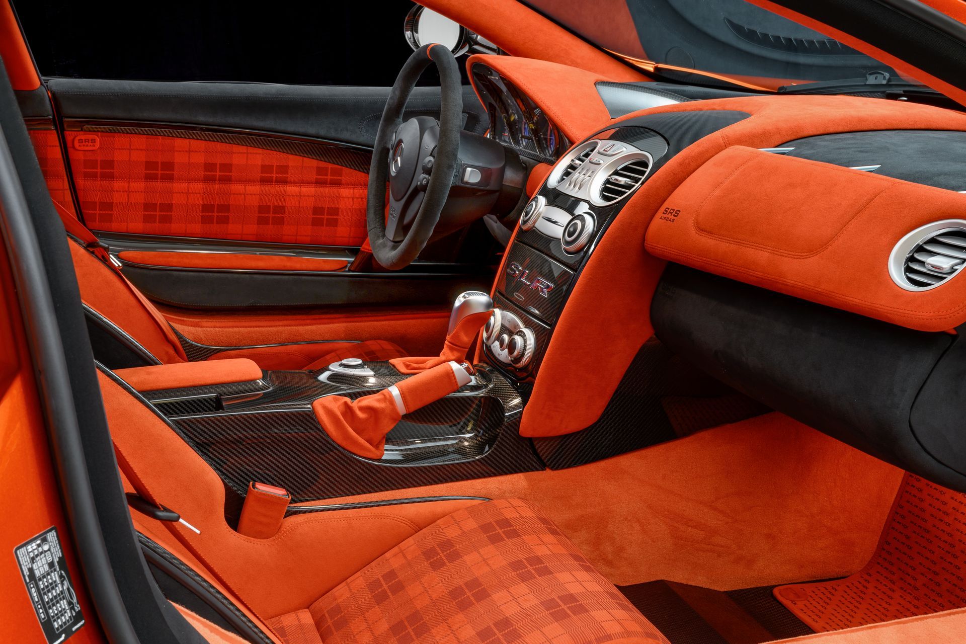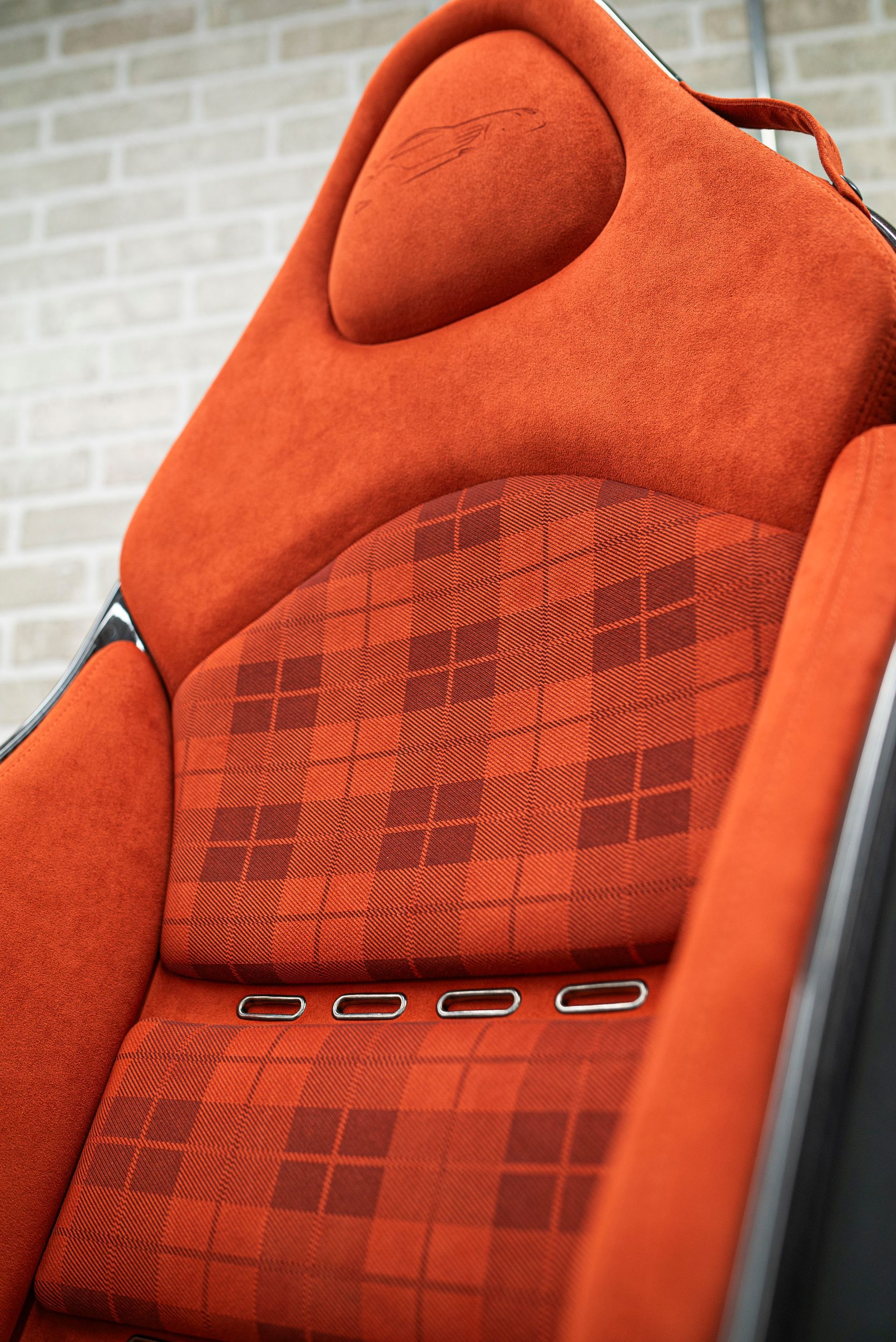 Fully bespoke Mercedes-Benz SLR McLaren seats, retrimmed in volcano orange Alcantara featuring lasered tartan pattern centres and black alcantara seat backs.