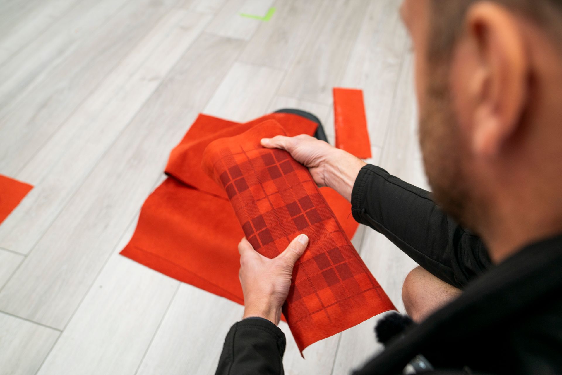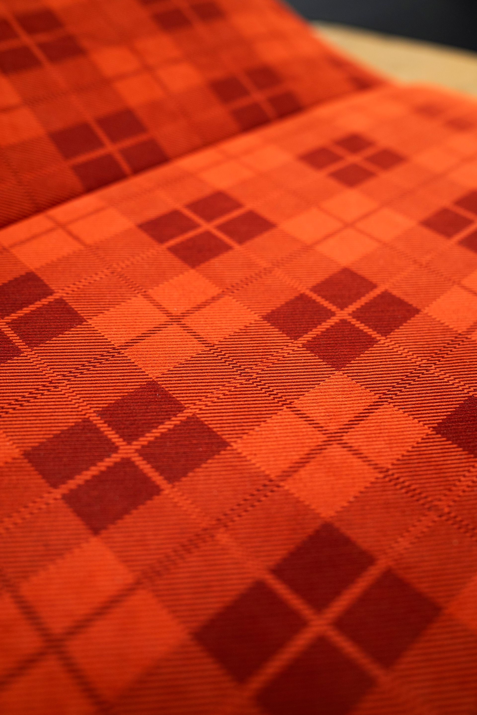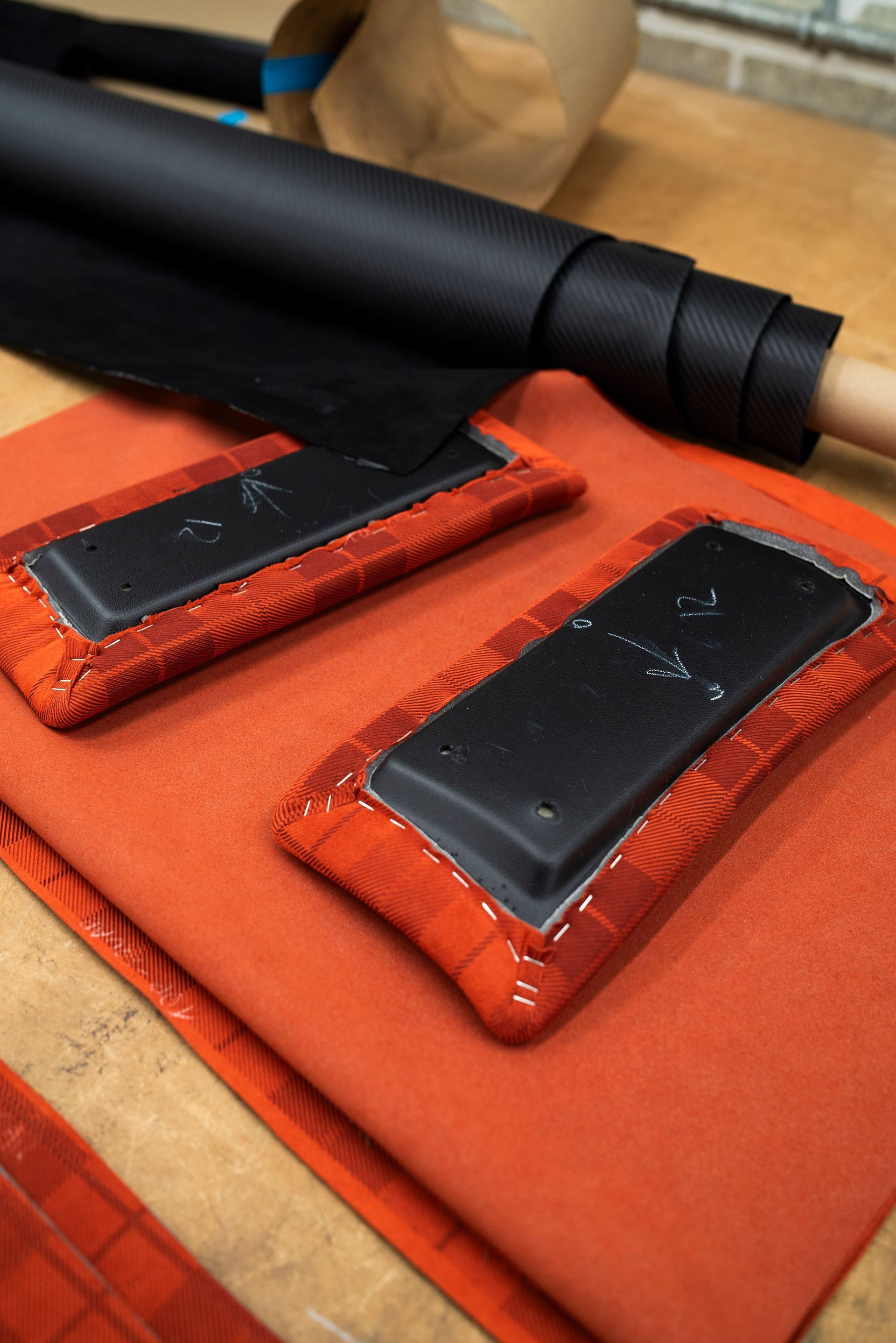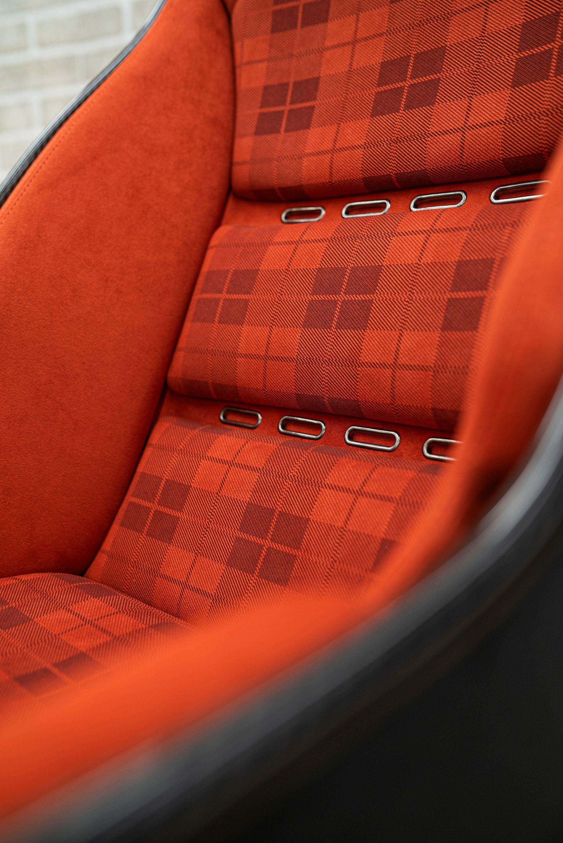 Fully bespoke Mercedes-Benz SLR McLaren seats, retrimmed in volcano orange Alcantara featuring lasered tartan pattern centres and black alcantara seat backs.