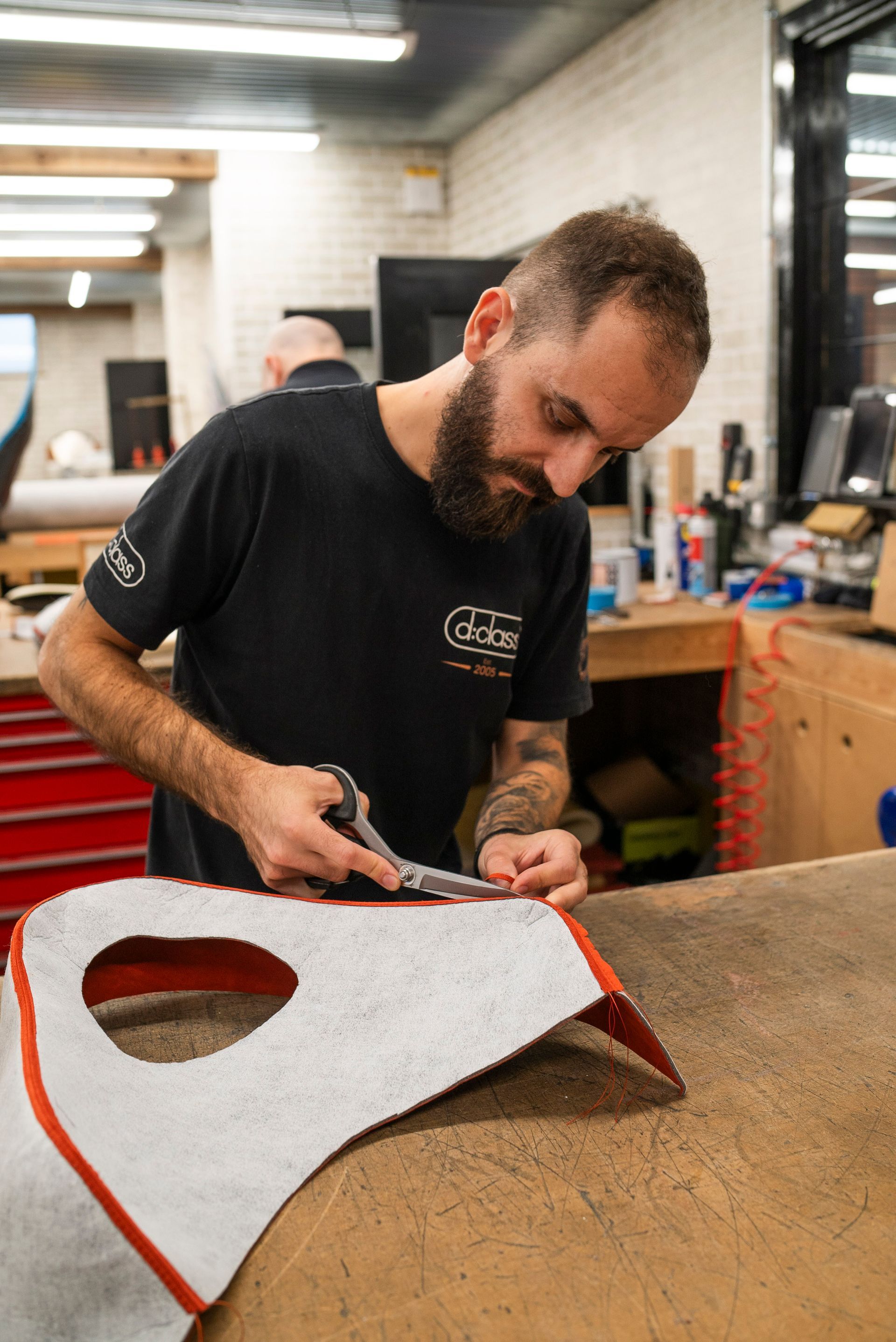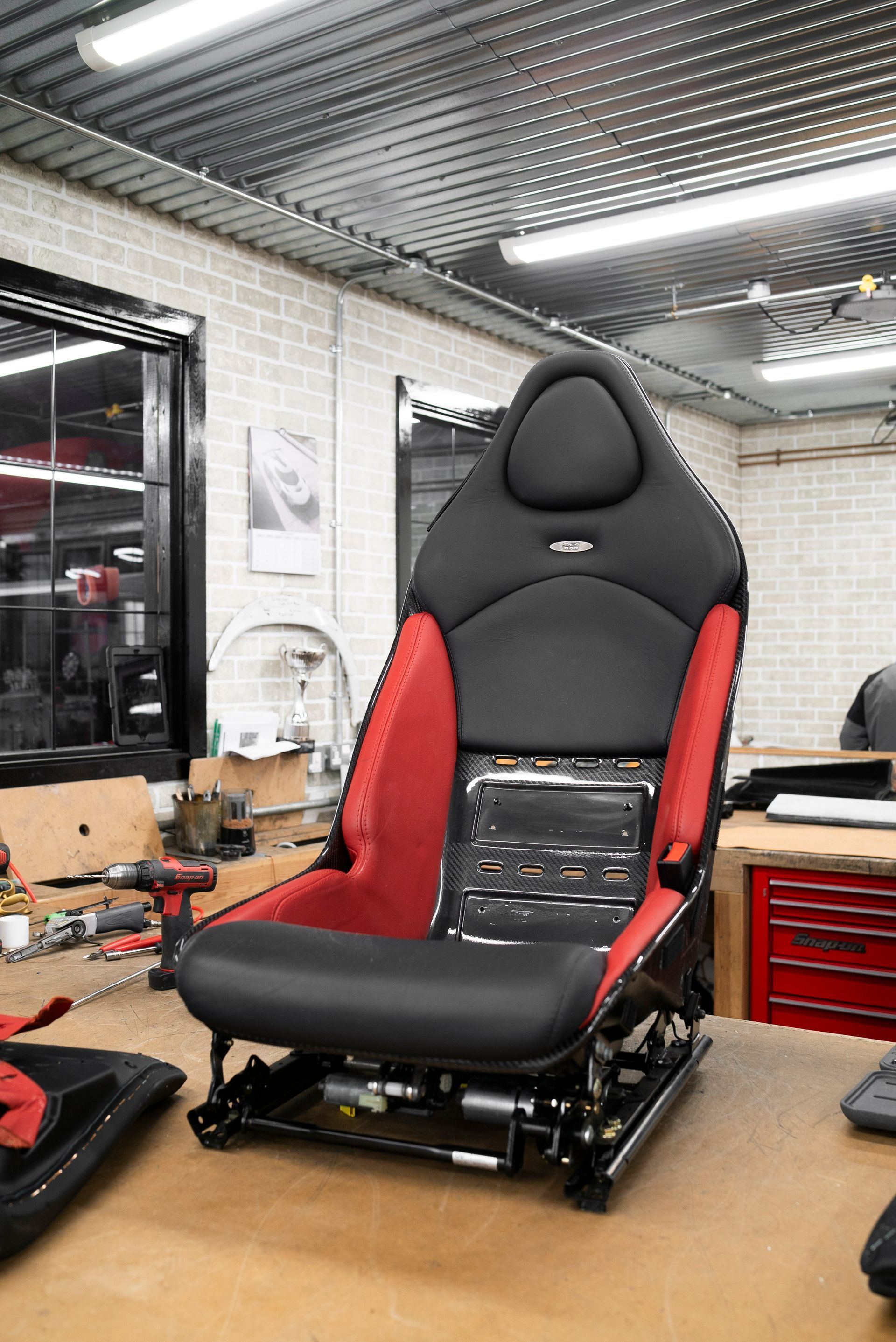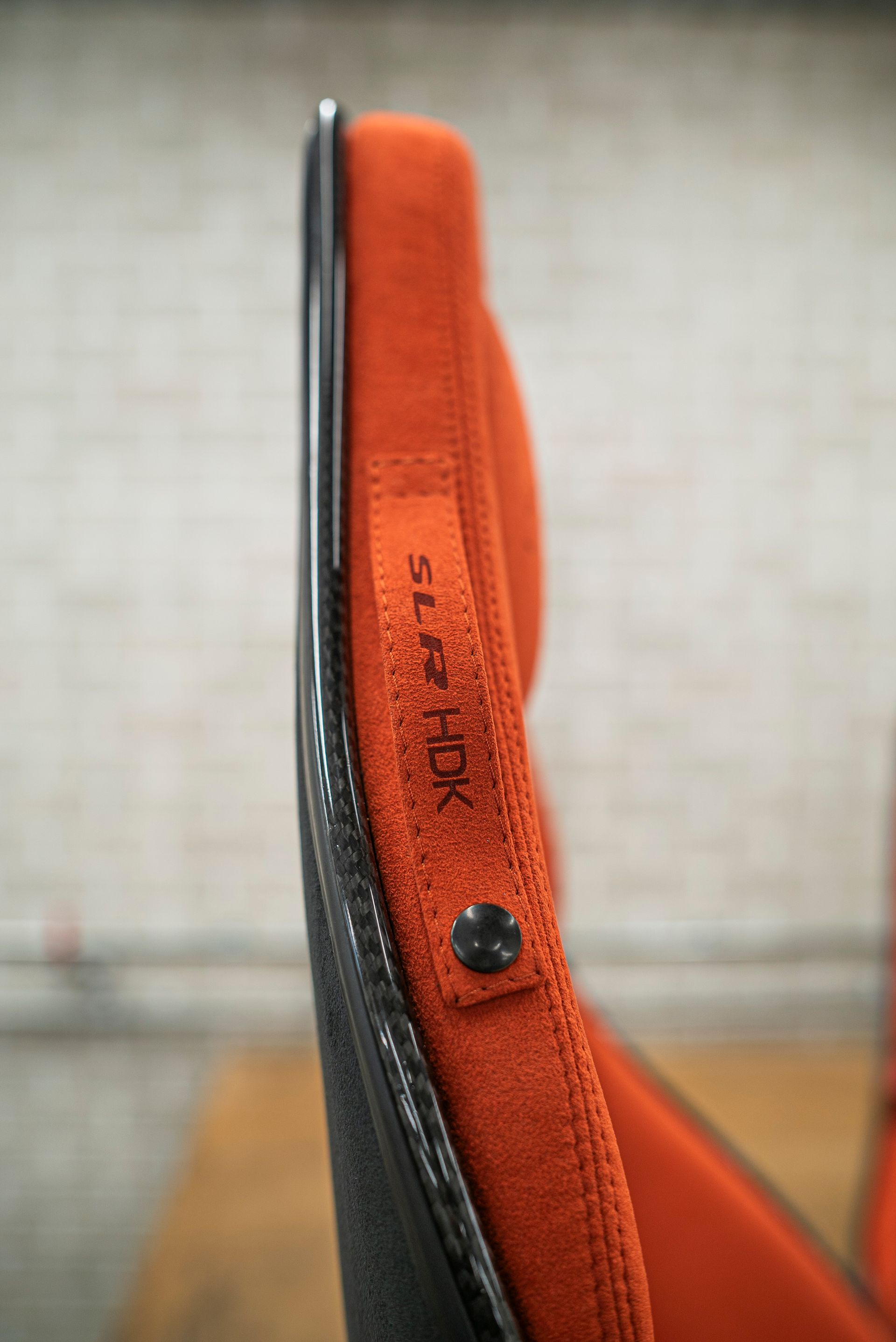 To pay respects to the SLR 722 GT and its tartan interior, we wanted an orange tartan to match this. However, they did not make an orange tartan. This is where Formation Industries came in. Formation Industries can create essentially anything you can think of... literally, 3D printing, bespoke tools, super rare materials, lasering and much much more. We have worked with Chris for many years on plenty of projects, so we set Chris the task of recreating tartan through his lasering machine. As you can see, this came out perfectly and we had to explain to many people at SEMA that it is indeed lasered Alcantara. Note the SLR HDK lasered belt straps and SLR HDK silhouette in the headrests.