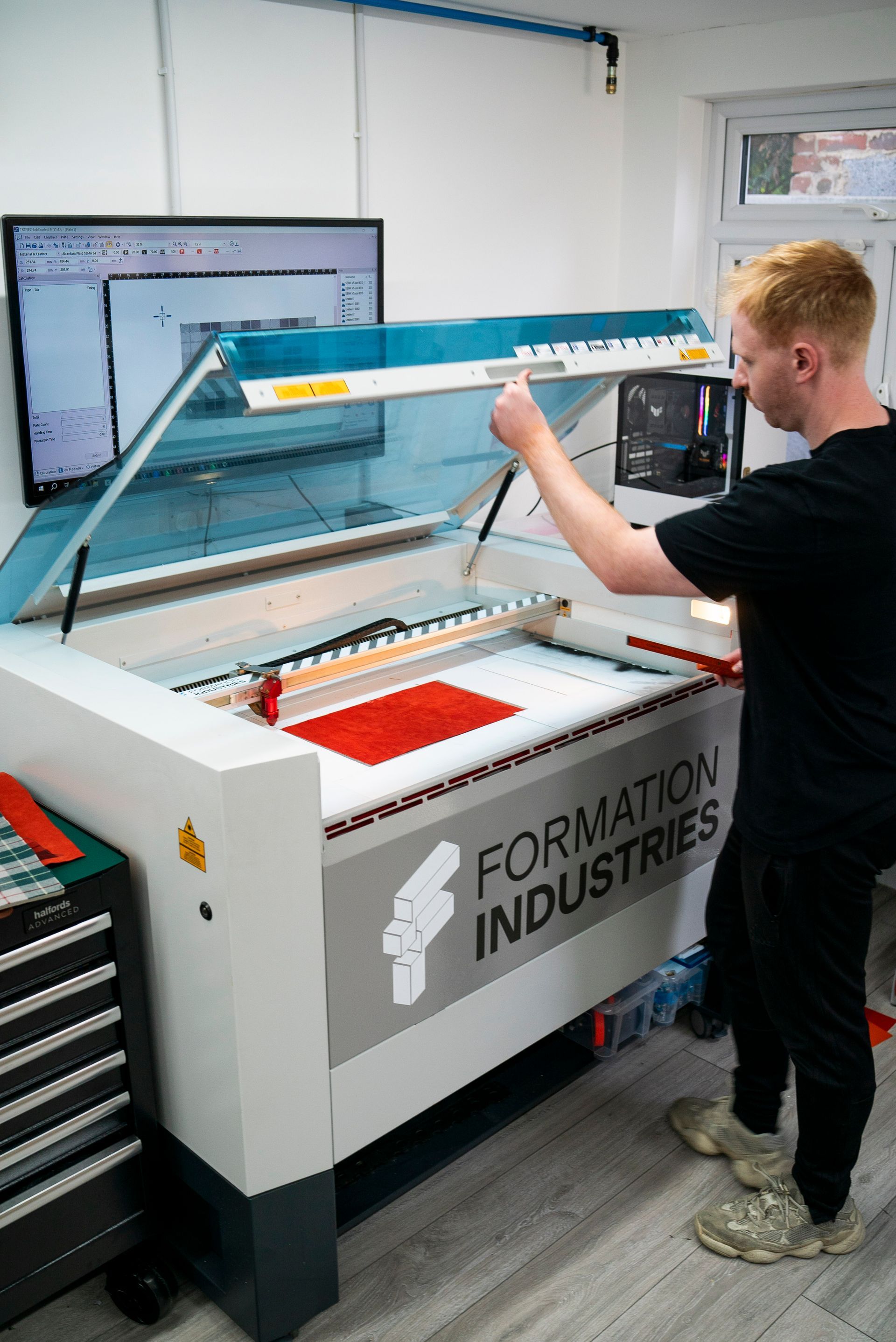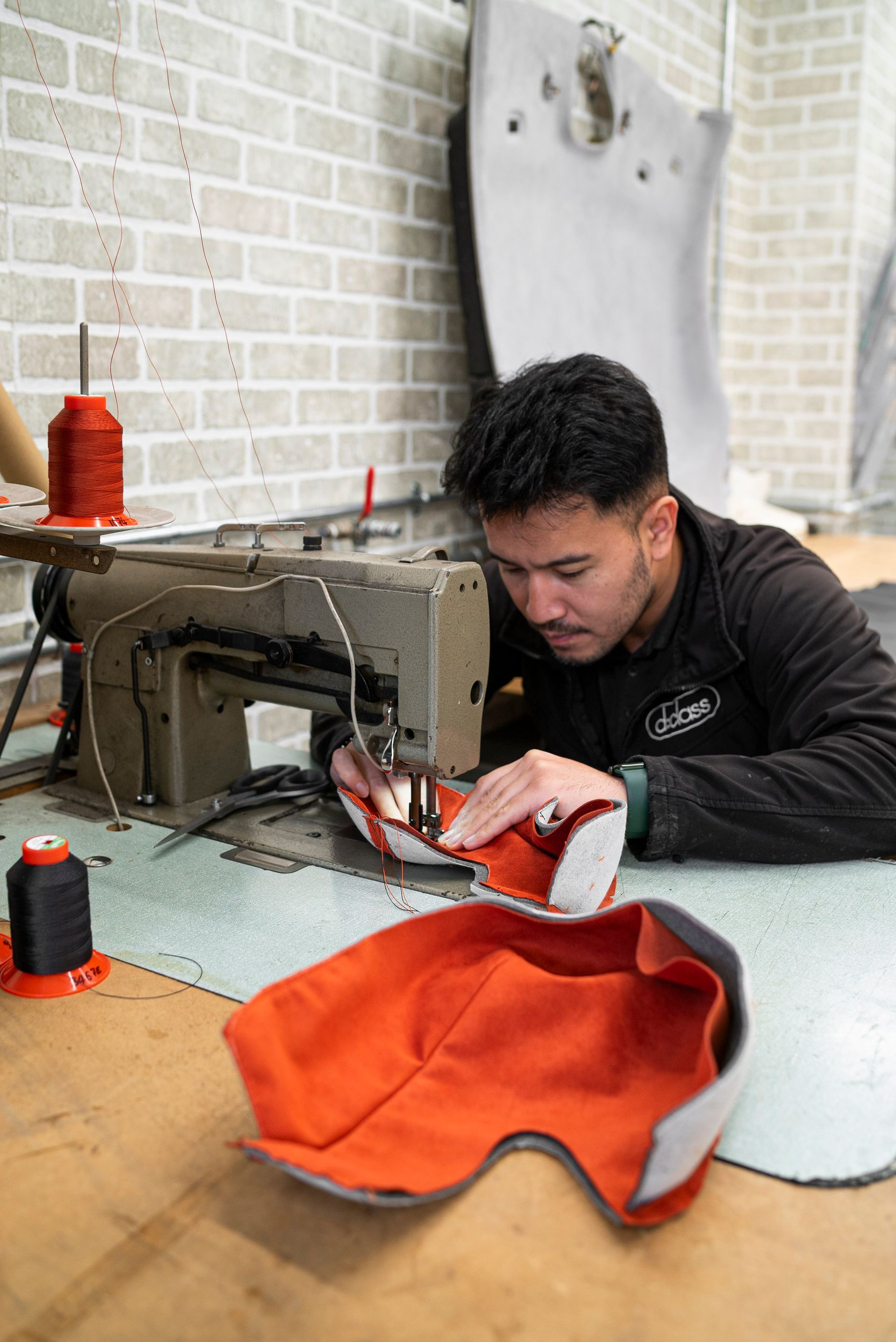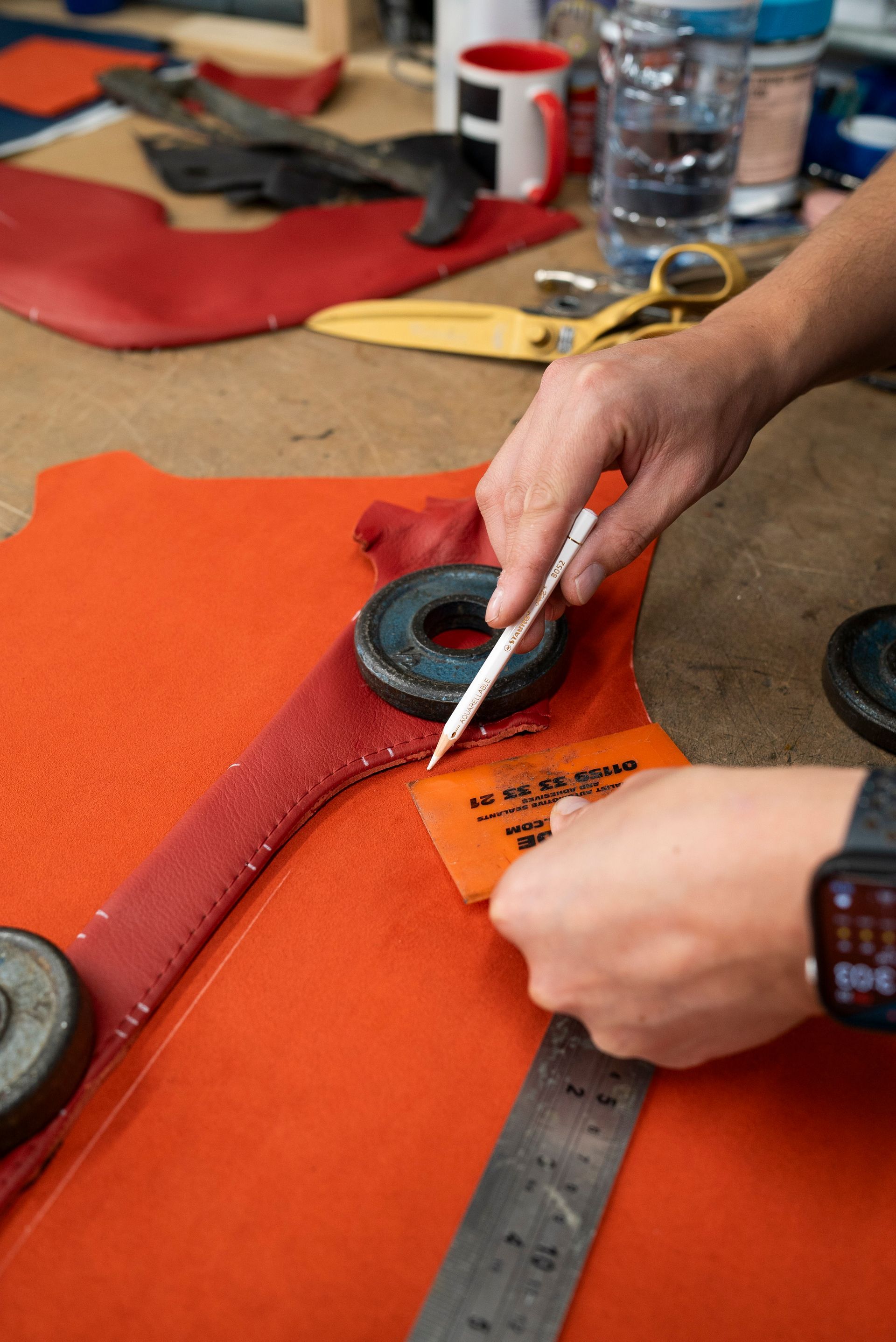 To pay respects to the SLR 722 GT and its tartan interior, we wanted an orange tartan to match this. However, they did not make an orange tartan. This is where Formation Industries came in. Formation Industries can create essentially anything you can think of... literally, 3D printing, bespoke tools, super rare materials, lasering and much much more. We have worked with Chris for many years on plenty of projects, so we set Chris the task of recreating tartan through his lasering machine. As you can see, this came out perfectly and we had to explain to many people at SEMA that it is indeed lasered Alcantara. Note the SLR HDK lasered belt straps and SLR HDK silhouette in the headrests.
