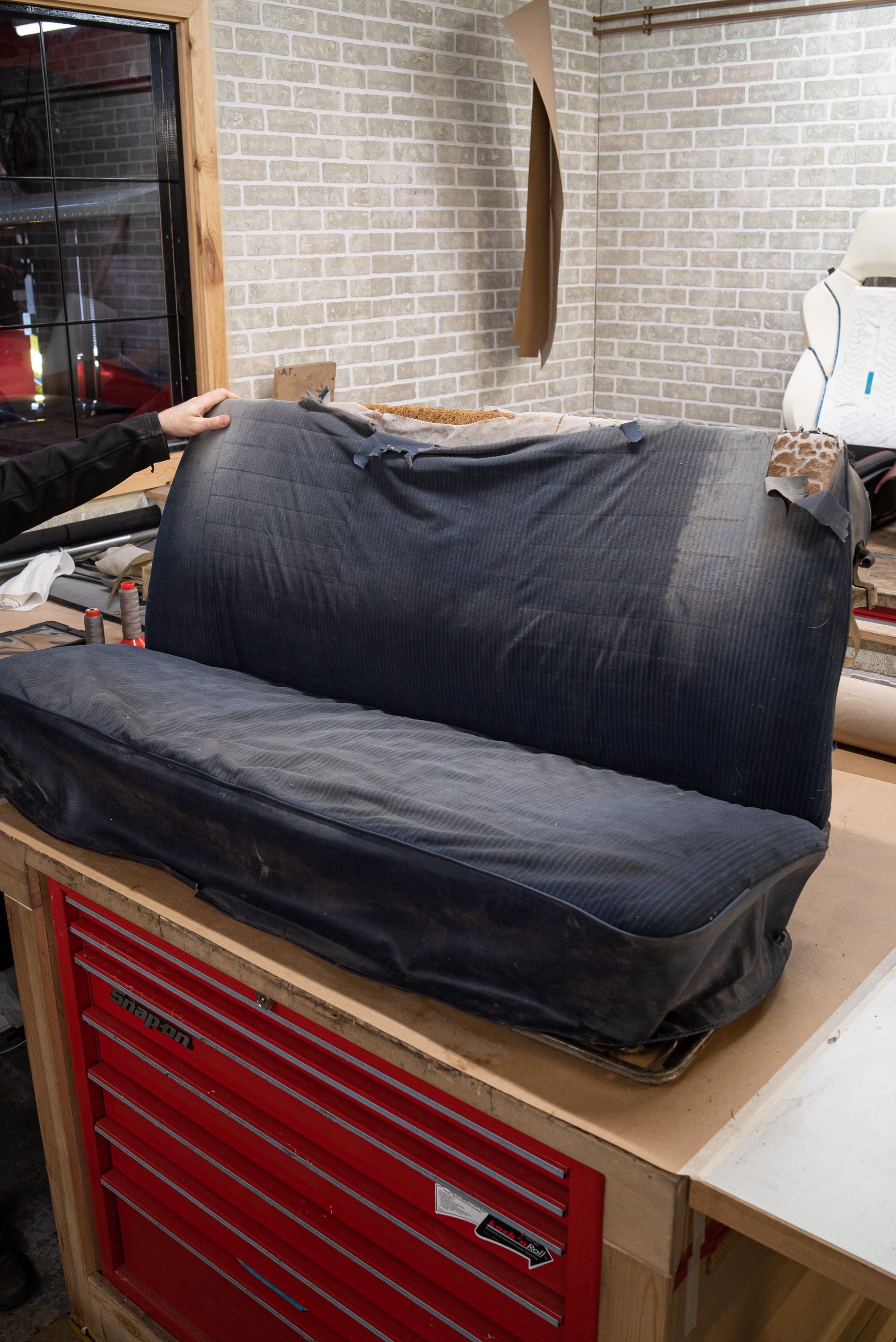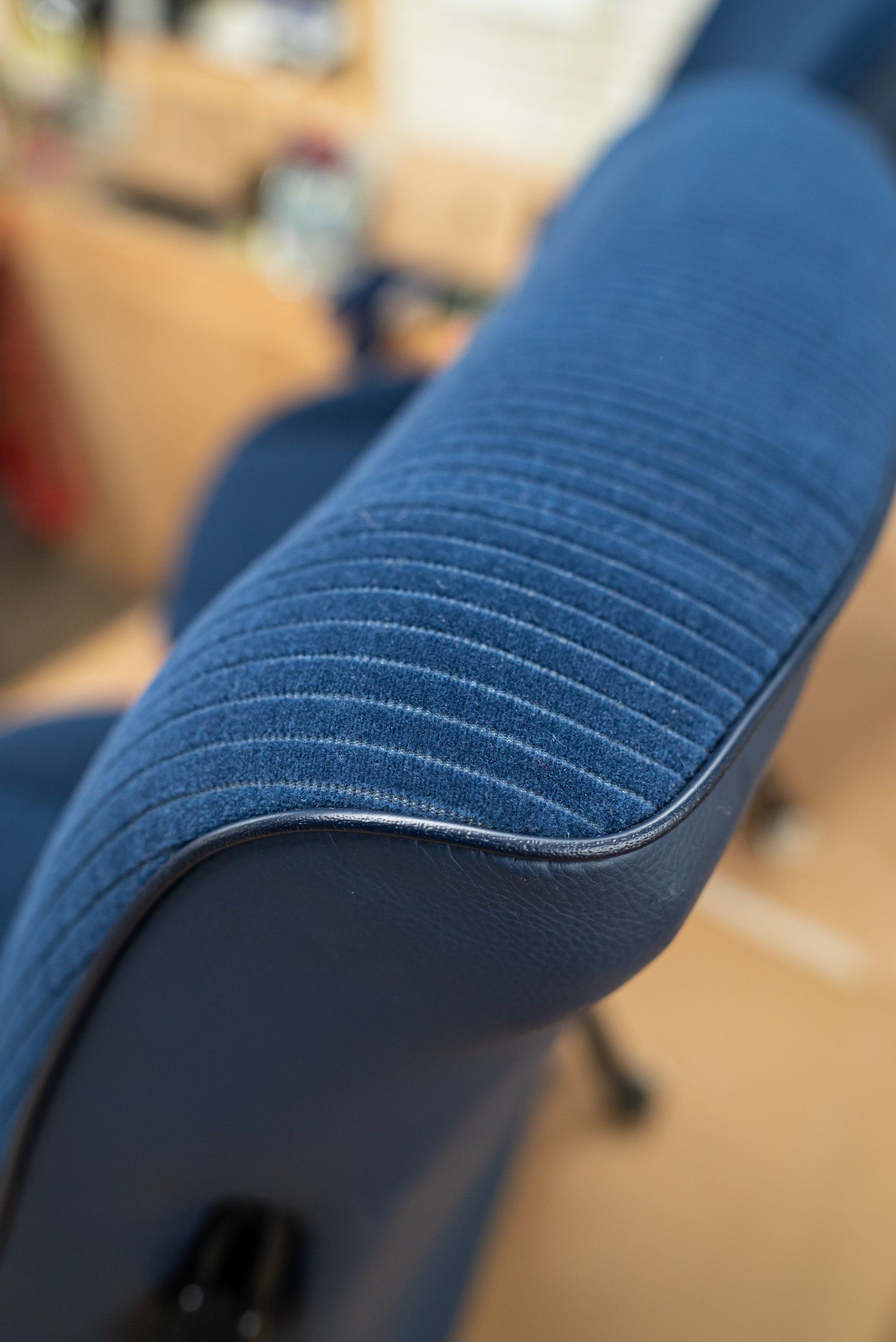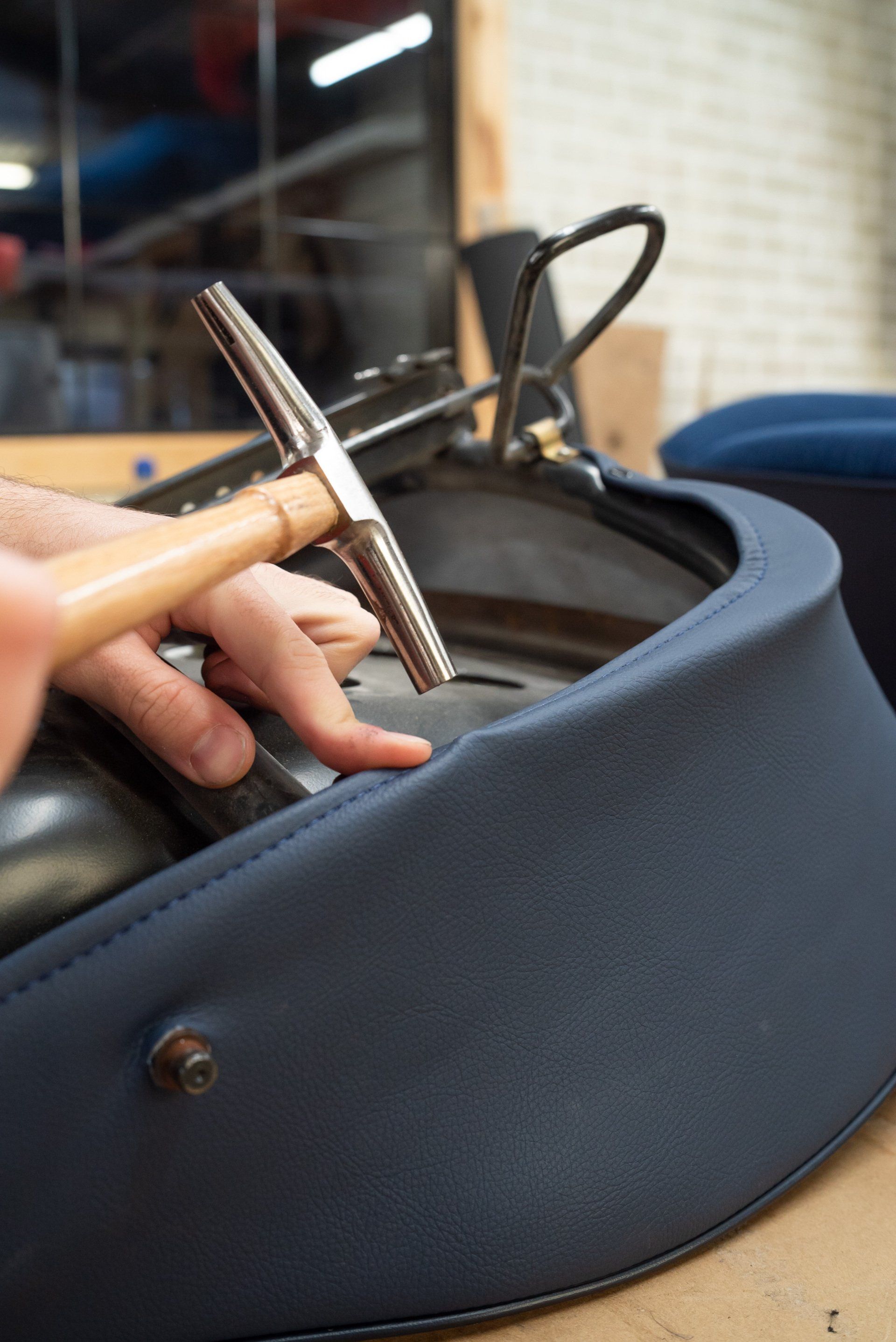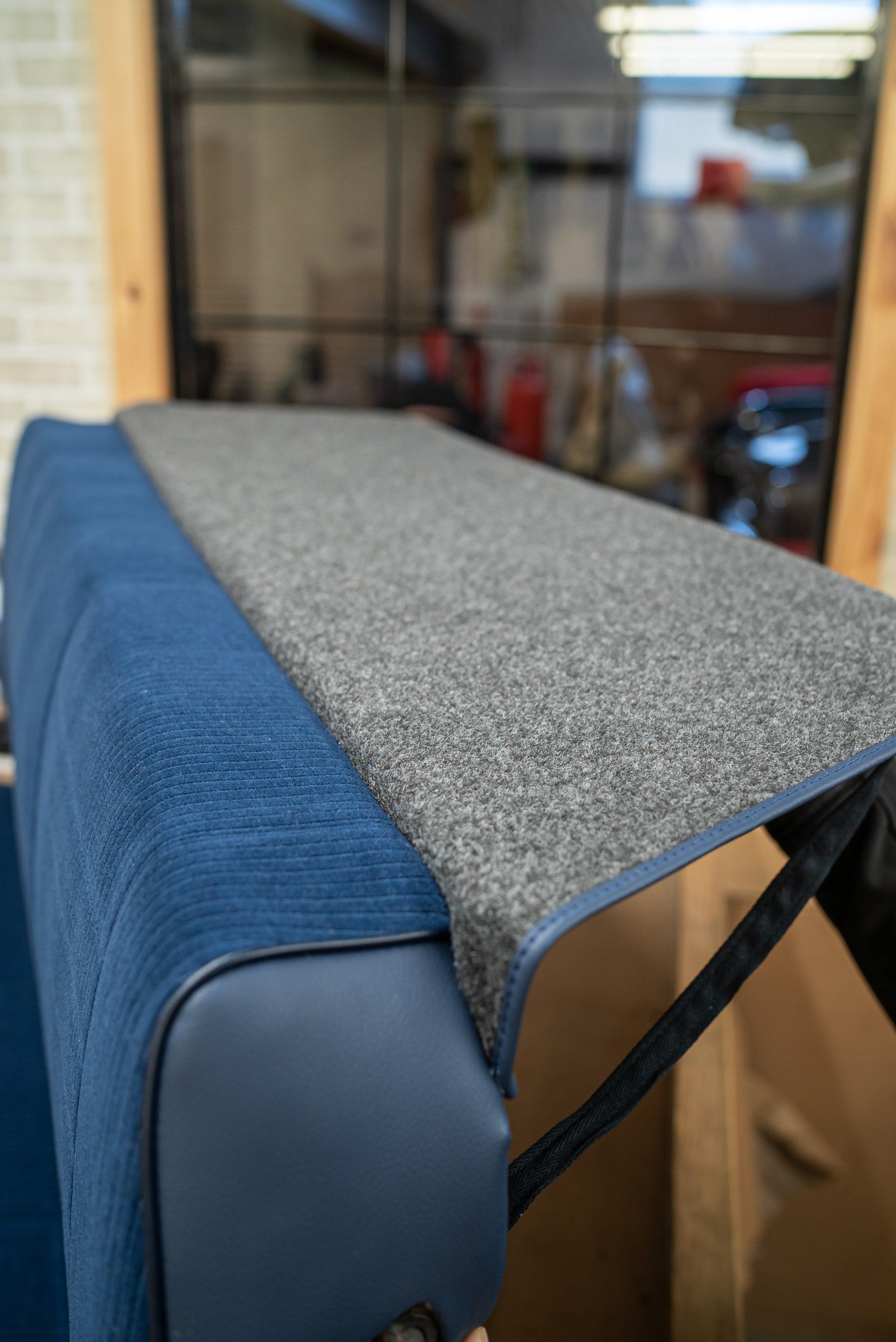 New horse hair pads have been supplied and fitted to the front seat frames to ensure the customer is totally satisfied. As previously mentioned, blue velour has been selected to replace what was and blue vinyl for the borders and piping.