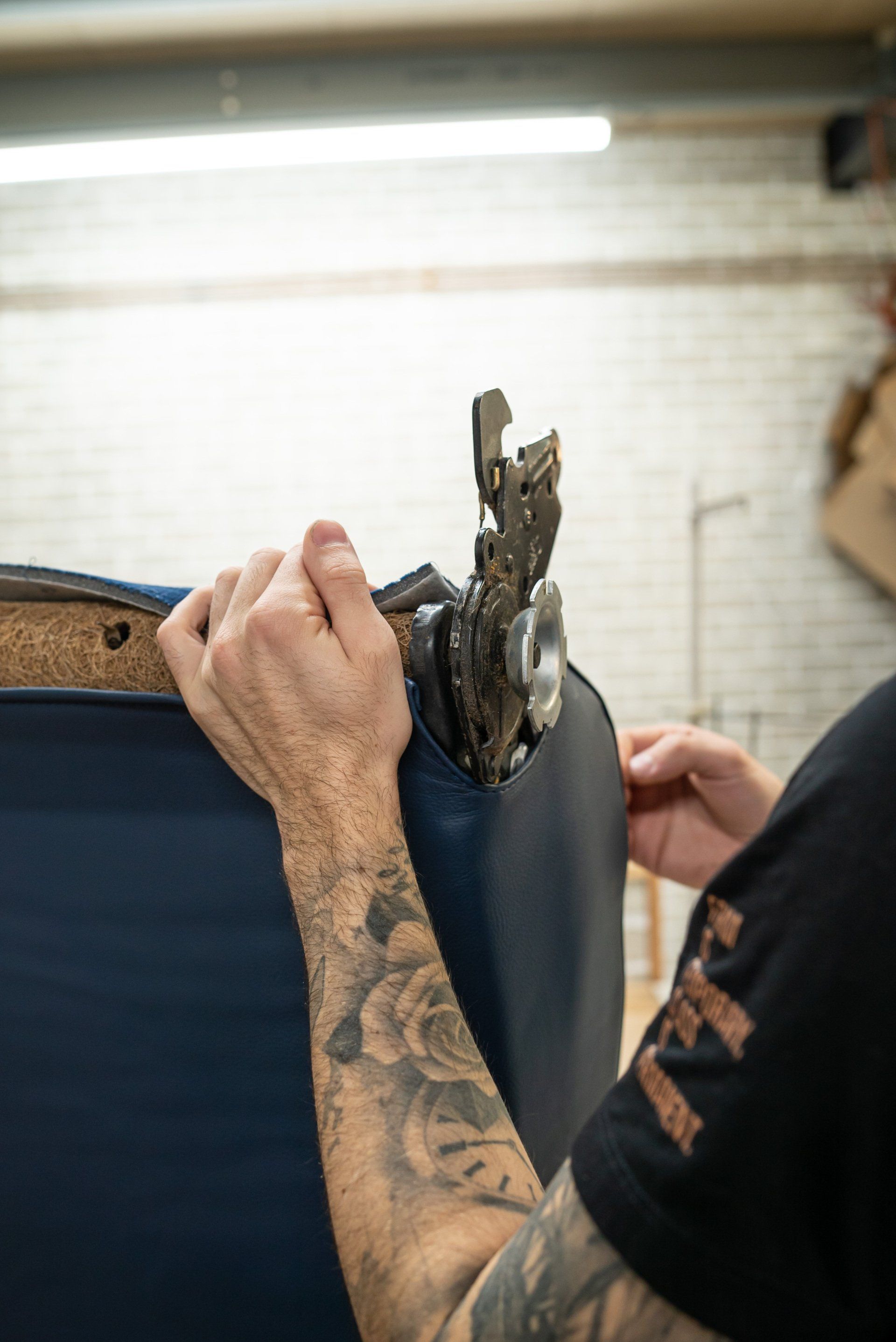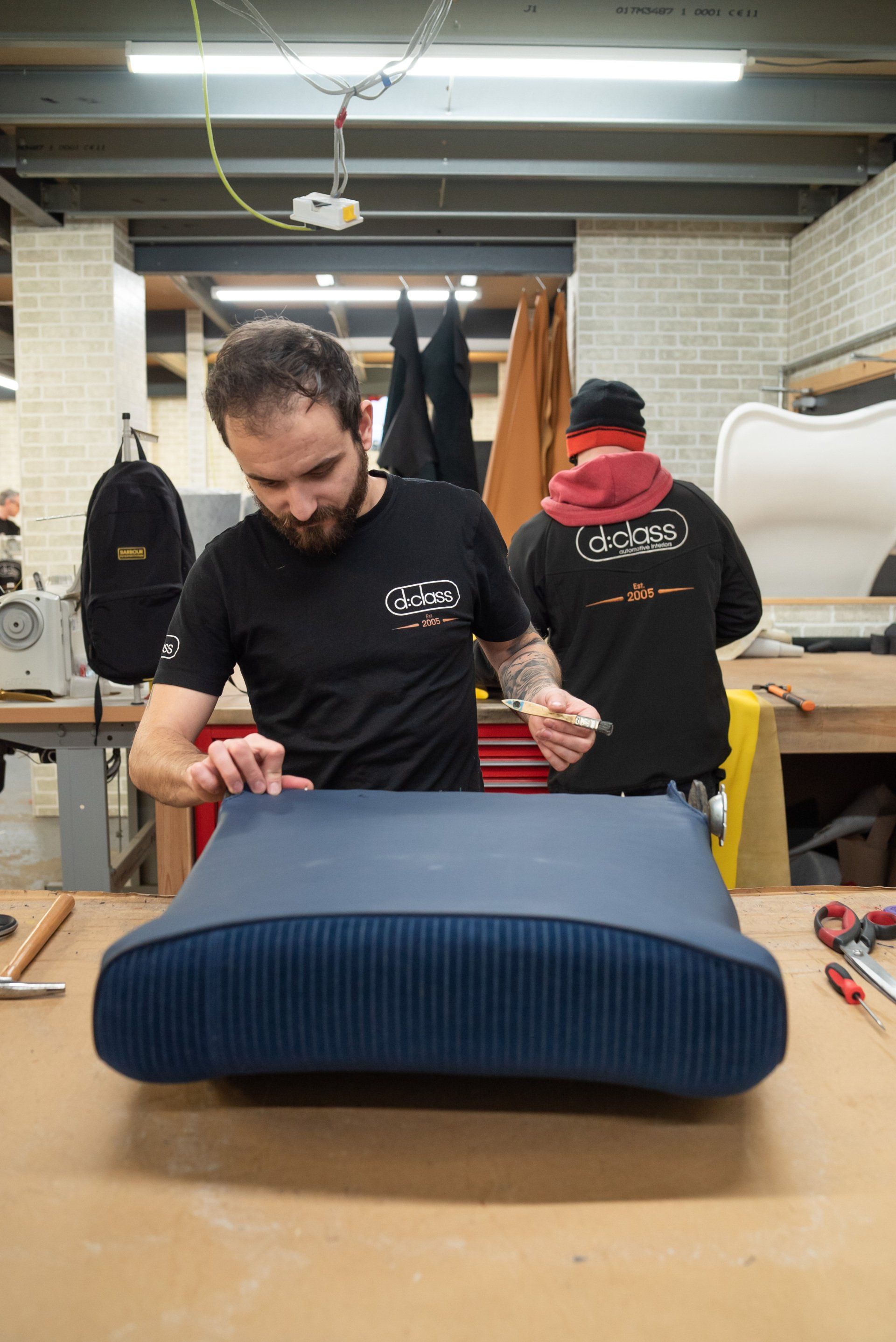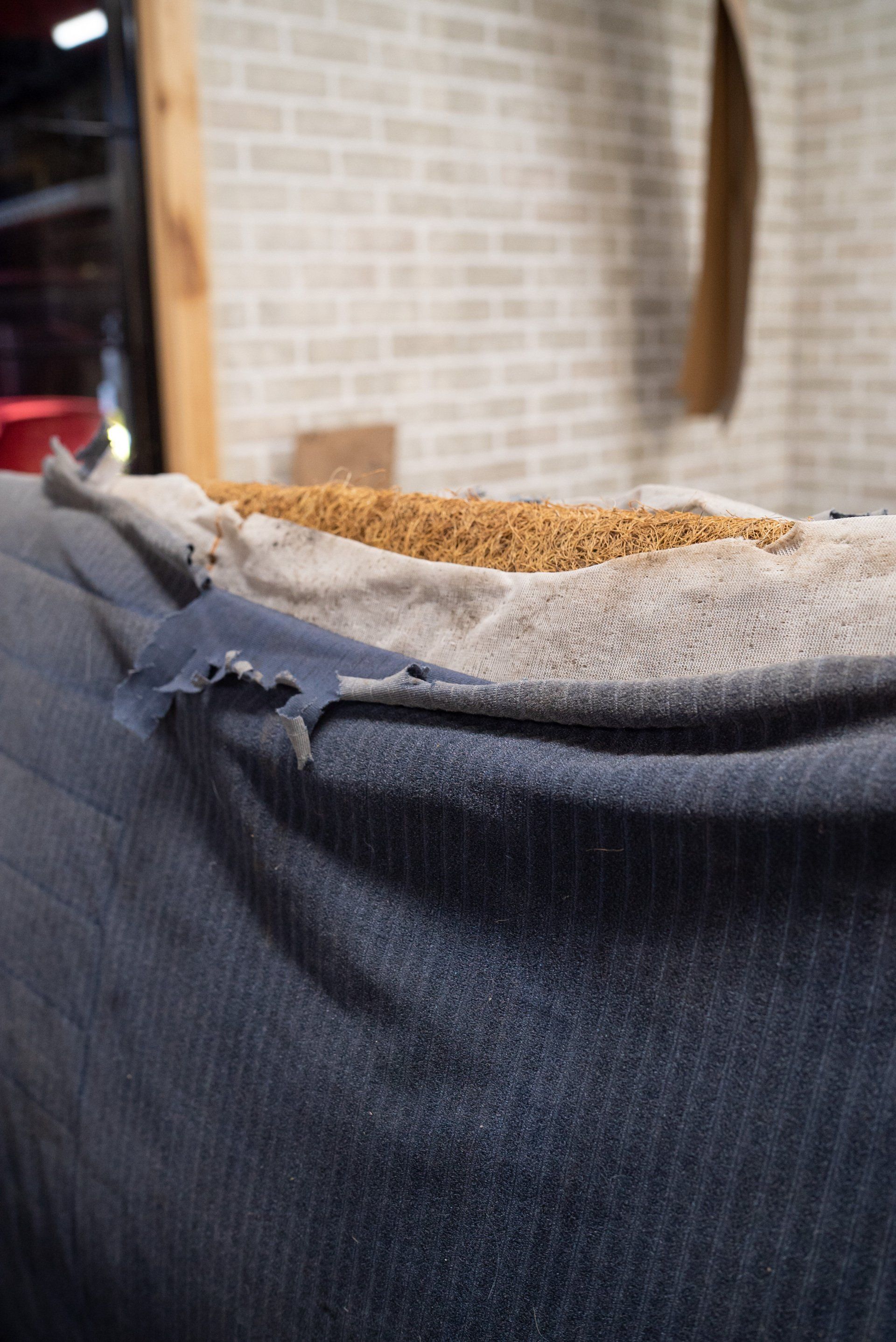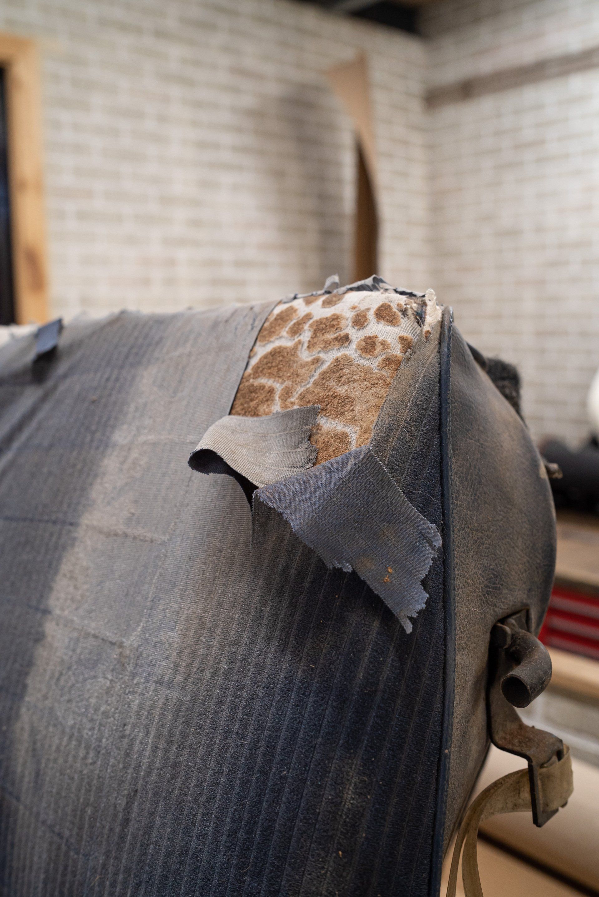 New horse hair pads have been supplied and fitted to the front seat frames to ensure the customer is totally satisfied. As previously mentioned, blue velour has been selected to replace what was and blue vinyl for the borders and piping.